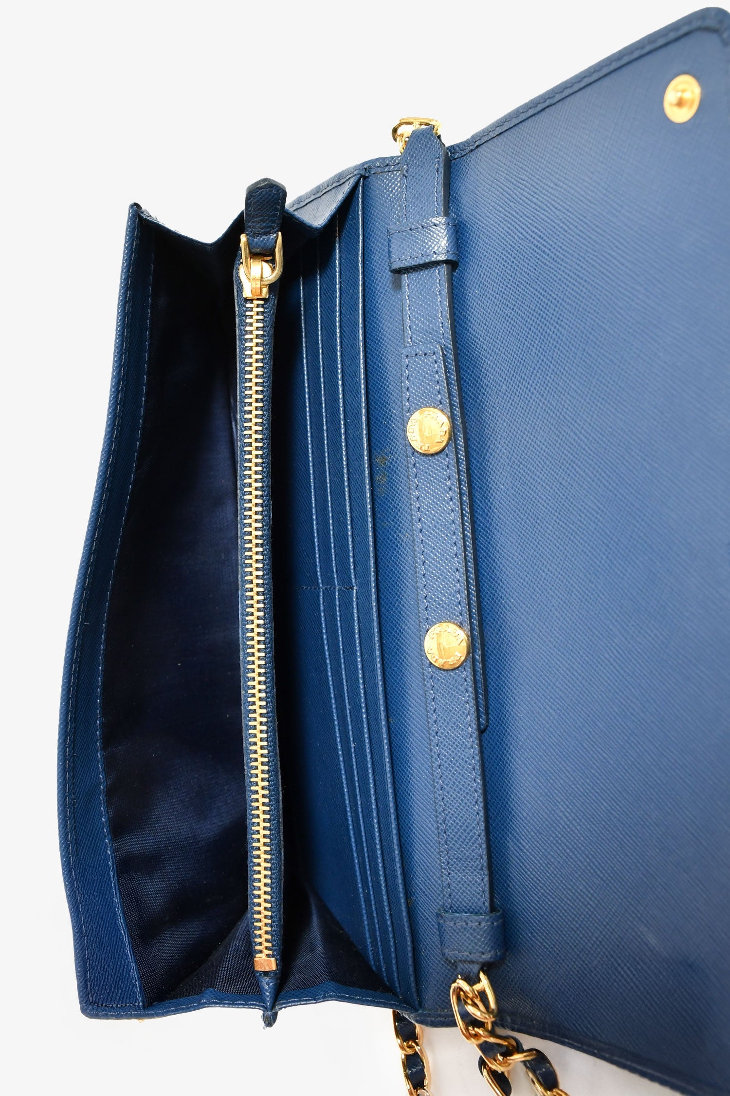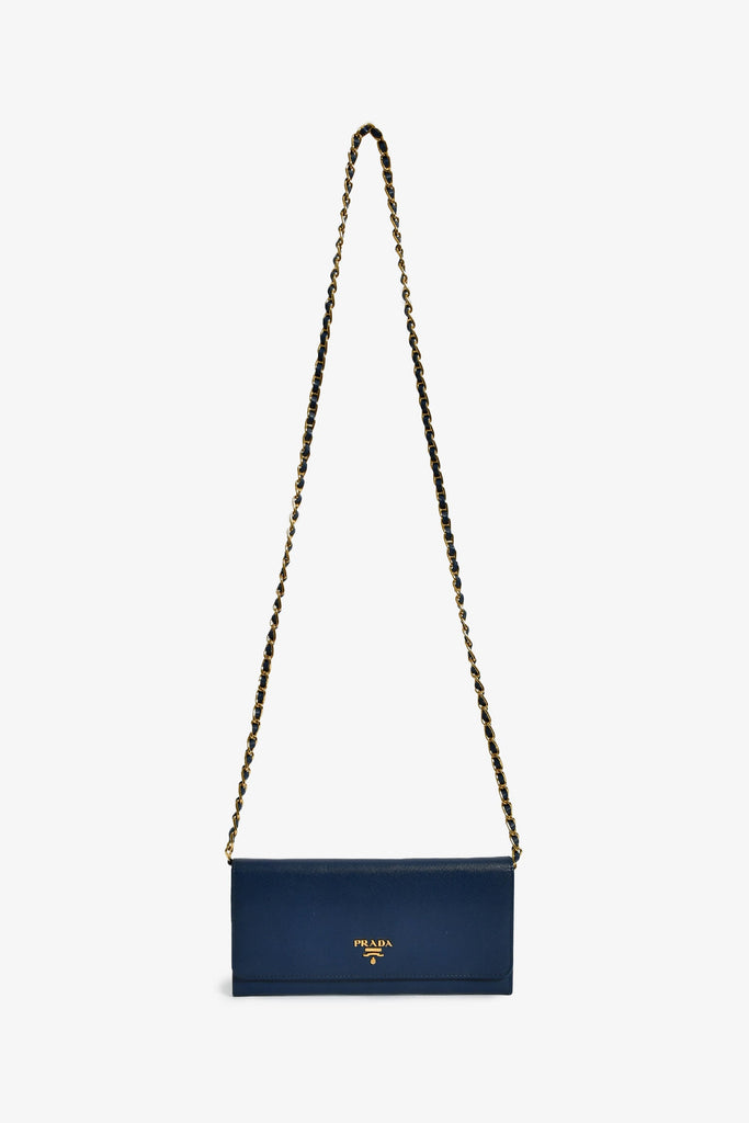 Prada Blue Saffiano Wallet On Chain. Front fold-over flap with snap button closure. 12 compartments: 2 front exterior slip pockets; 6 card slots, 2 cash slots, middle zip pocket, interior wall slip pocket. Detachable strap. Gold-tone hardware. Tonal stitching.