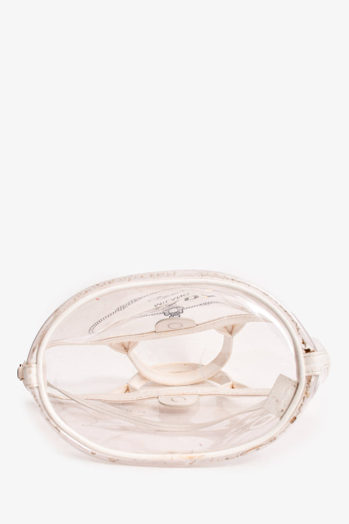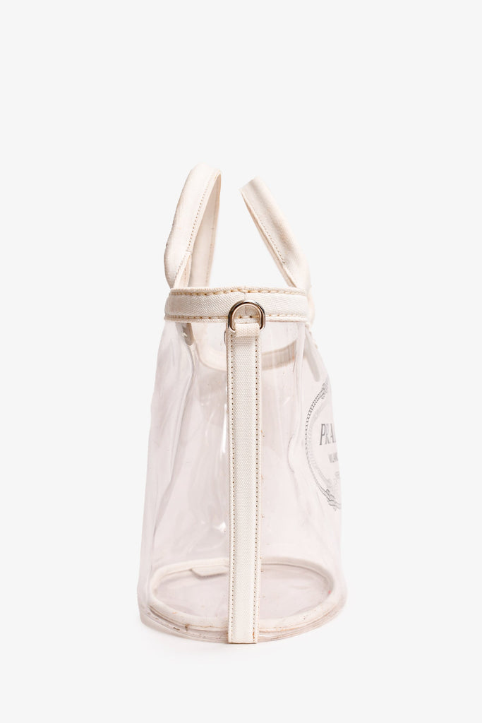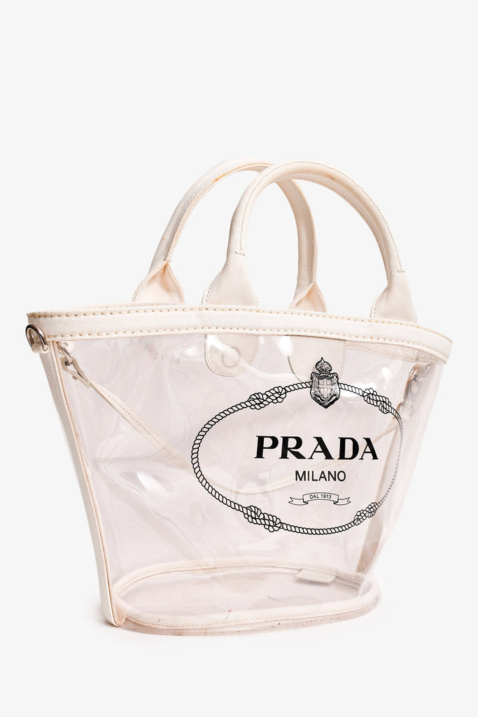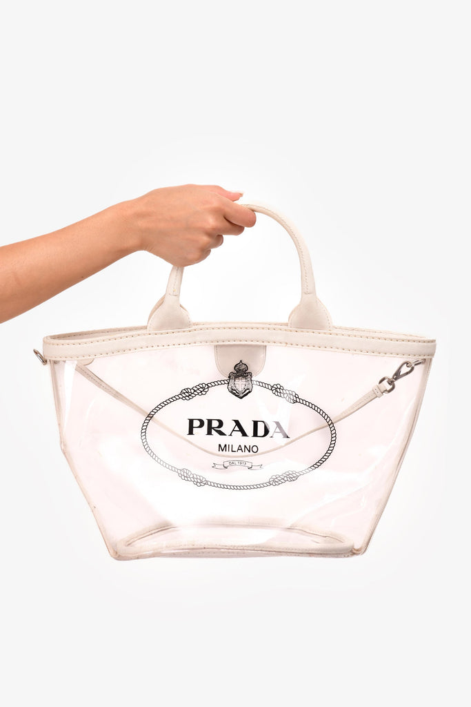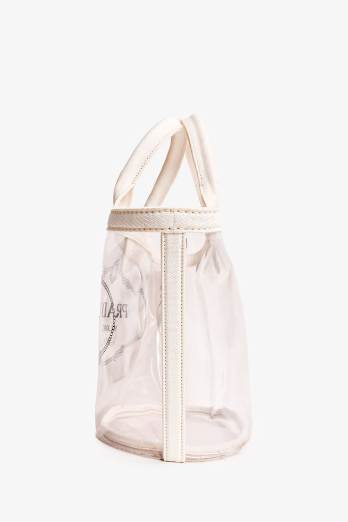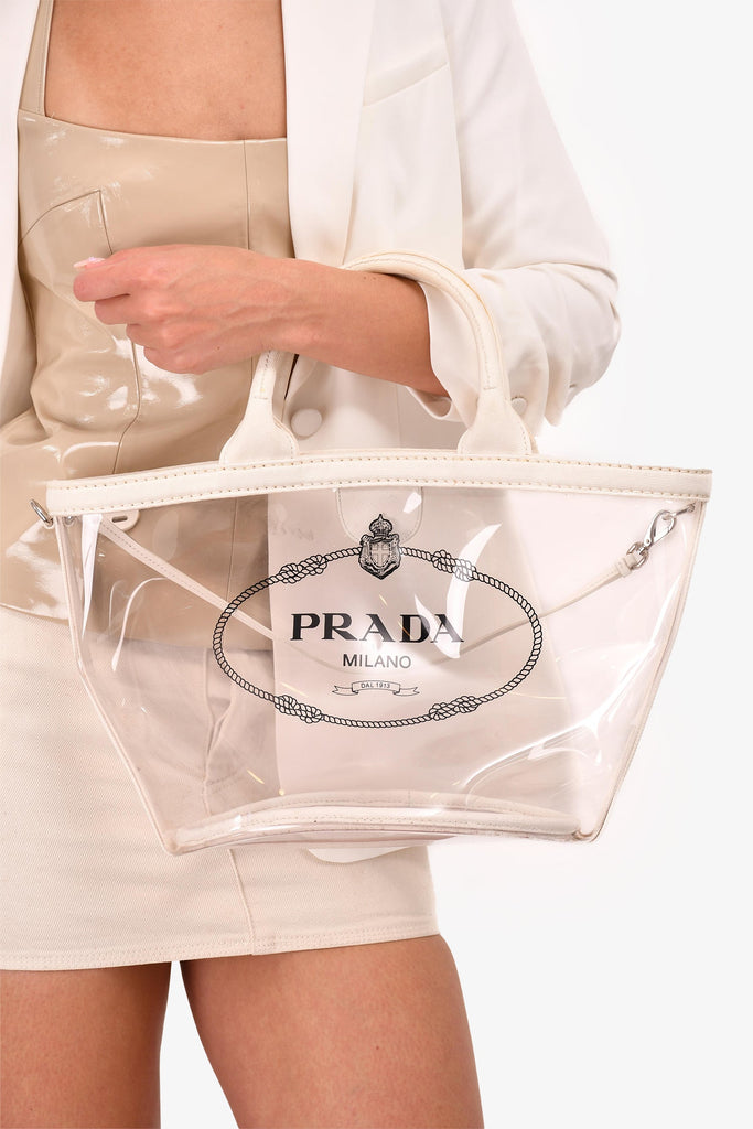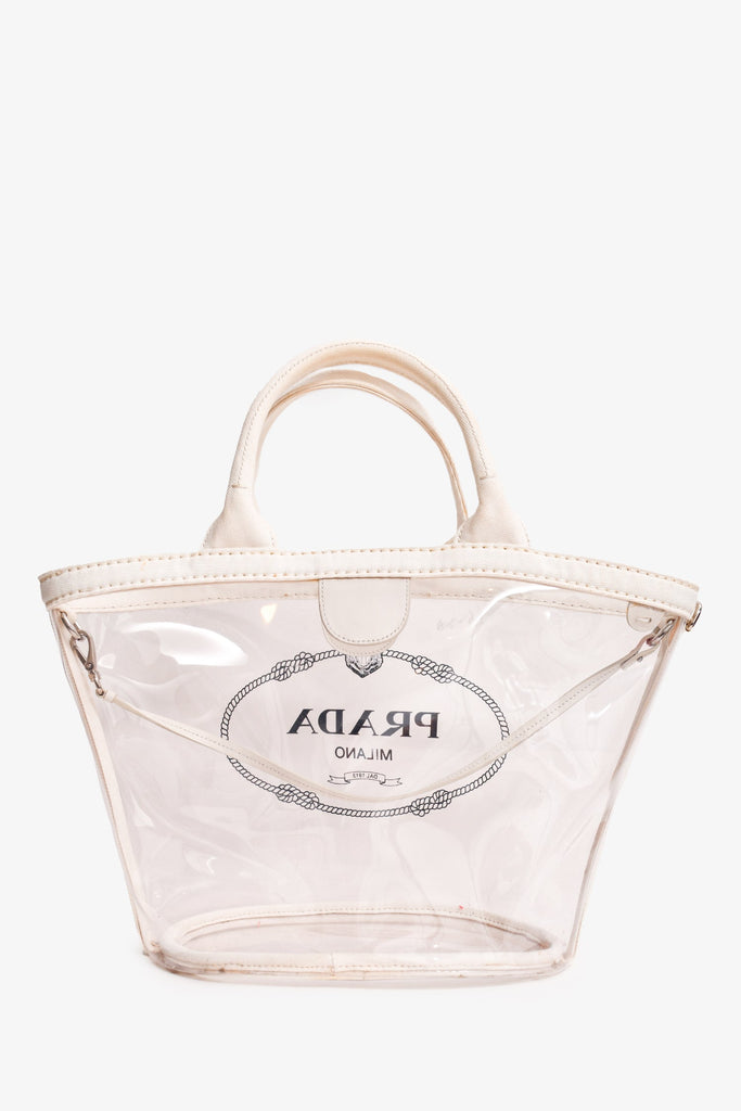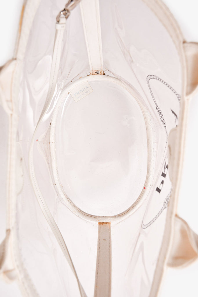 Prada Clear PVC Logo Tote. Dual handles. Top magnetic button closure. Open interior.