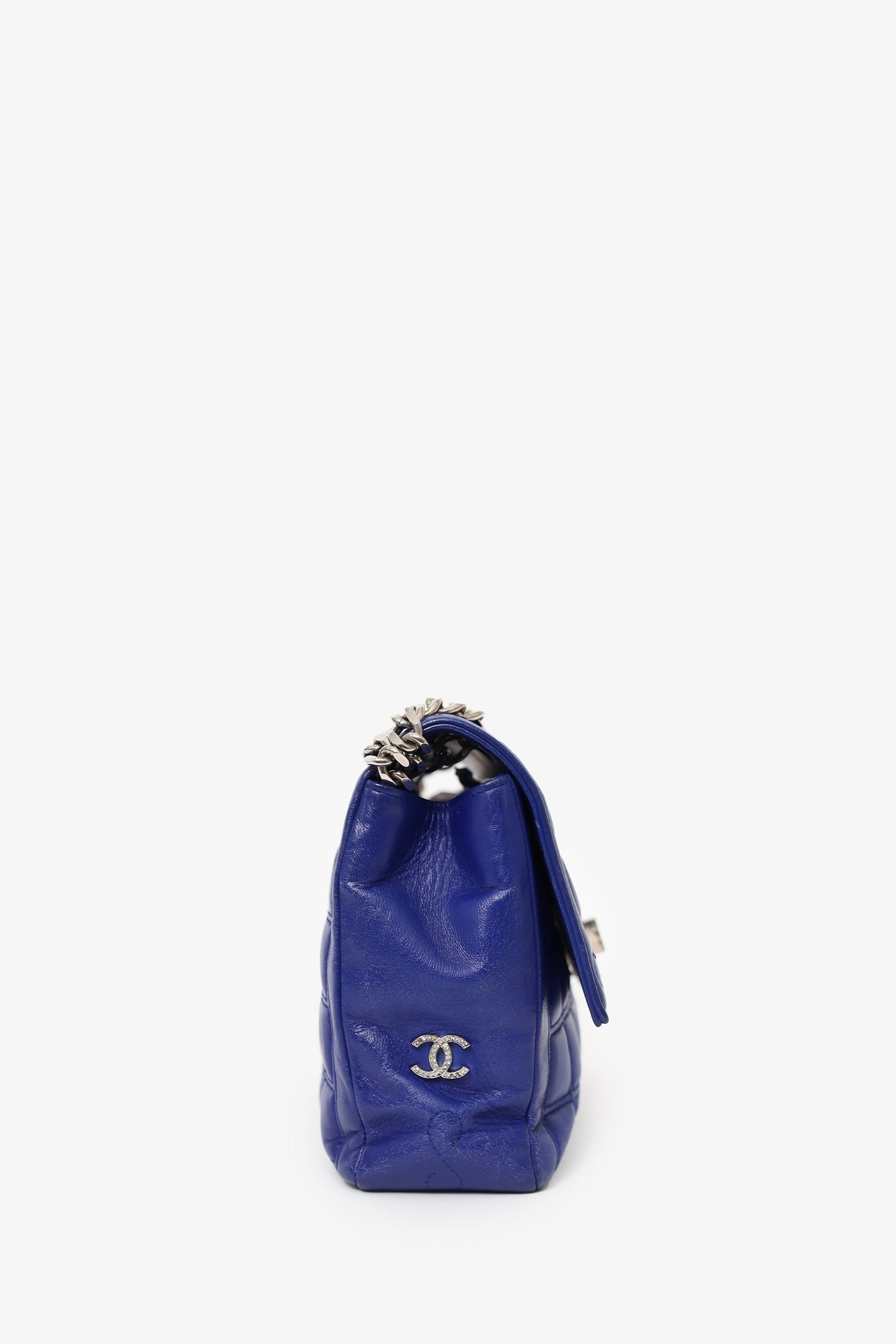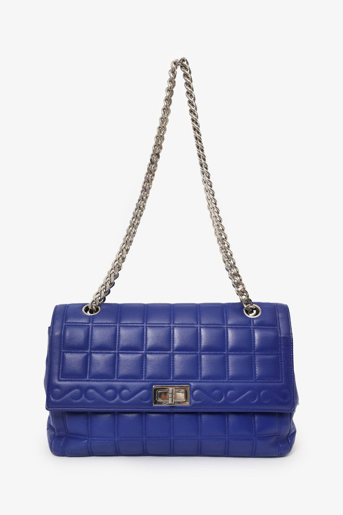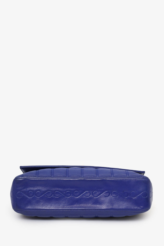 Pre-Loved Chanel™ 2000-02 Blue Chocolate Bar Mademoiselle 255 Reissue Flap Bag. Front fold-over flap with turn-lock closure. Twin chainlink straps that can be pulled into one long strap. Leather-lined interior. 2 interior pockets; 1 slip and 1 zip. Silver-tone hardware. Tonal stitching.