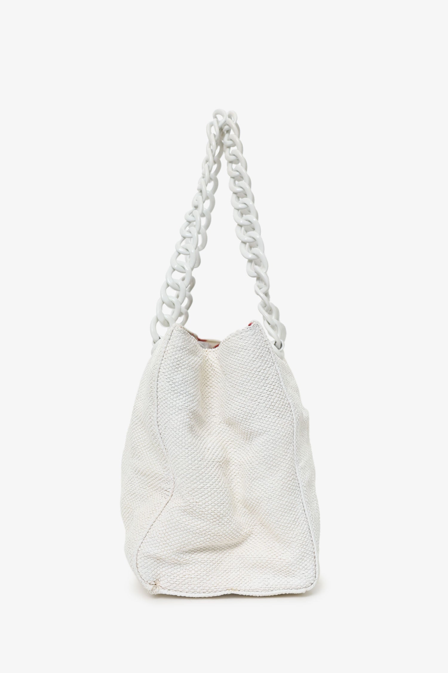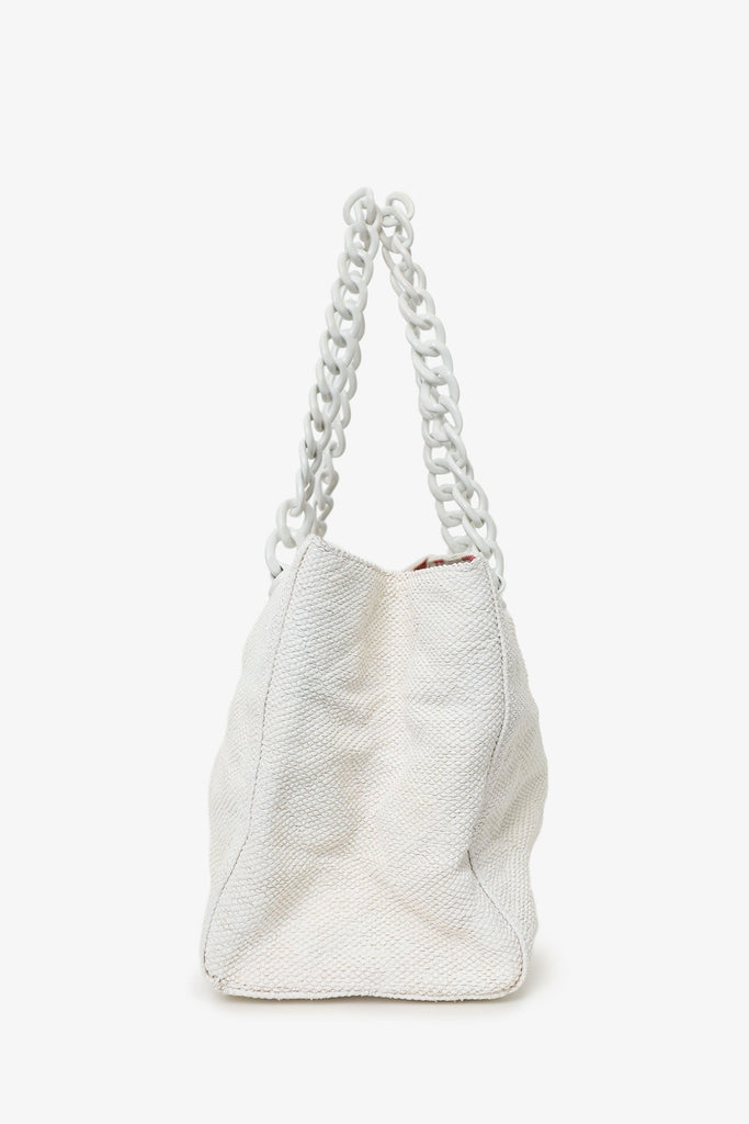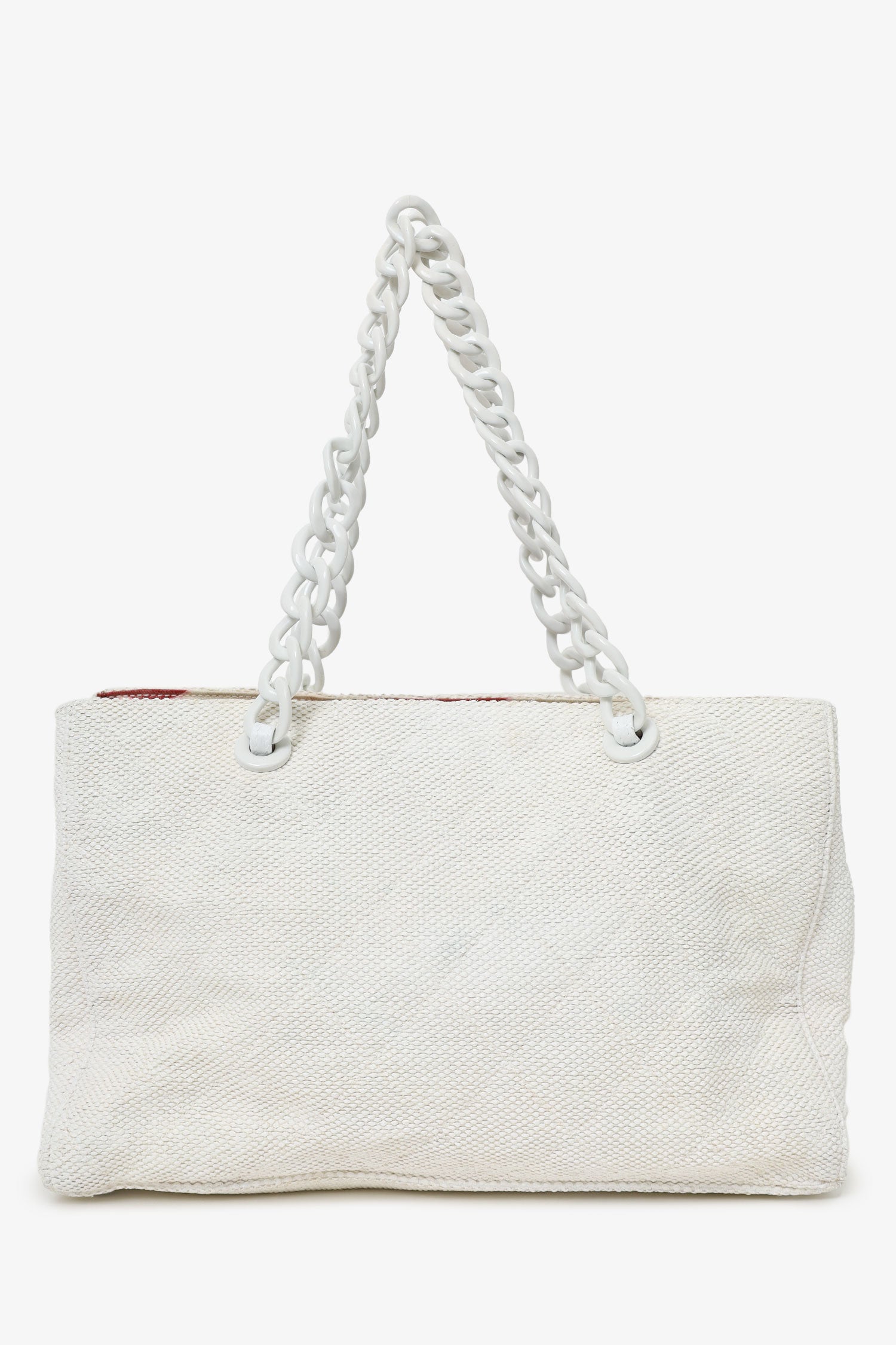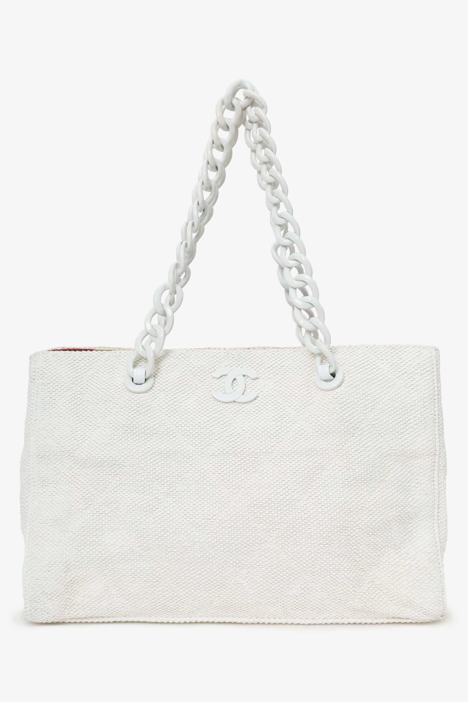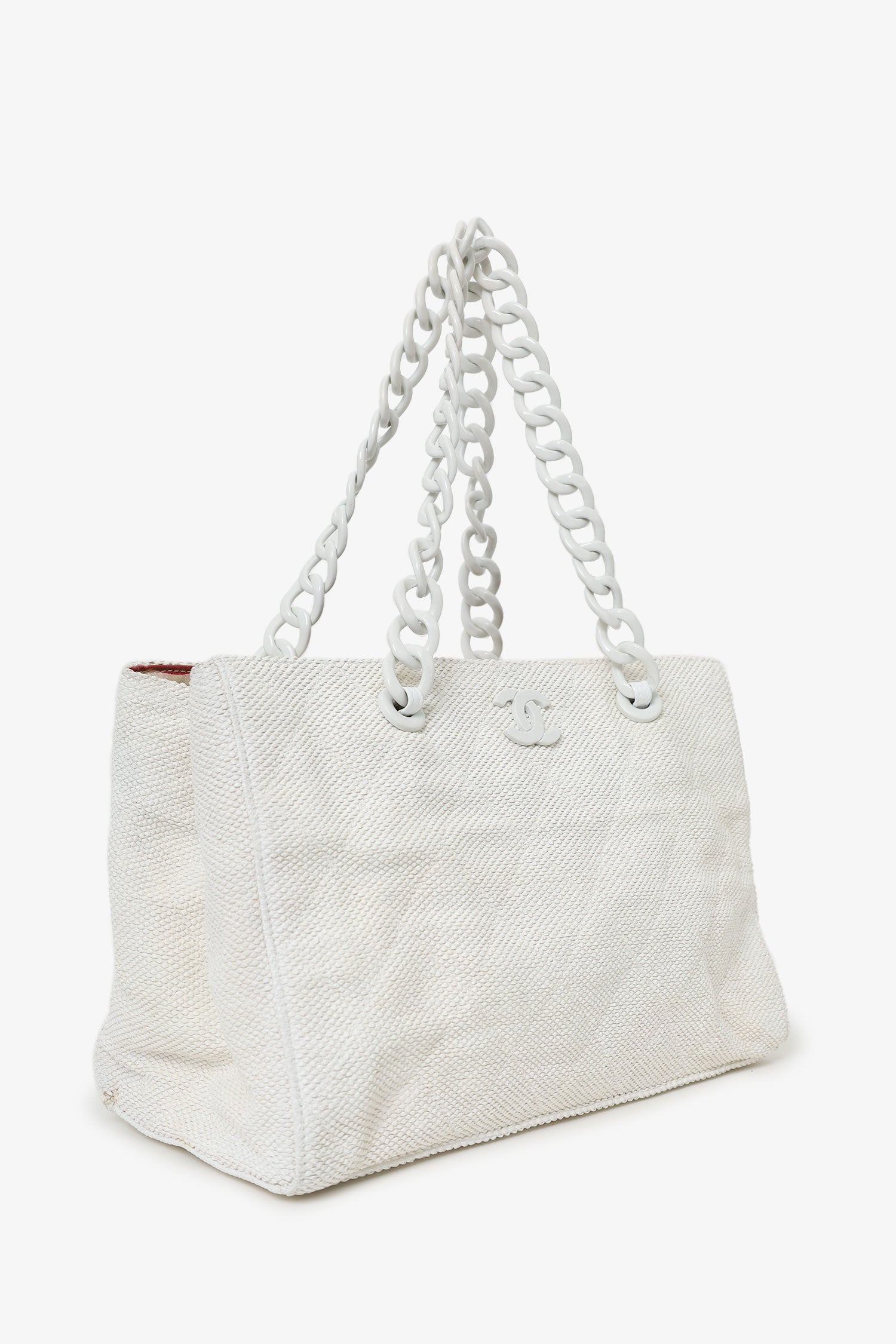 Pre-Loved Chanel™ 2000-02 White Raffia Chain Beach Tote With Pouches. Open top. Plastic chainlink shoulder strap. Quilted exterior. Protective base studs. Fabric lined interior. Single interior zip pocket. Interior snap close phone pouch. Additional removable leather zip pouch. Tonal stitching.