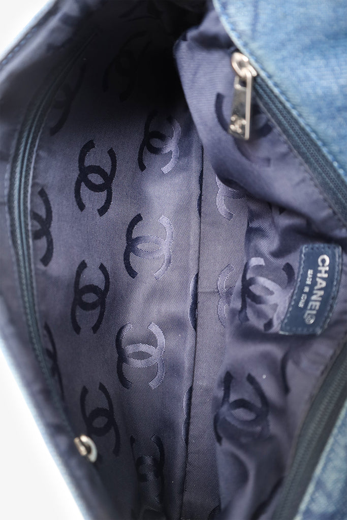 Pre-Loved Chanel™ 2002-03 Blue Denim CC Single Flap Bag. Front fold-over flap with turn-lock closure. Shoulder strap with acrylic hardware. Lined interior. 2 interior zip pockets. Silver-tone hardware. Tonal stitching.