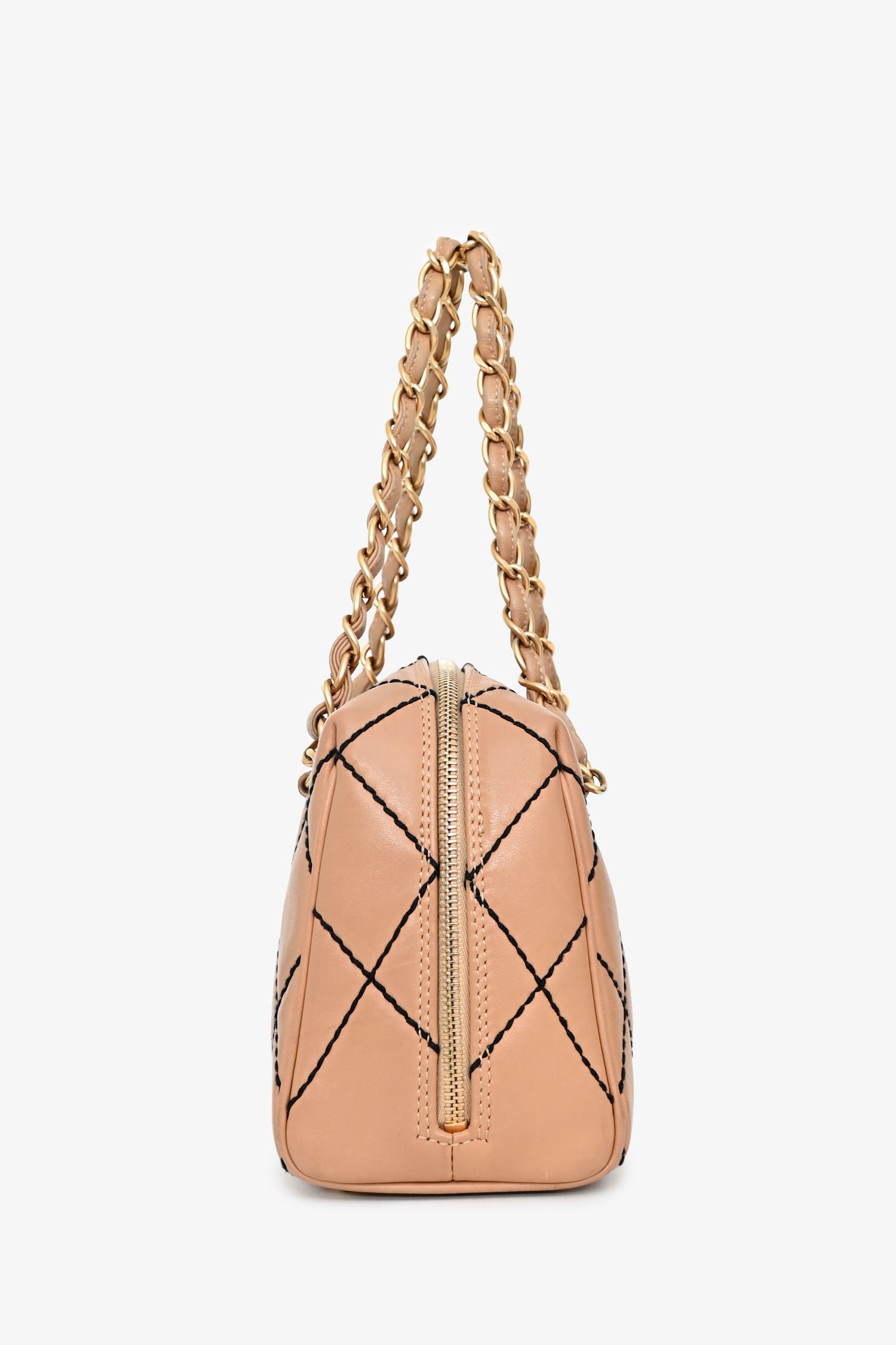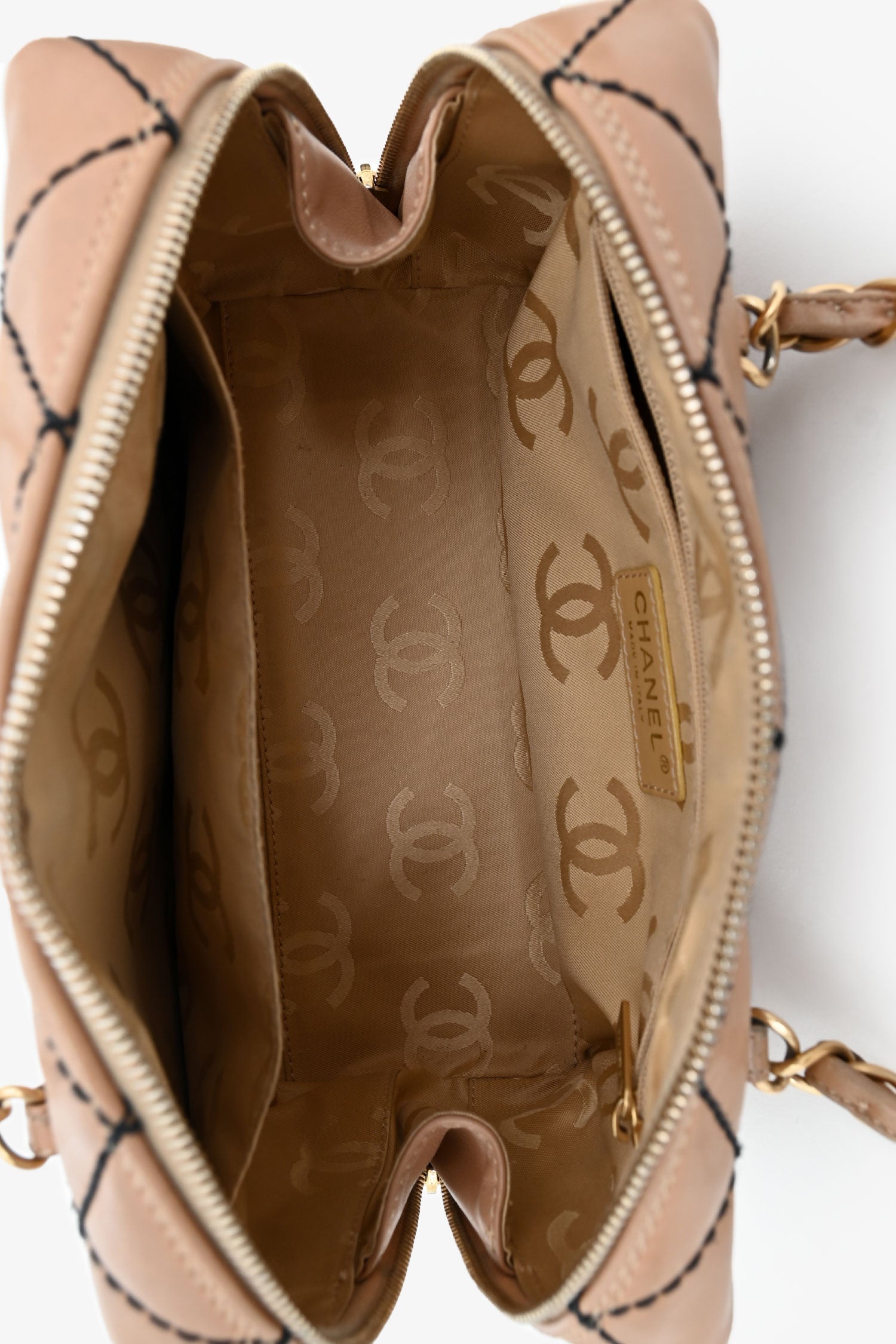 Pre-Loved Chanel™ 2003/2004 Cream Leather Wild Stitch Surpique Bowler Bag. Dual chain handles. Top zip closure. Protective base studs. Lined interior. 2 interior wall pockets; 1 slip and 1 with zip closure. Gold-tone hardware. Tonal stitching.