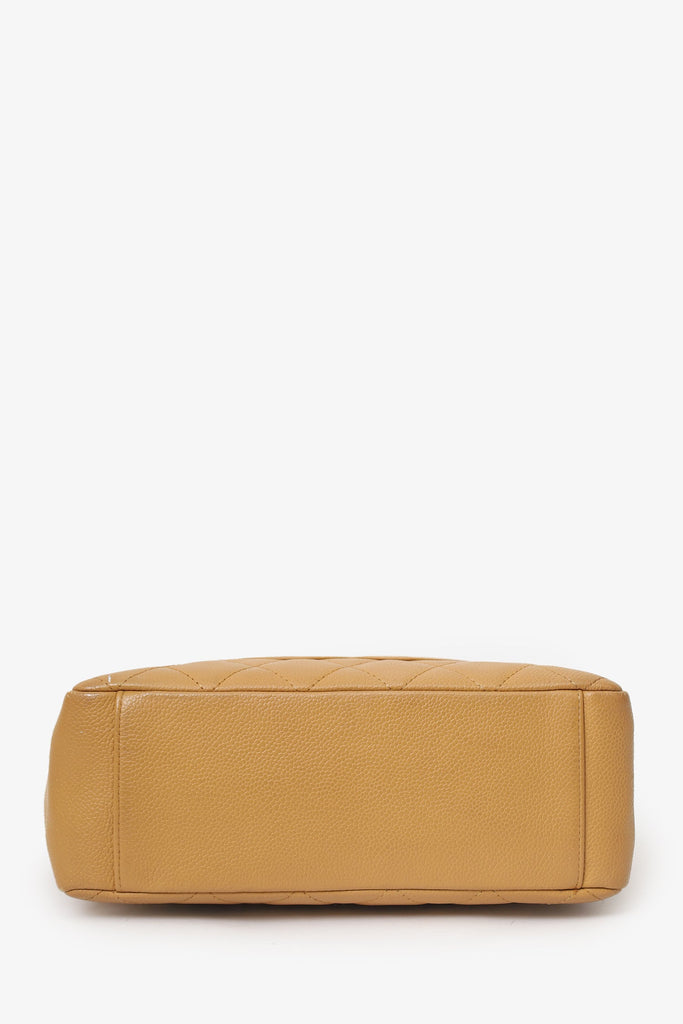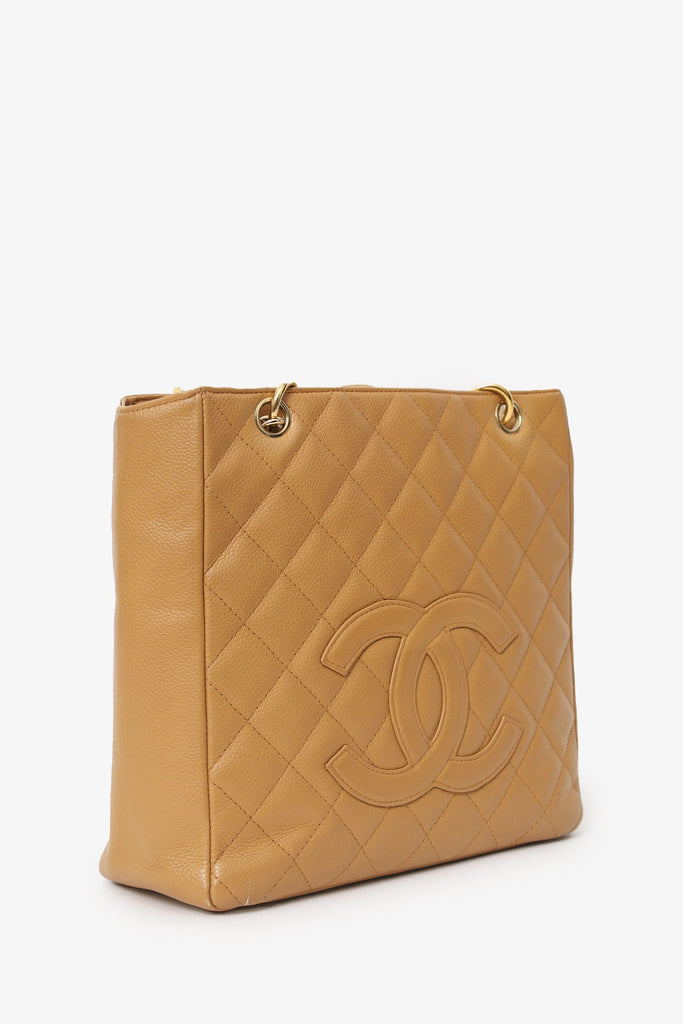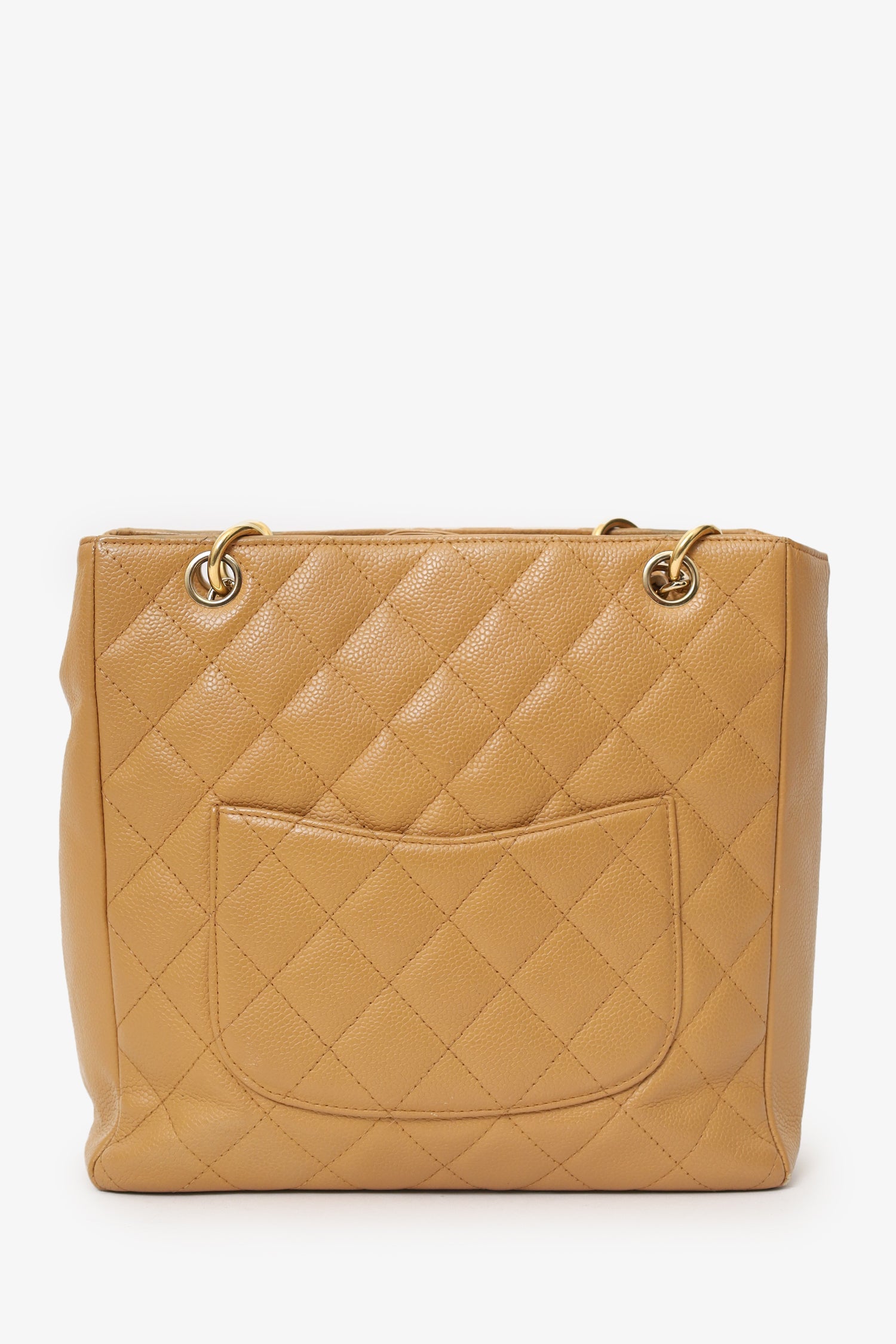 Pre-Loved Chanel™ 2004-05 Beige Caviar Leather Petit Shopping Tote. Top interior magnetic closure. Twin chainlink/leather shoulder straps. Single rear exterior slip pocket. Lined interior. 2 interior pockets; 1 zip and 1 slip. Includes unbranded felt insert. Gold-tone hardware. Tonal stitching.