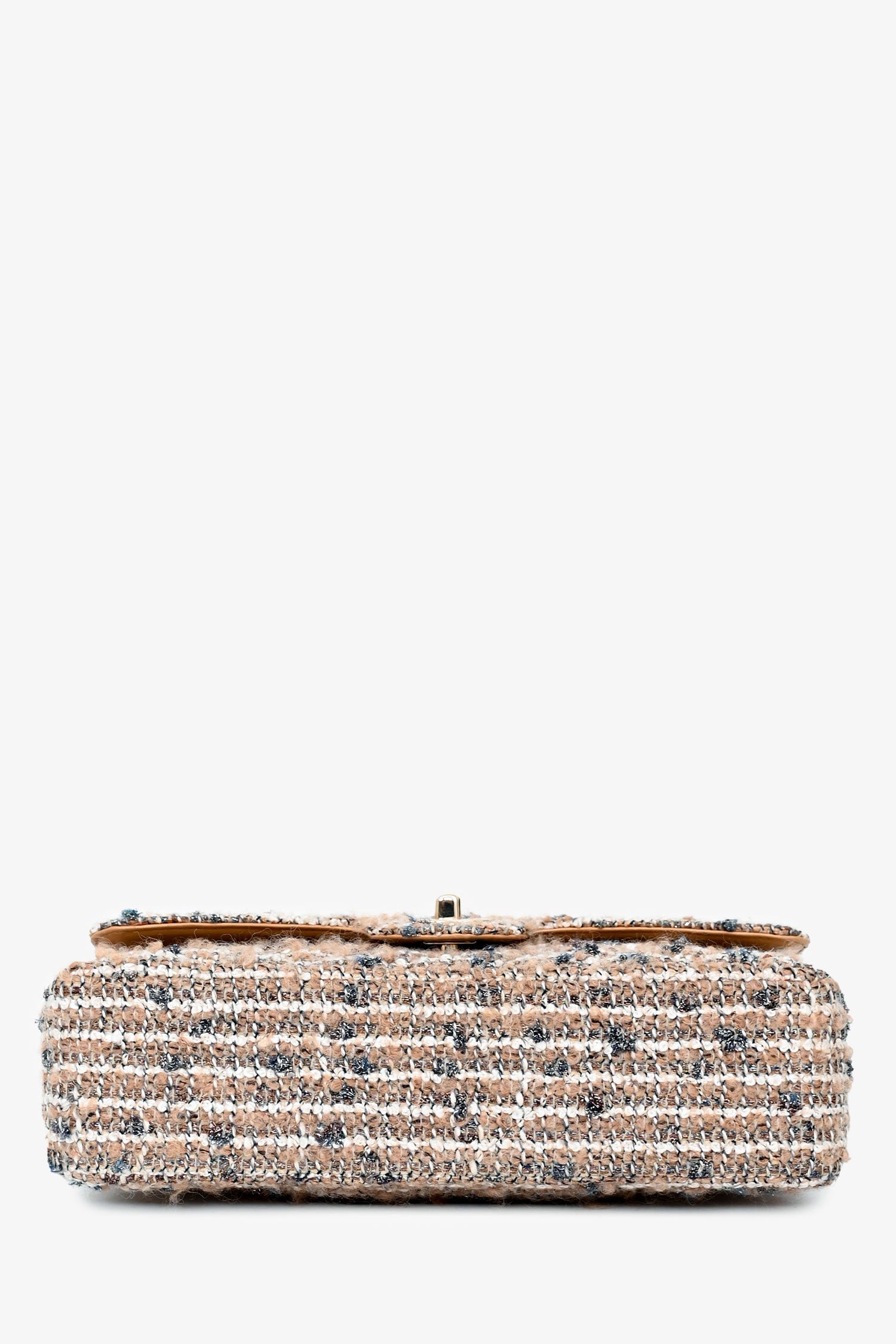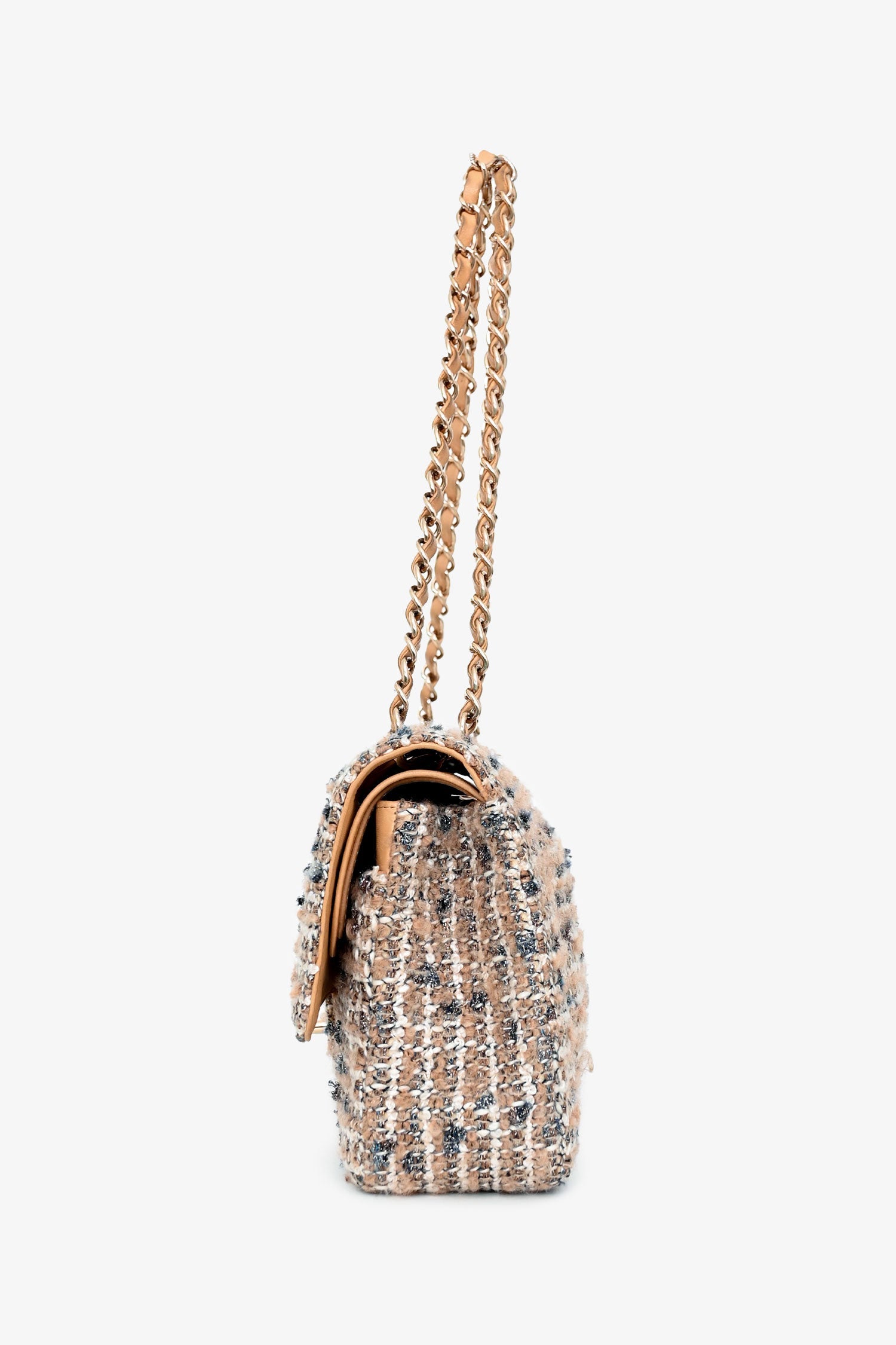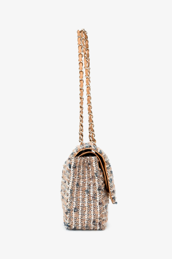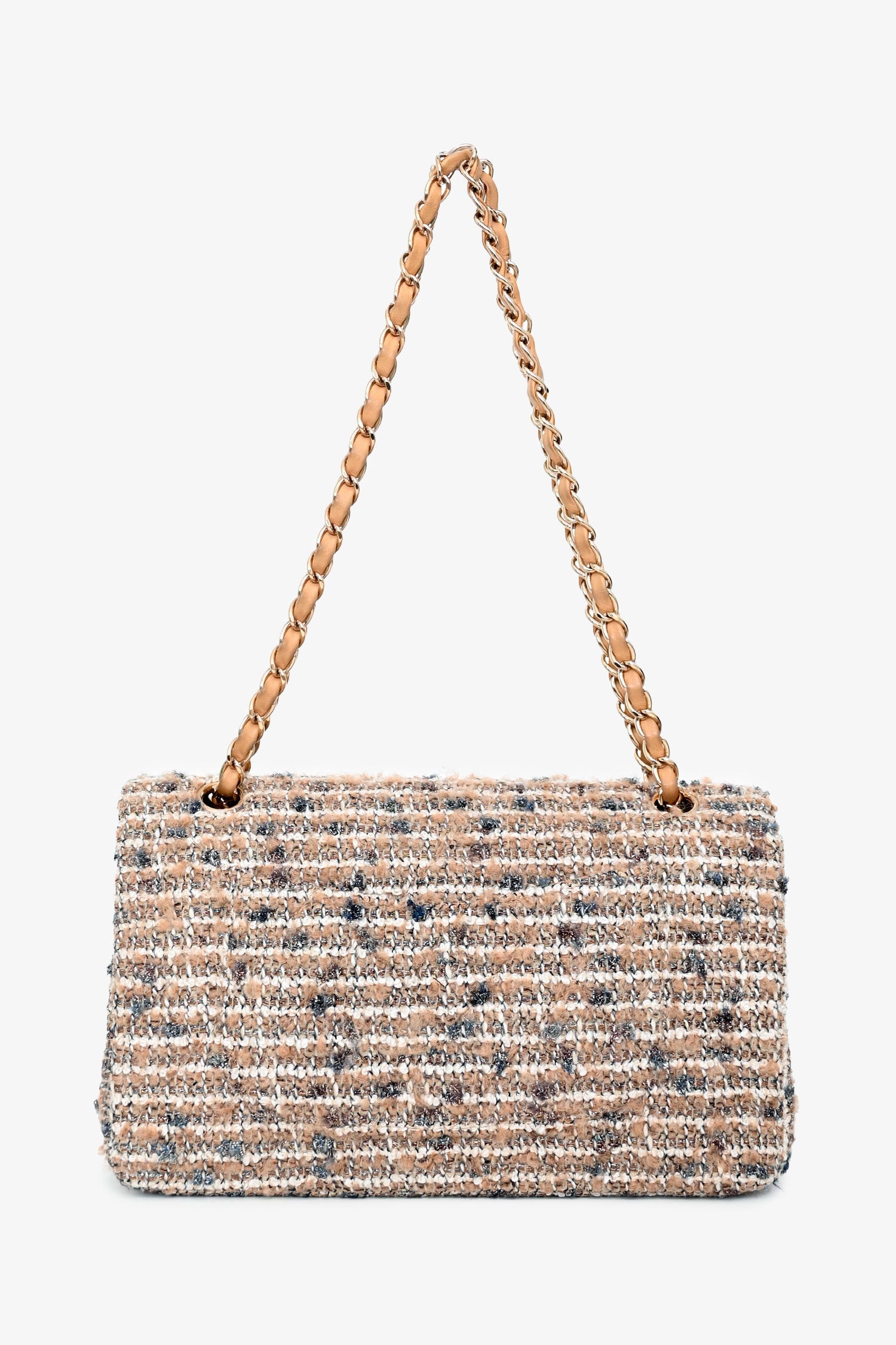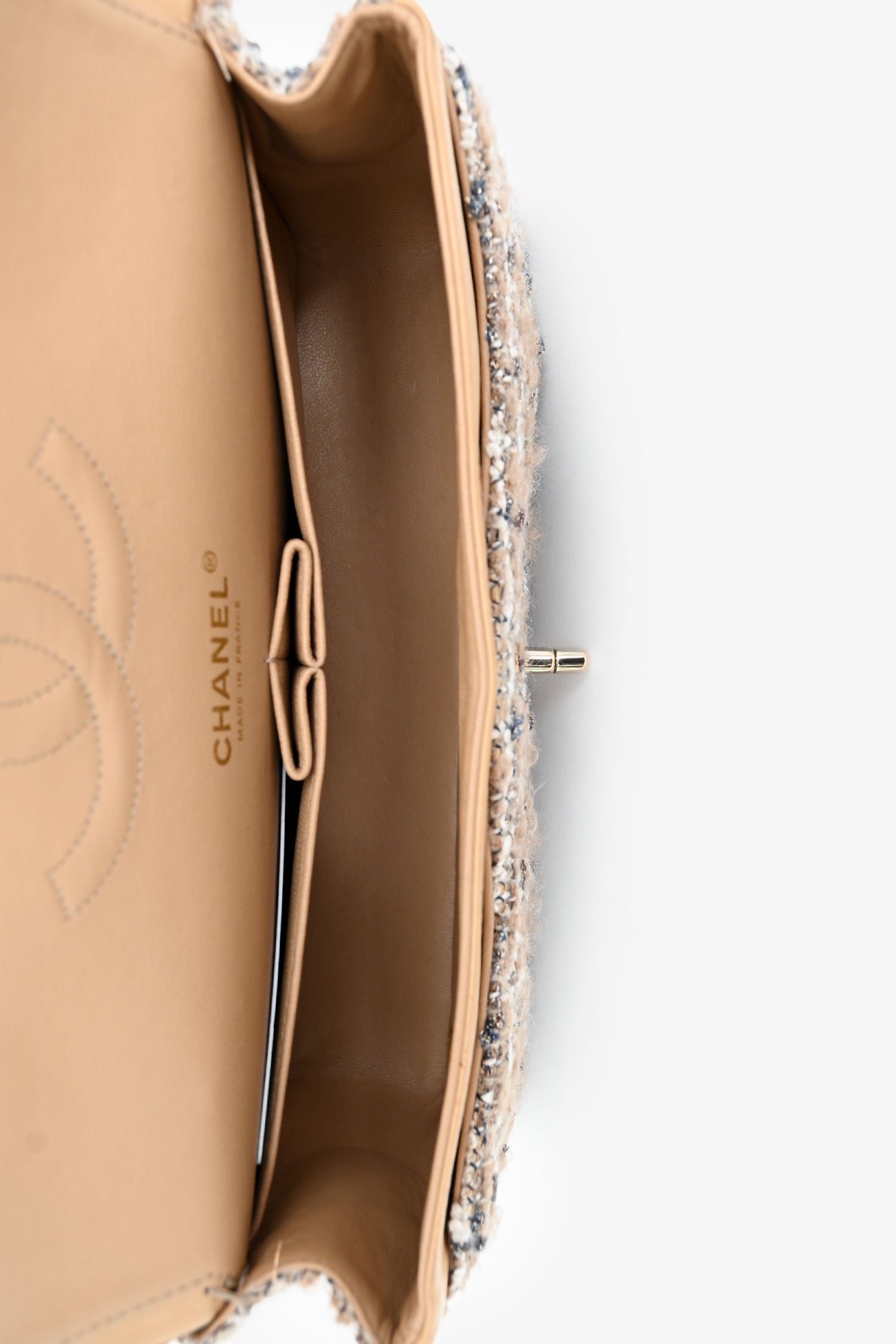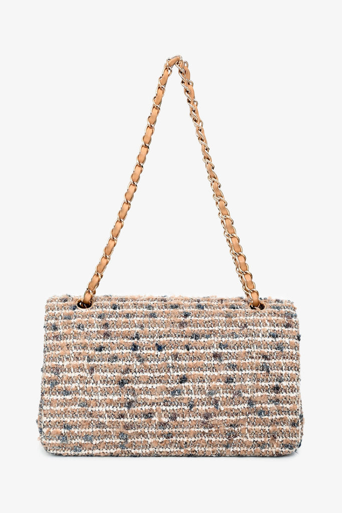 Pre-Loved Chanel™ 2005/2006 Cream Tweed Medium Double Flap. Front flap with signature CC turn-lock closure. Leather-threaded chain shoulder strap. 1 exterior back slip pocket; 1 interior zip pocket; 2 interior slip pockets; 1 interior flap pocket. Leather lining. Gold-tone hardware. Tonal stitching.