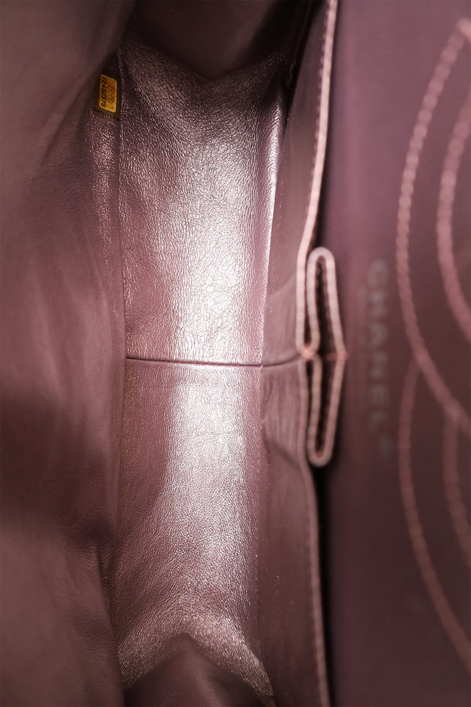 Pre-Loved Chanel™ 2008-09 Brown Metallic Aged Calfskin Quilted 2.55 Reissue Shoulder Bag. Front fold-over flap with turn-lock closure. Chainlink shoulder strap. Rear slip pocket. Interior snap button-up compartment with 7 pockets; 5 slip, 1 lipstick, and 1 zip. Palladium-tone hardware. Tonal stitching.