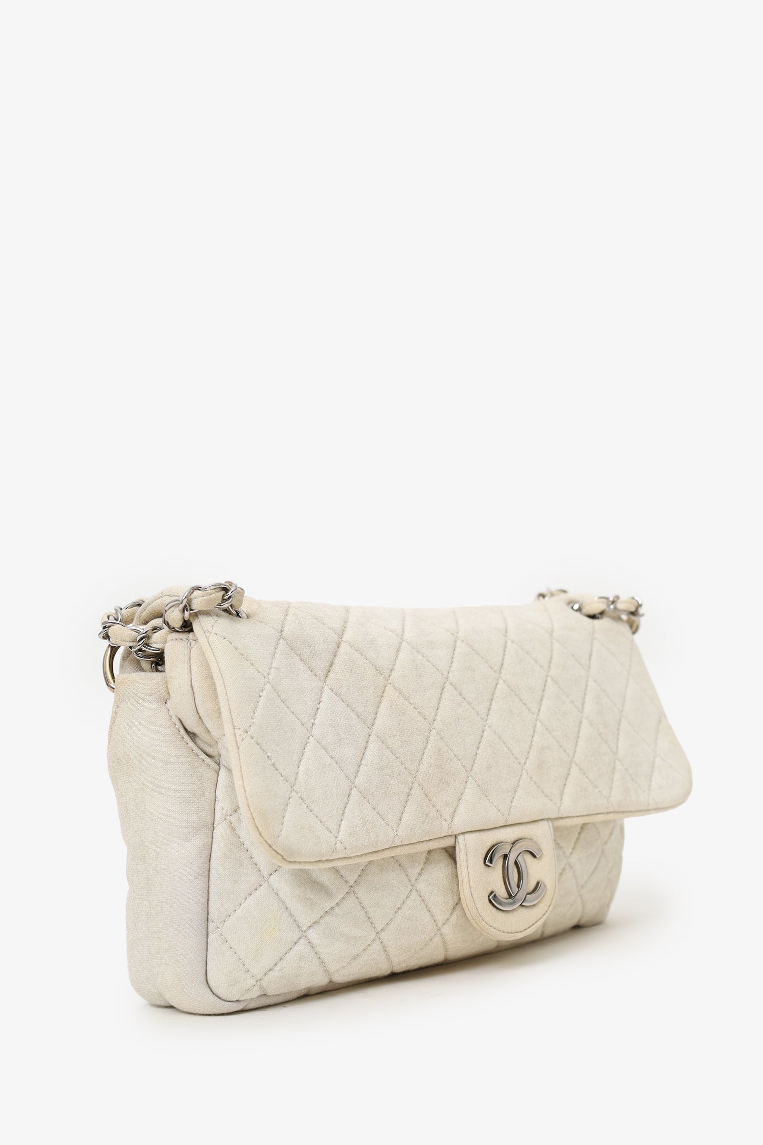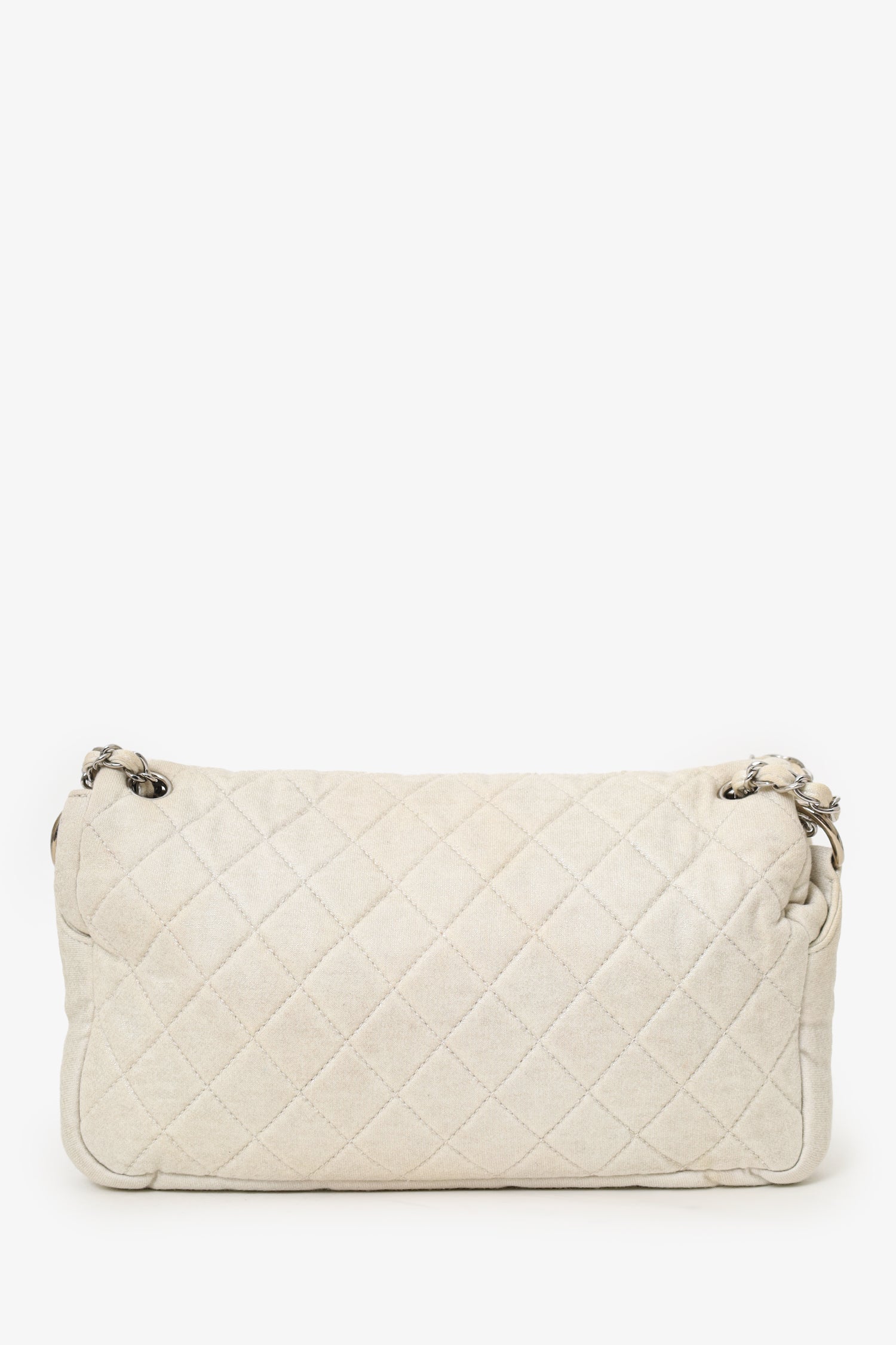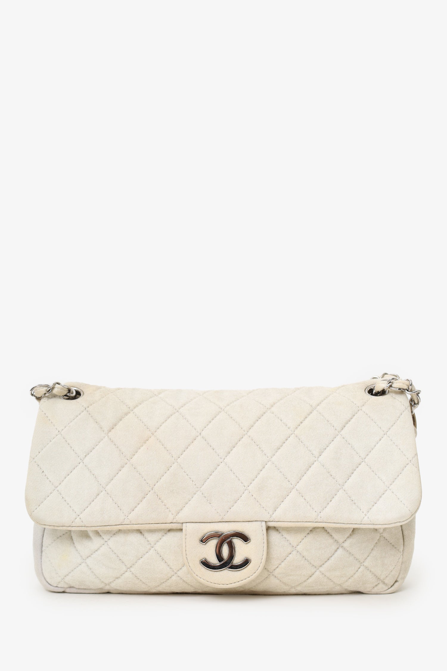 Pre-Loved Chanel™ 2008-09 White/gold Quilted Jersey Cc Flap Bag. Front fold-over flap with magnetic closure. Dual chain-link shoulder straps that can be turned into one crossbody strap. Fabric-lined interior. Single rear wall zip pocket. Silver-tone hardware. Tonal stitching.