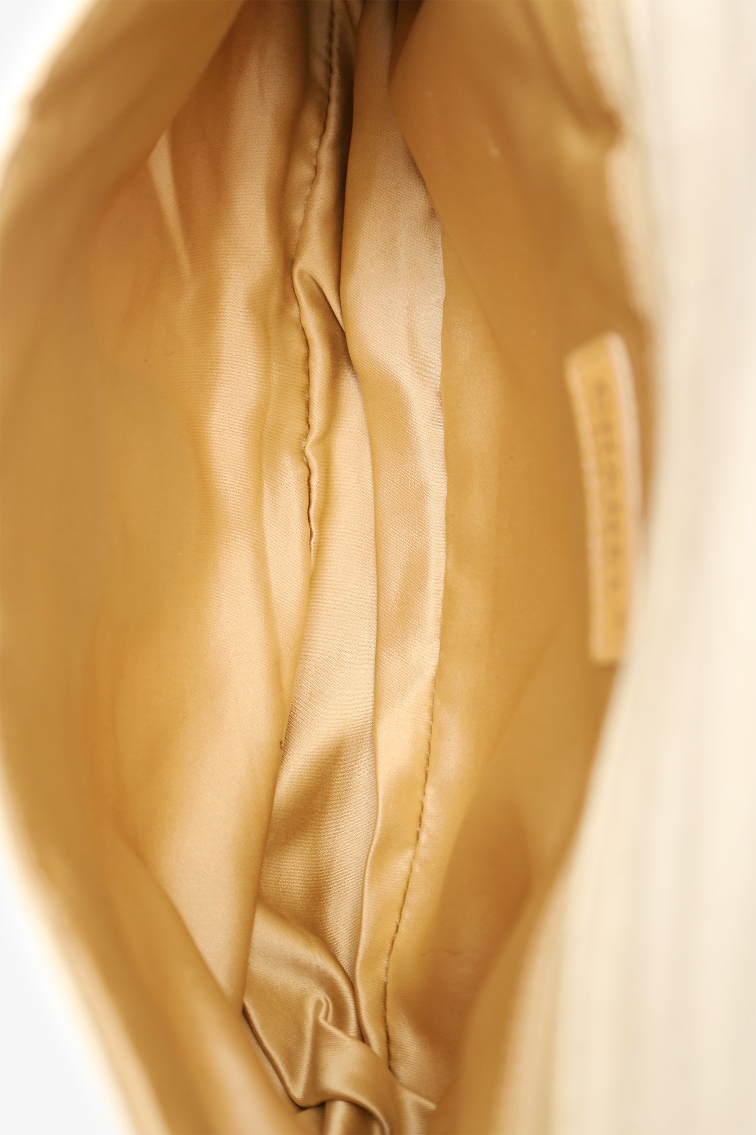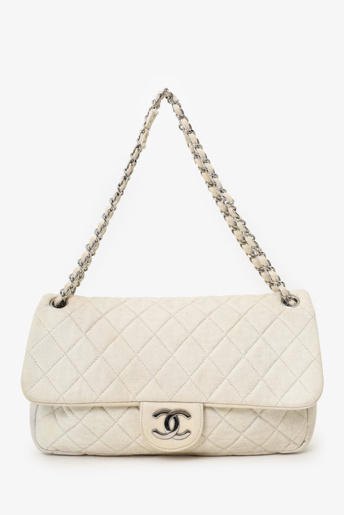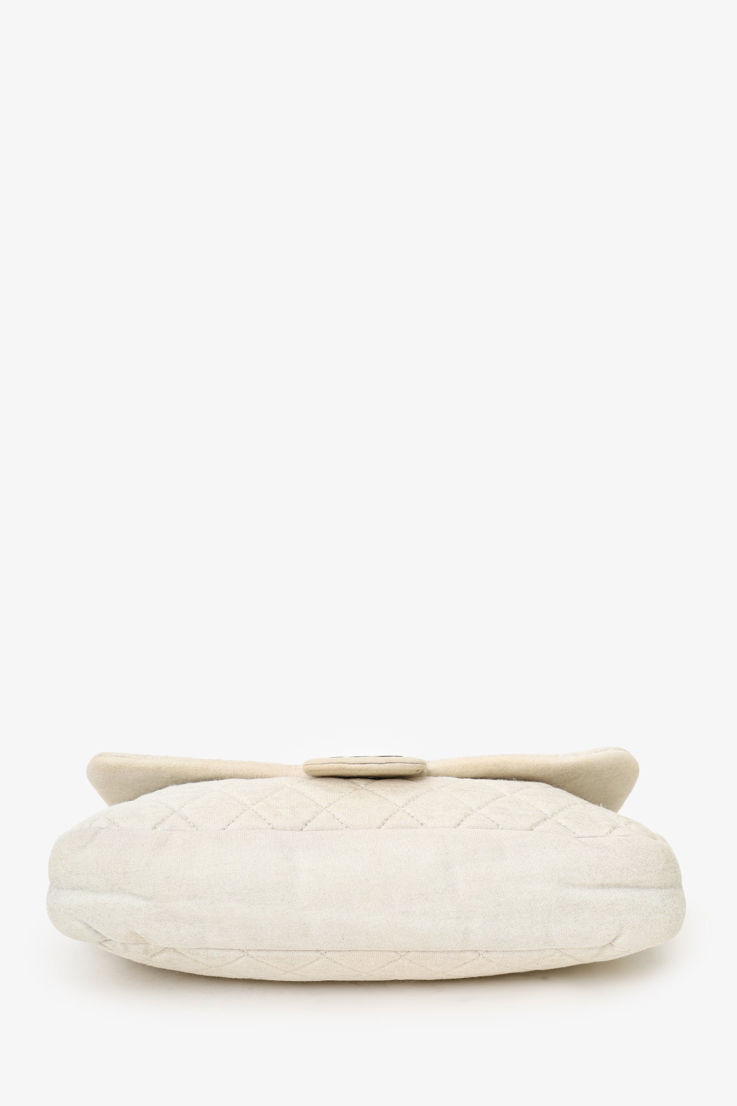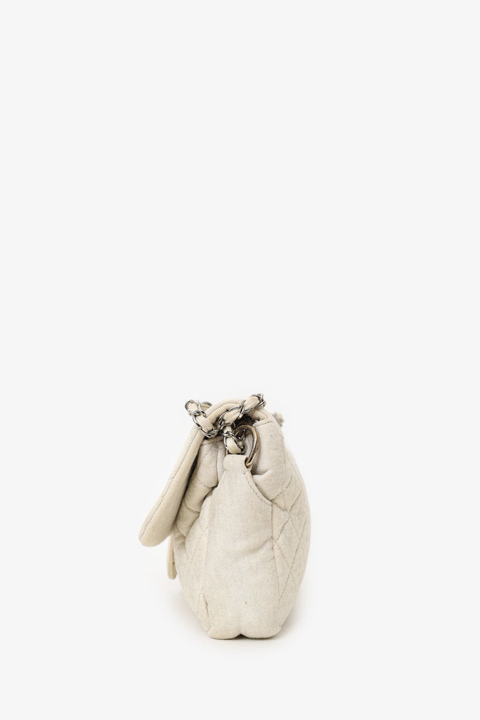Pre-Loved Chanel™ 2008-09 White/gold Quilted Jersey Cc Flap Bag. Front fold-over flap with magnetic closure. Dual chain-link shoulder straps that can be turned into one crossbody strap. Fabric-lined interior. Single rear wall zip pocket. Silver-tone hardware. Tonal stitching.