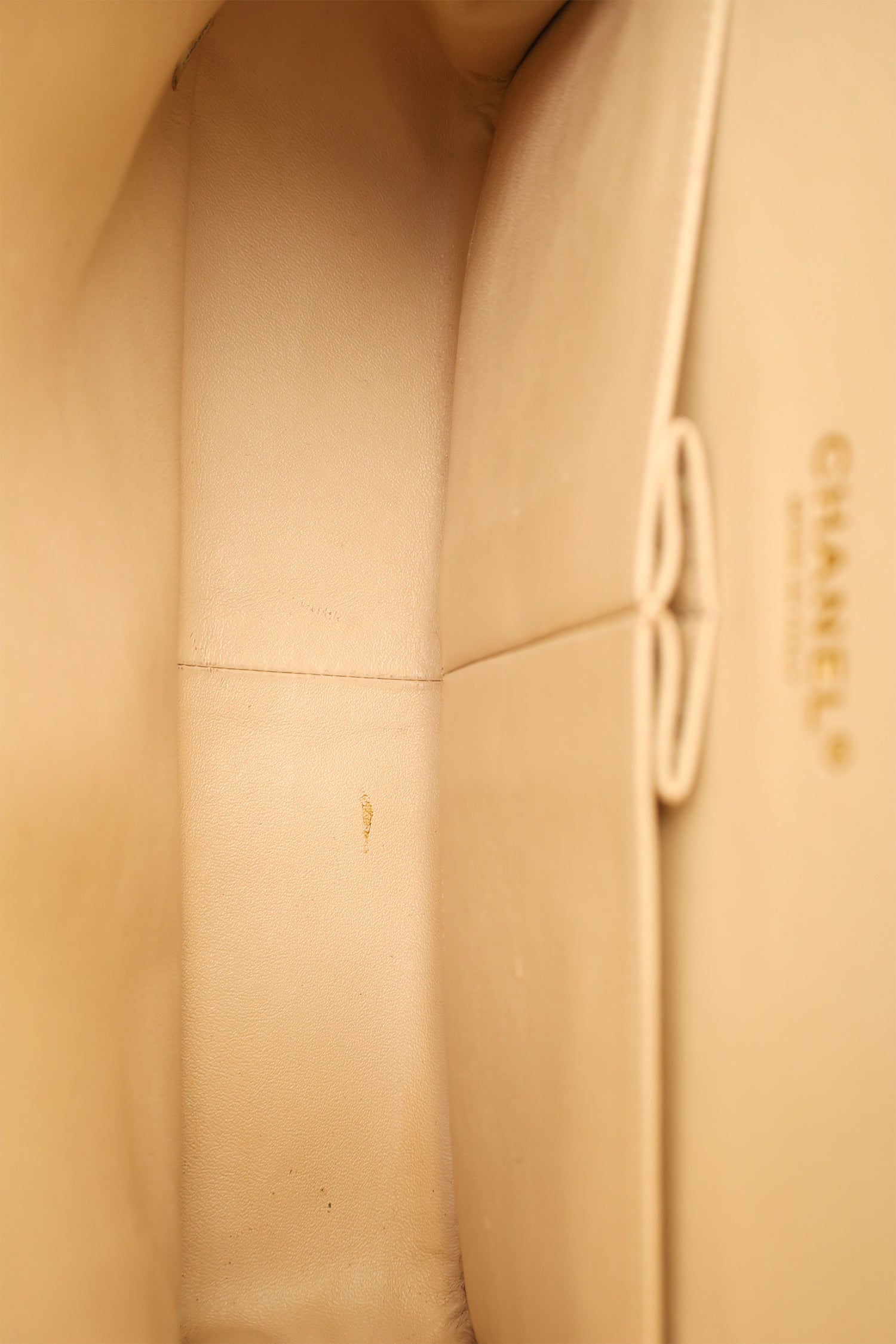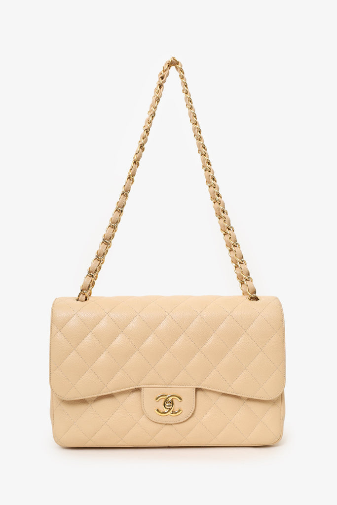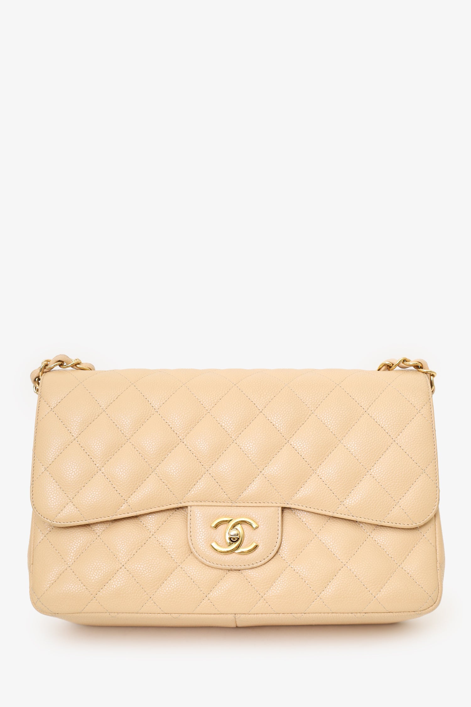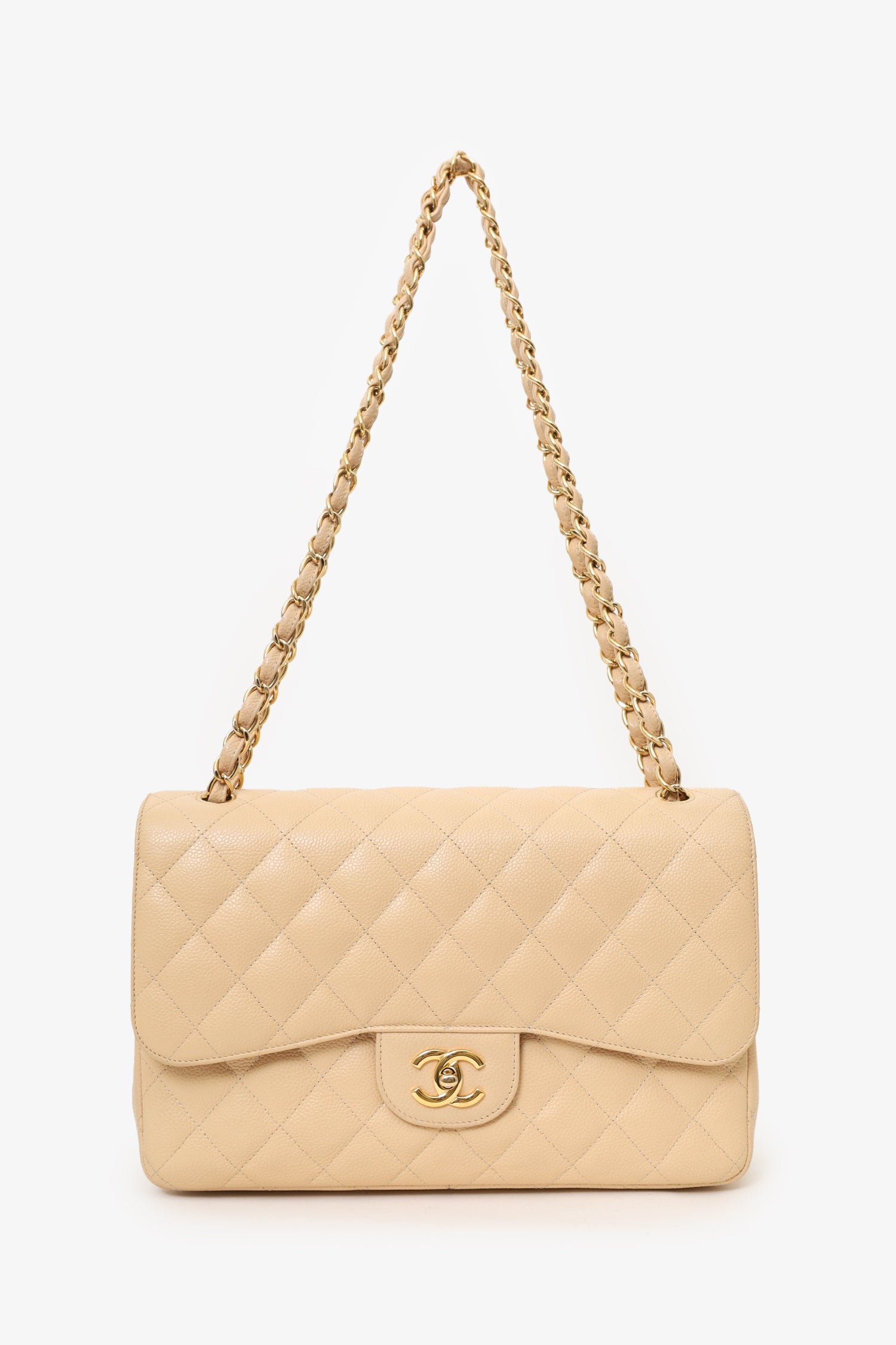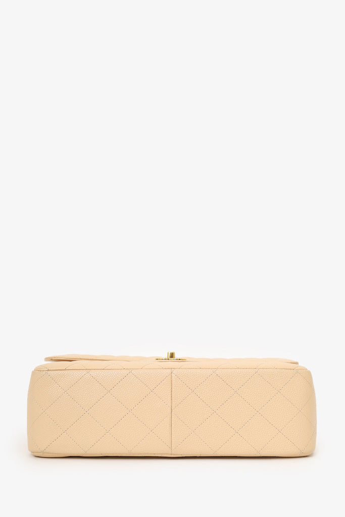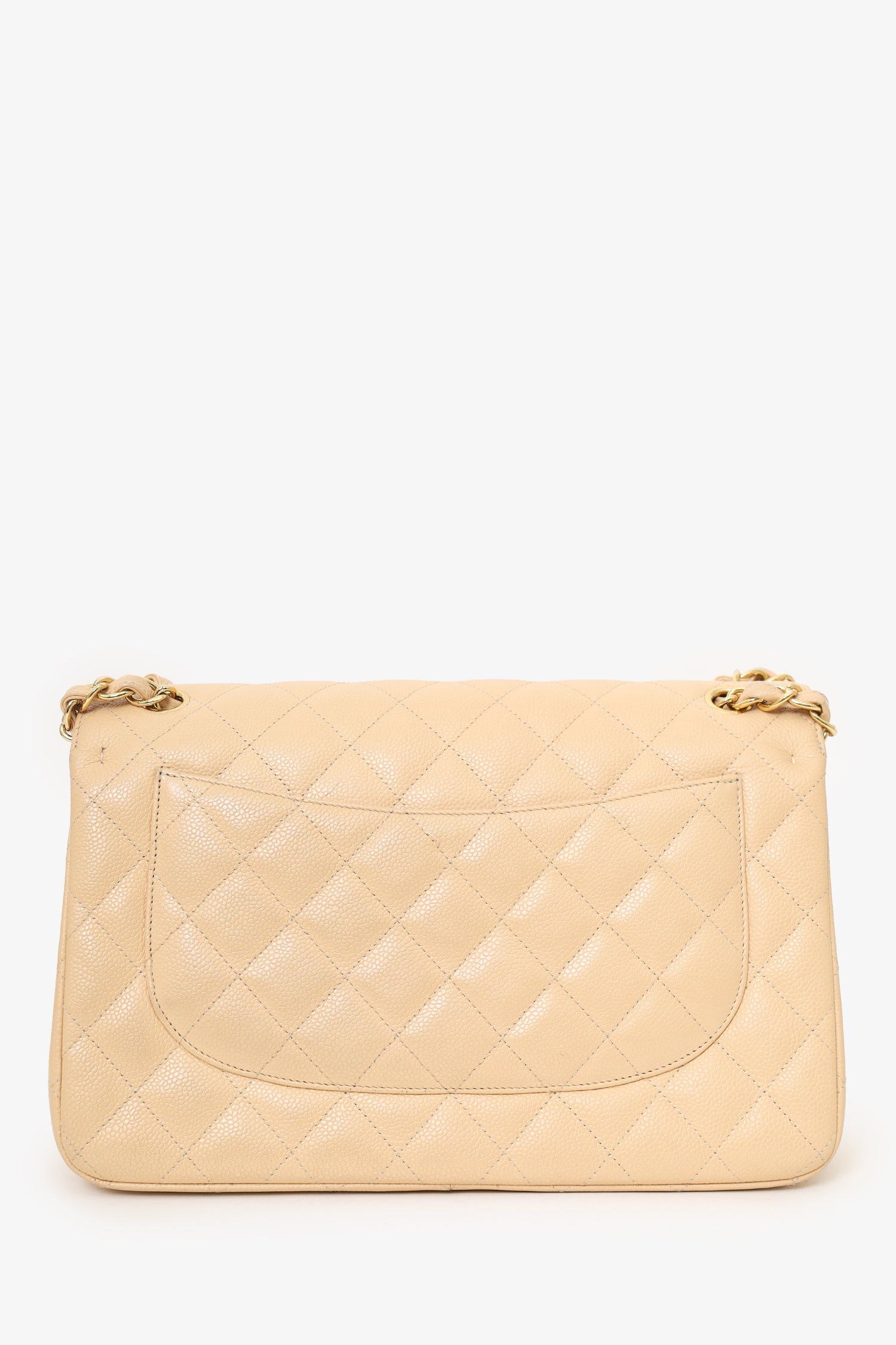 Pre-Loved Chanel™ 2010-11 Beige Caviar Leather Jumbo Classic Double Flap Bag. Front fold-over flaps; Outer flap with turn-lock closure, inner flap with snap button closure. Twin chainlink shoulder straps that can be pulled in and extended to one long strap. Single rear exterior slip pocket. Leather-lined interior. 2 interior compartments; front compartment with 1 large open pocket. 2 interior slip pockets with single lipstick compartment. Back compartment has 1 zip pocket on underside of top fold-over flap. Gold-tone hardware. Tonal stitching.