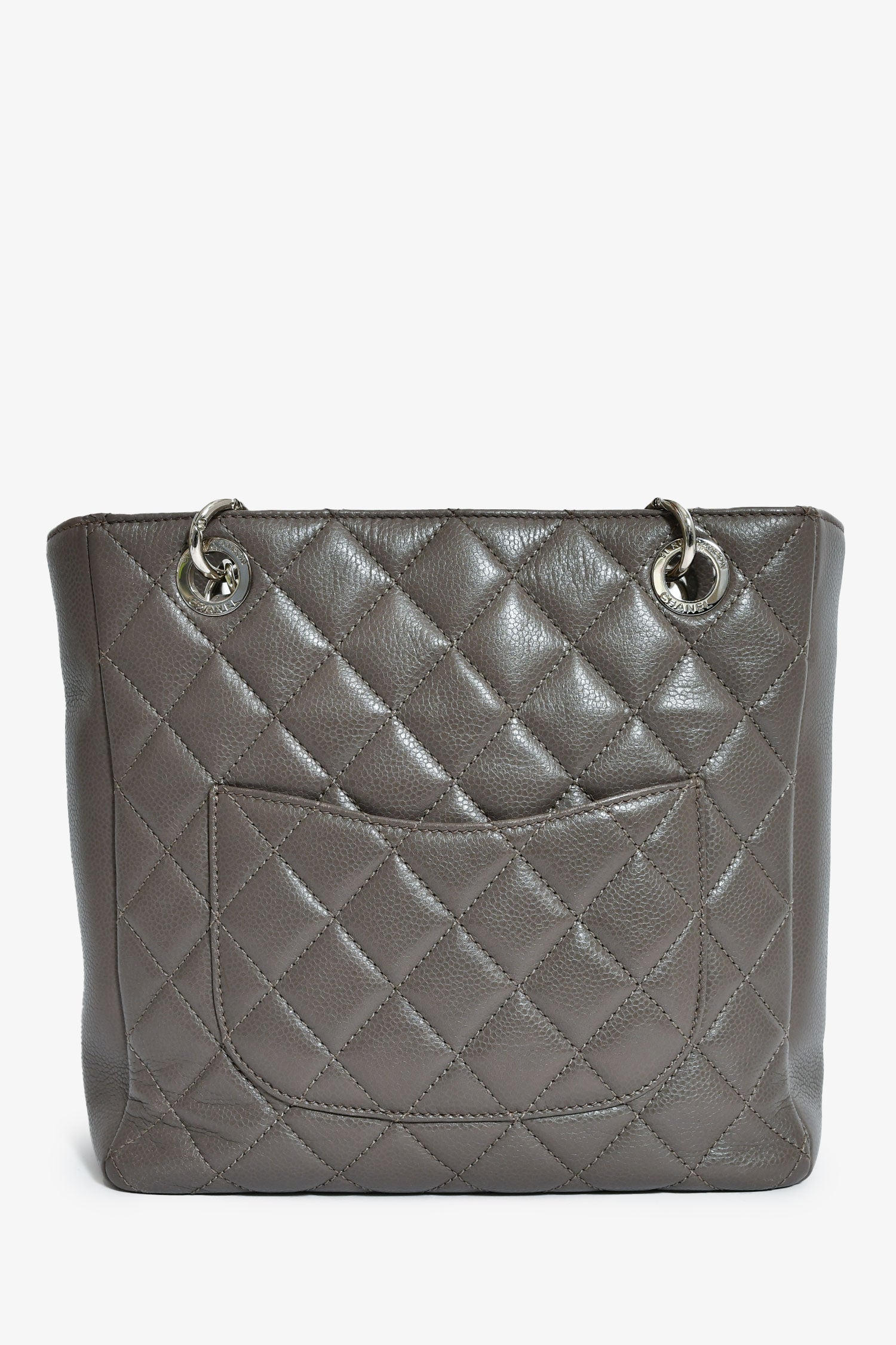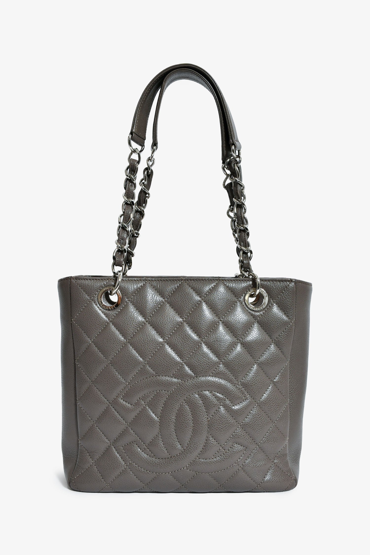 Pre-Loved Chanel™ 2010-11 Grey Caviar Leather Petite Shopping Tote. Concealed top snap button closure. Chain-link shoulder straps. Exterior rear slip compartment. Lined interior with 2 pockets; 1 zip and 1 slip. Silver-tone hardware. Tonal stitching.