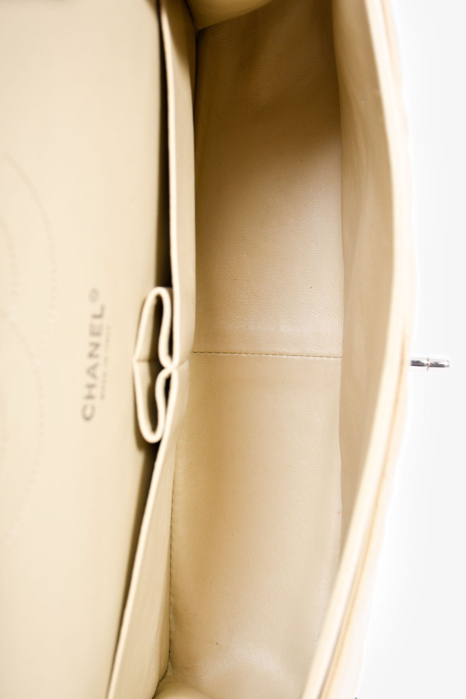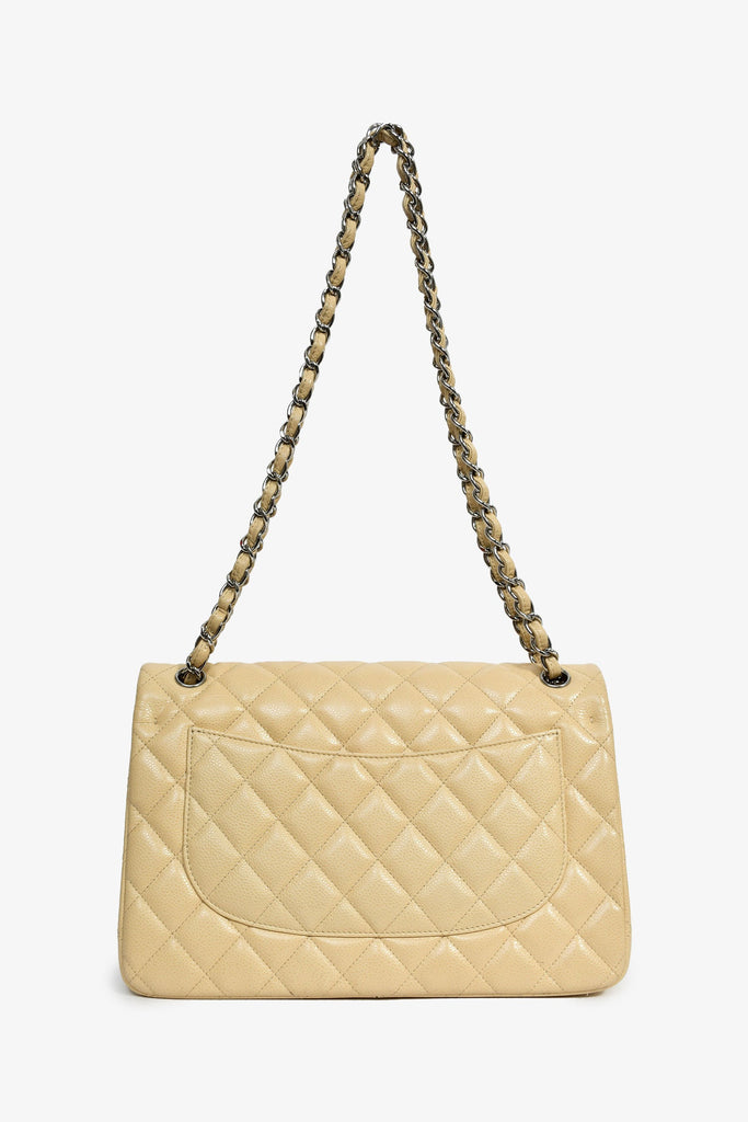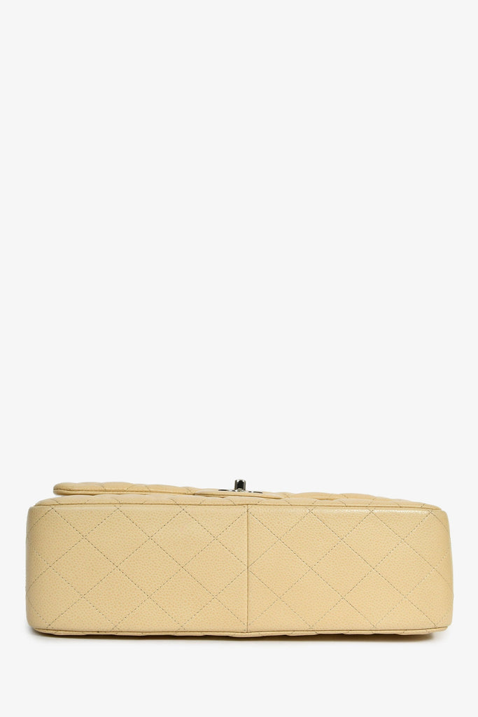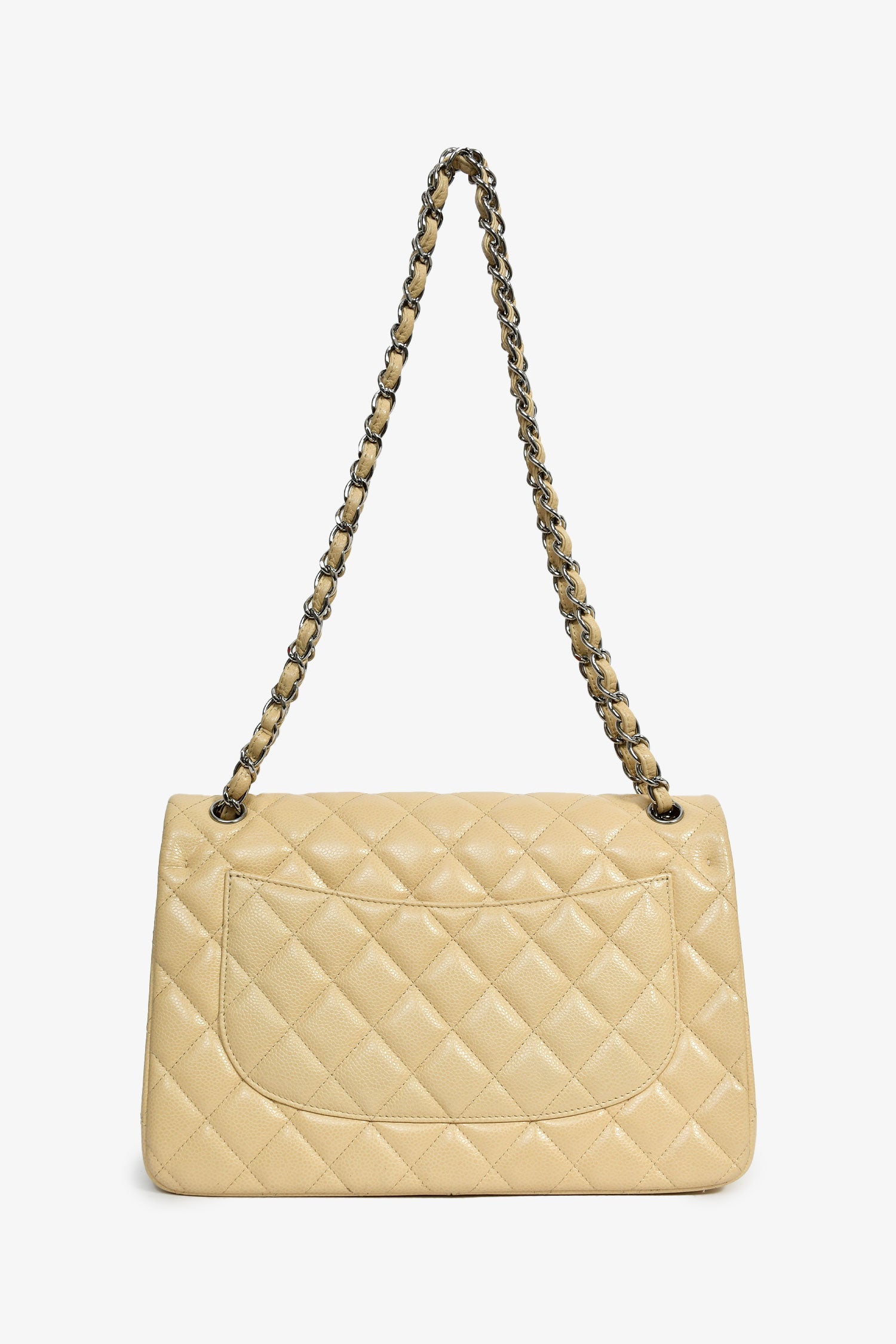 Pre-Loved Chanel™ 2011-12 Beige Caviar Leather Jumbo Double Flap Shoulder Bag. Front fold-over flap with turn-lock closure. Twin chainlink strap that can be pulled into one longer strap. Front pocket with fold-over flap and snap-button closure. Two interior wall card slots. Zipper closure on the interior of the front flap. Silver-tone hardware. Tonal stitching.