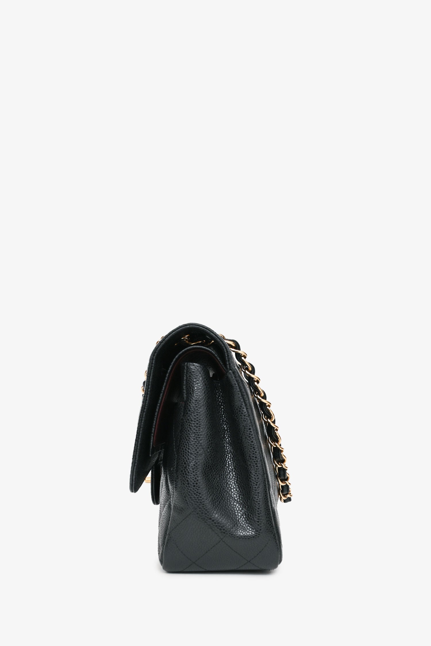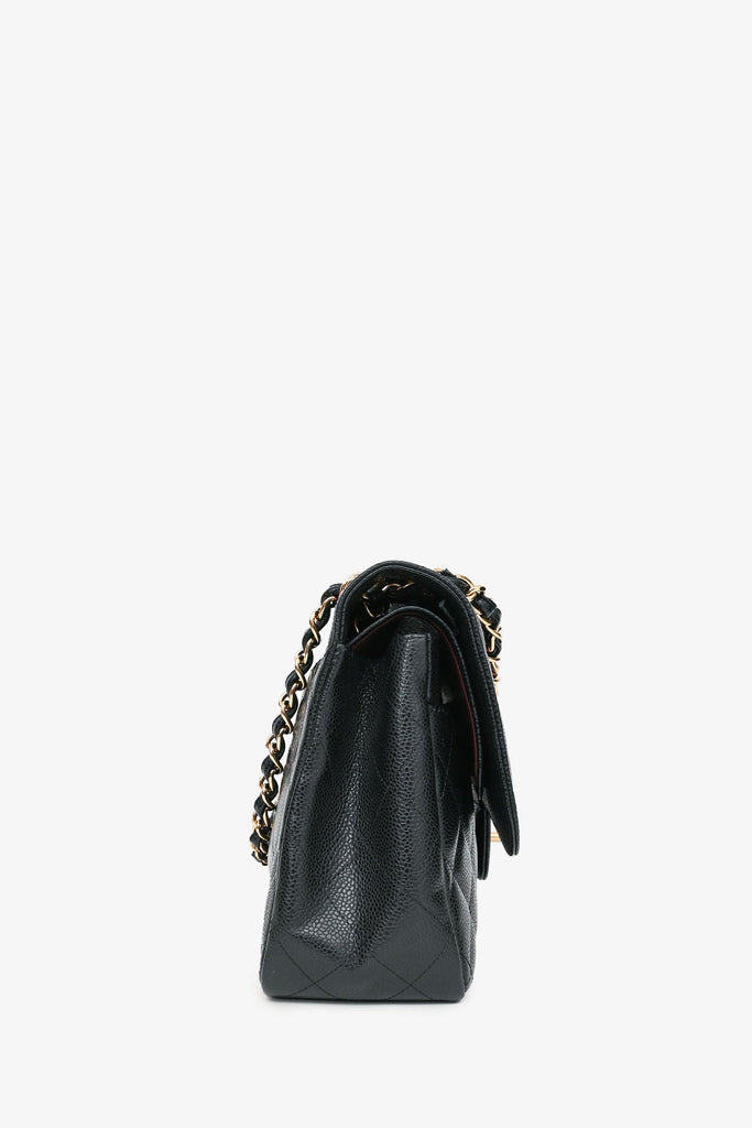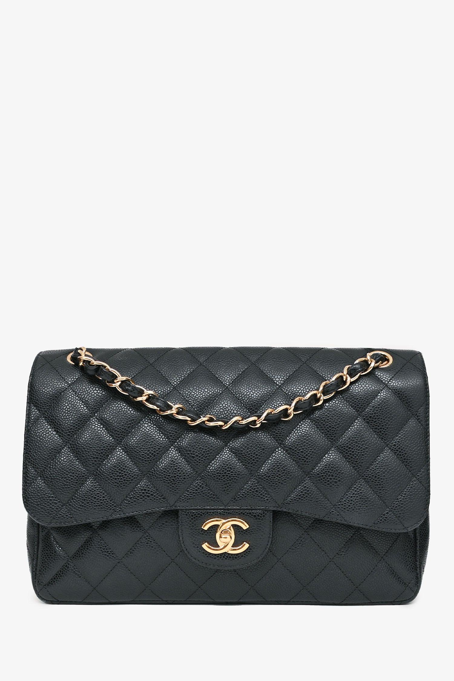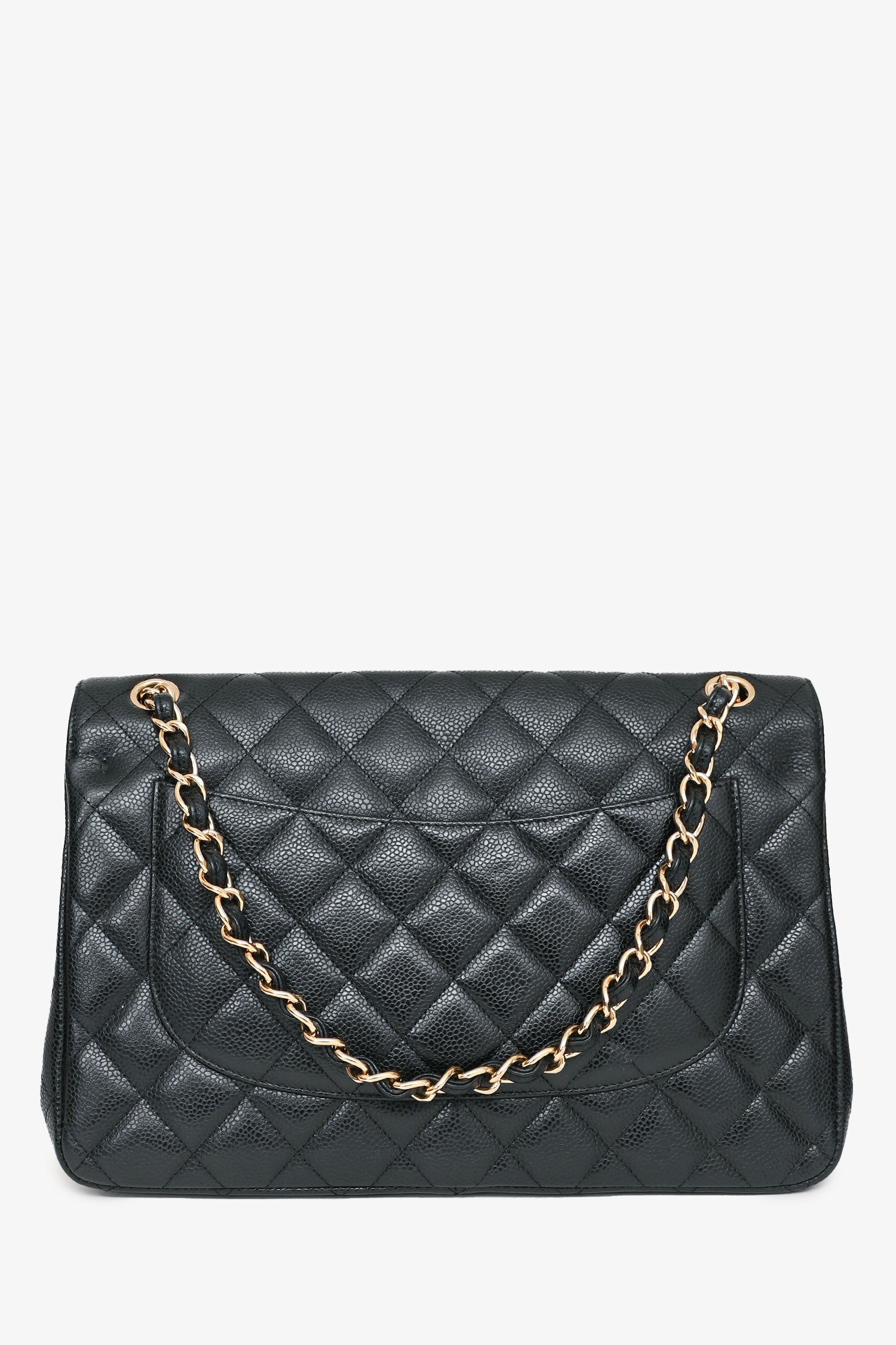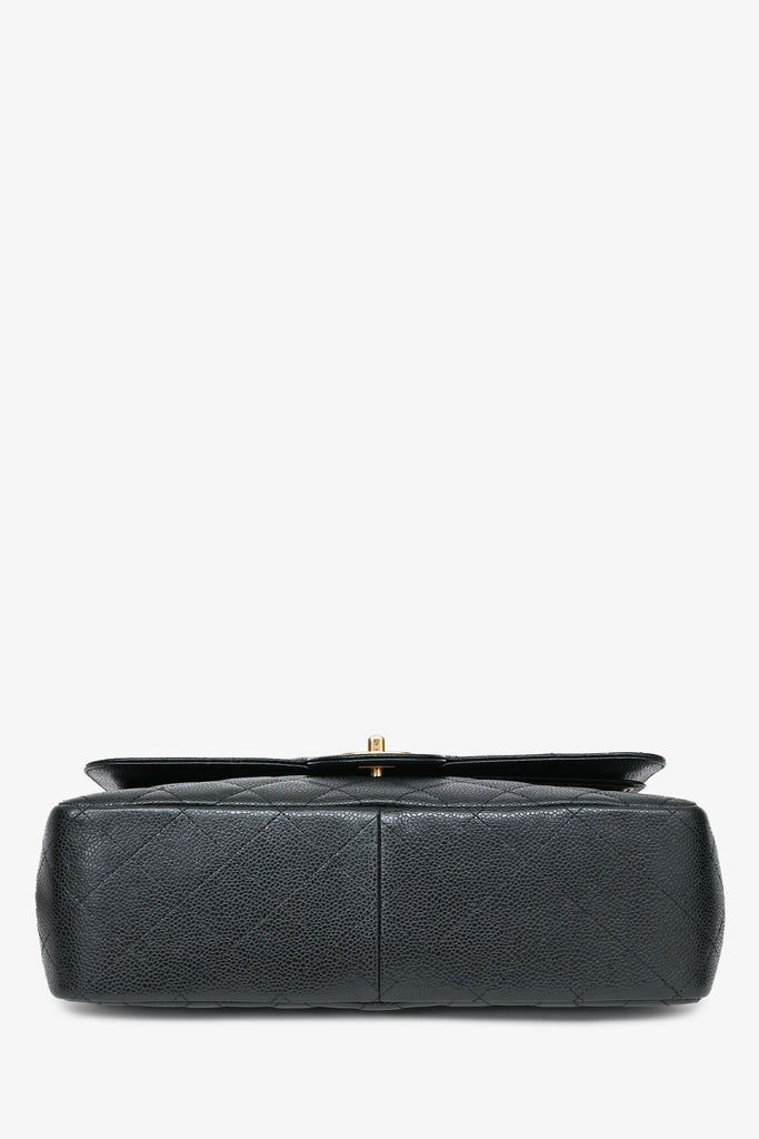 Pre-Loved Chanel™ 2011-12 Black Caviar Leather Classic Jumbo Double Flap. Double fold-over flaps. Gold hardware. Turn-lock closure. Chain-link and leather shoulder straps. Double interior compartments with 2 pockets. Tonal stitching.