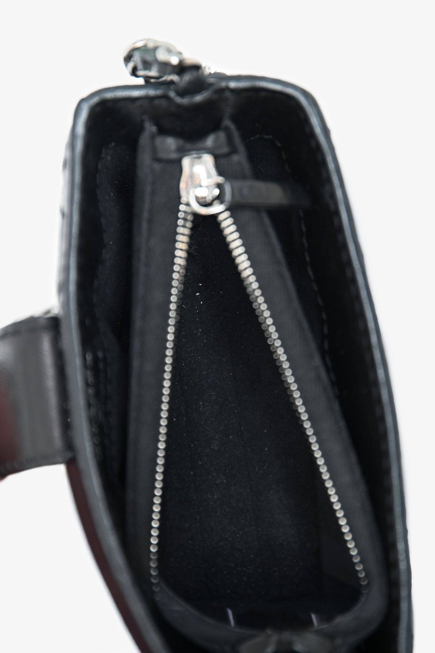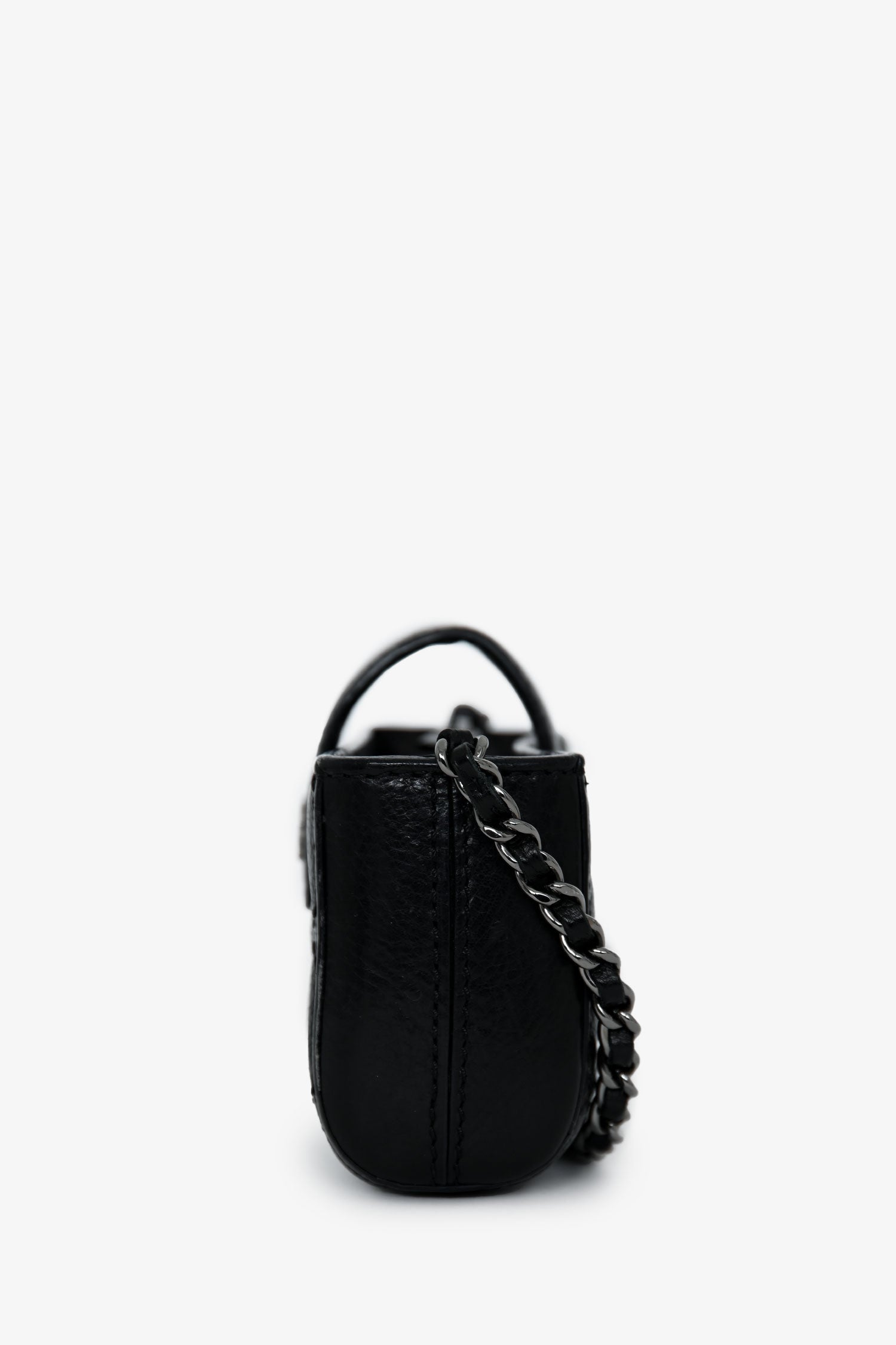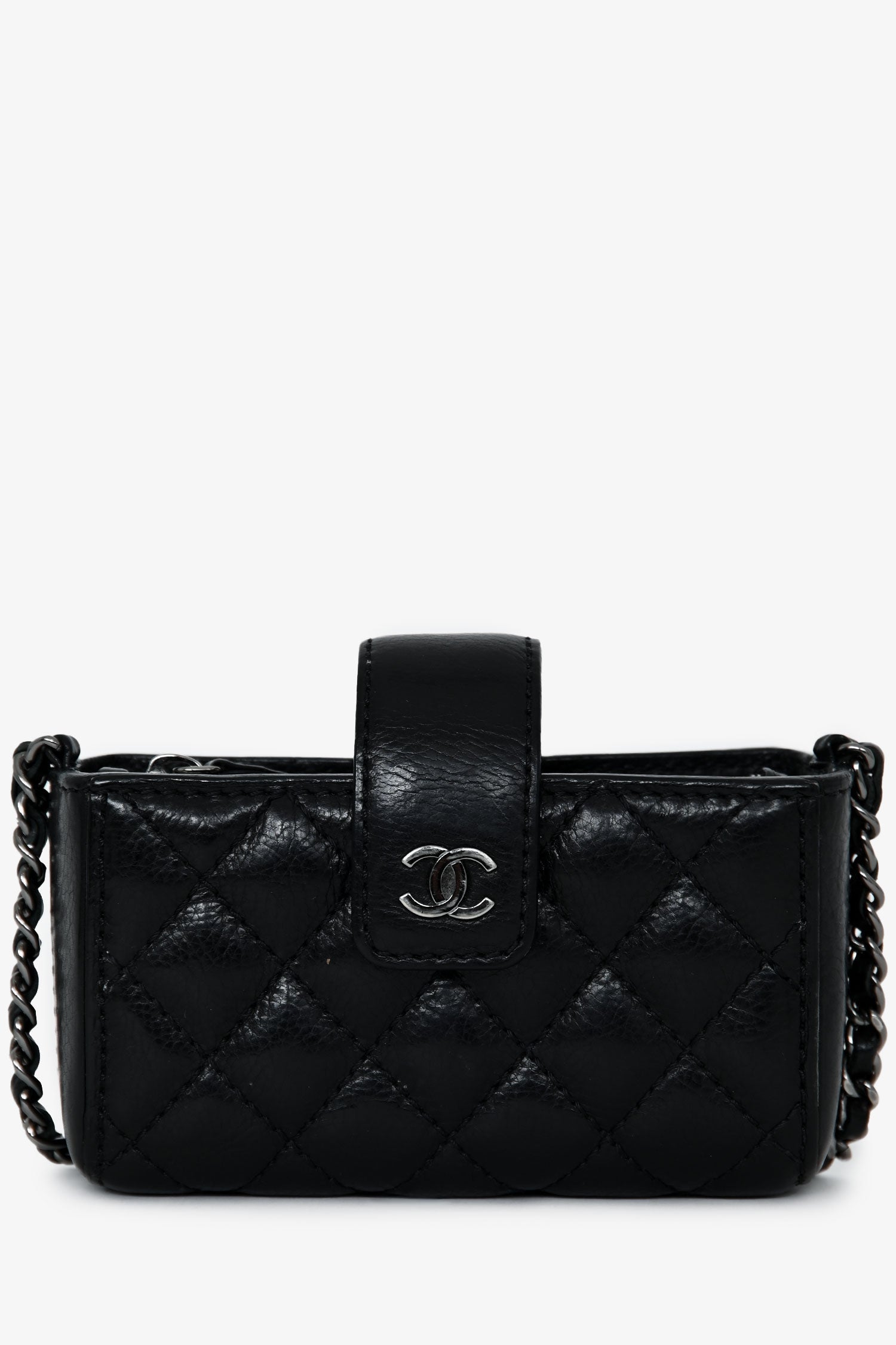 Pre-Loved Chanel™ 2011 Black Caviar Leather Mini Phone Holder Crossbody. Top concealed zip closure. Top fold-over strap with a snap button closure. Chain-link crossbody strap. Lined interior. Silver-tone hardware. Tonal stitching.