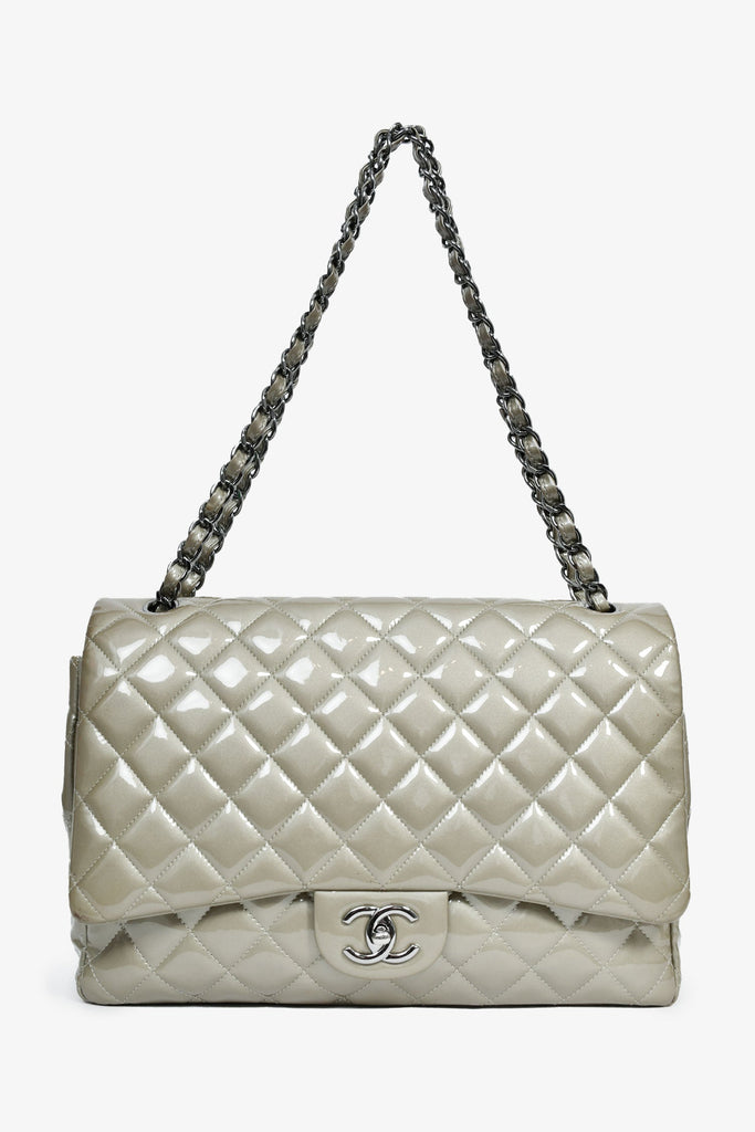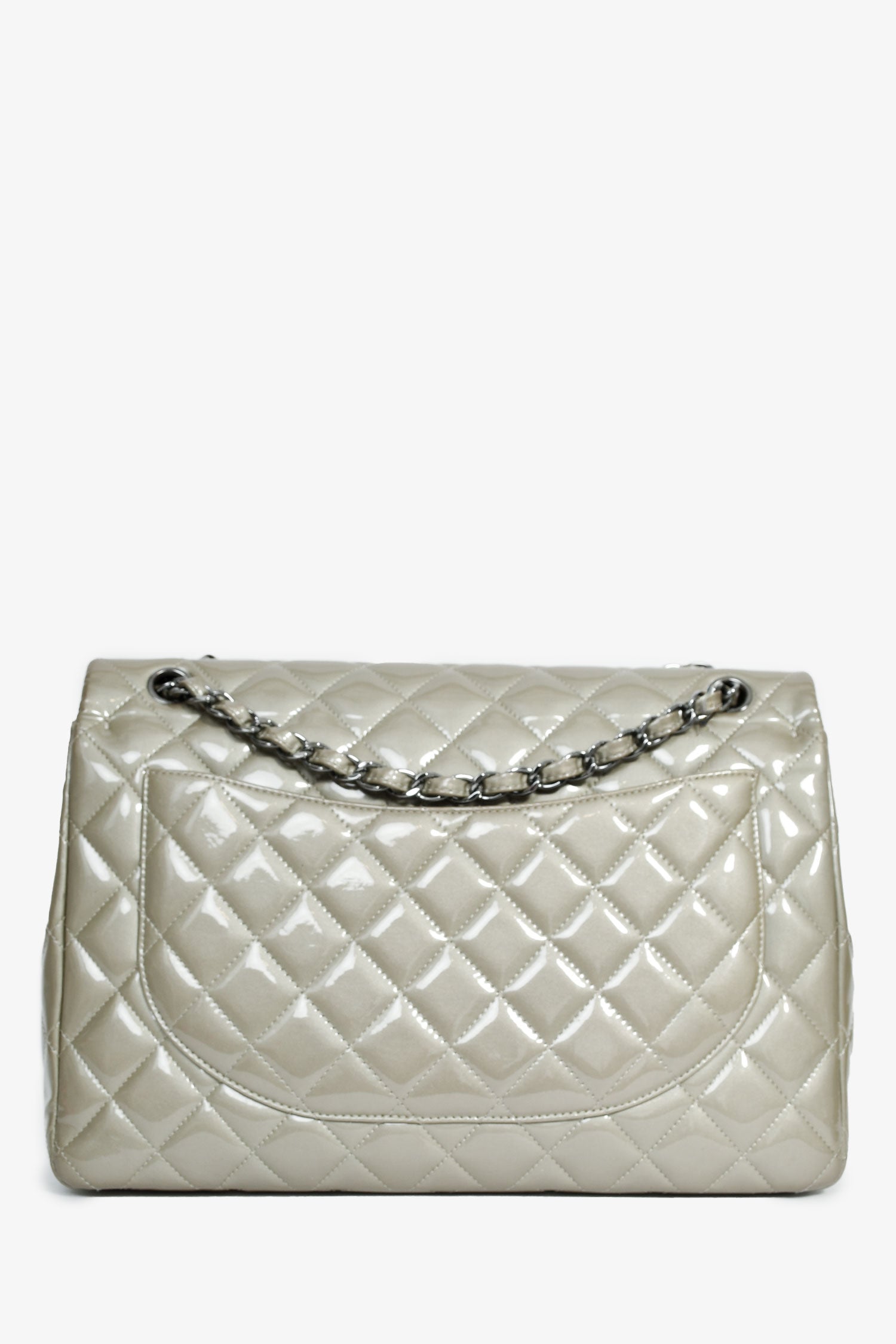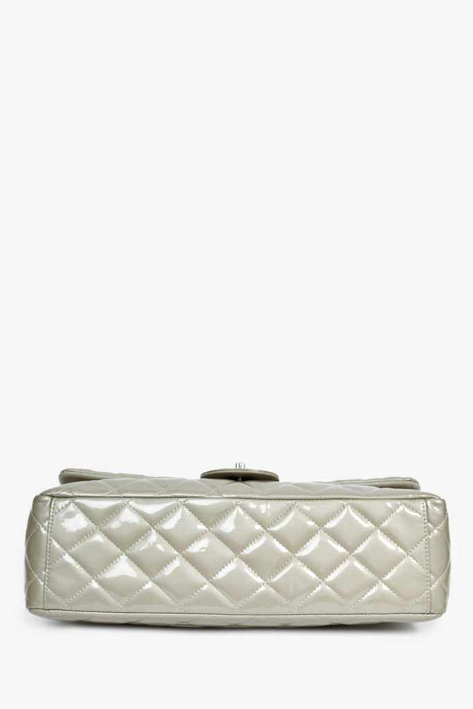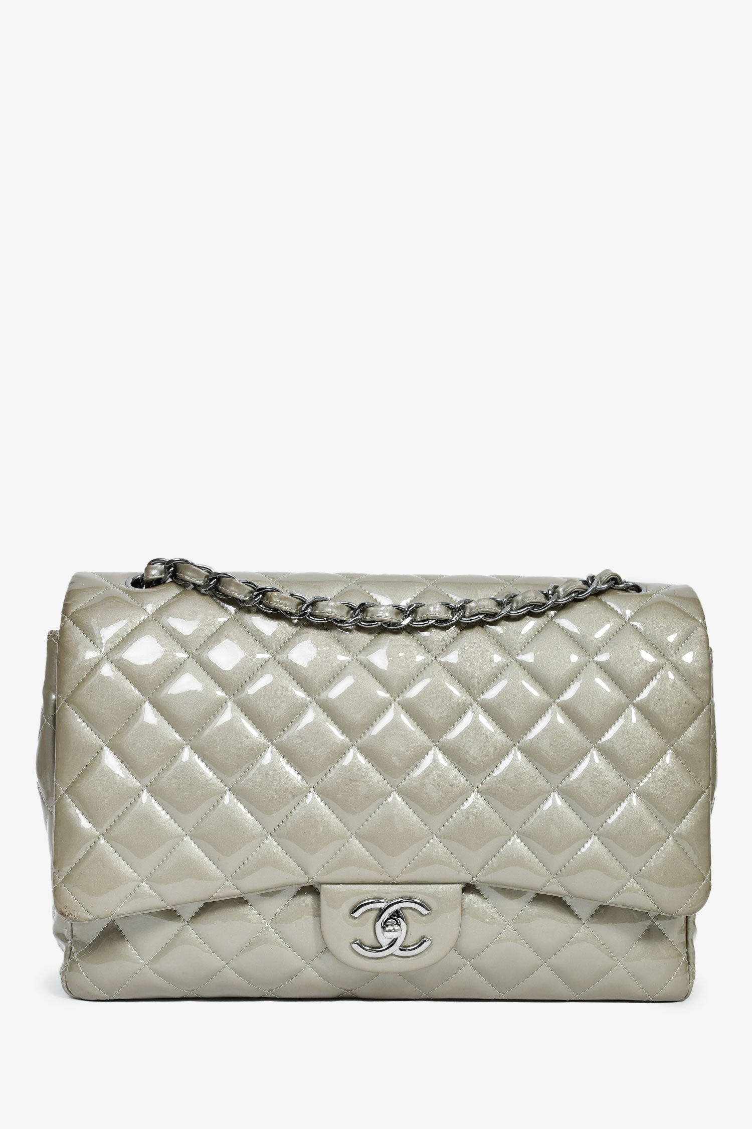 Pre-Loved Chanel™ 2012/13 Grey Patent Quilted Maxi Double Flap Shoulder Bag. Front fold-over flap with turn-lock closure. Slide-around chain. Front and rear exterior slip pocket. Single interior compartment with two wall slip pockets. Tonal leather lining. Gold-tone hardware. Silver stitching.