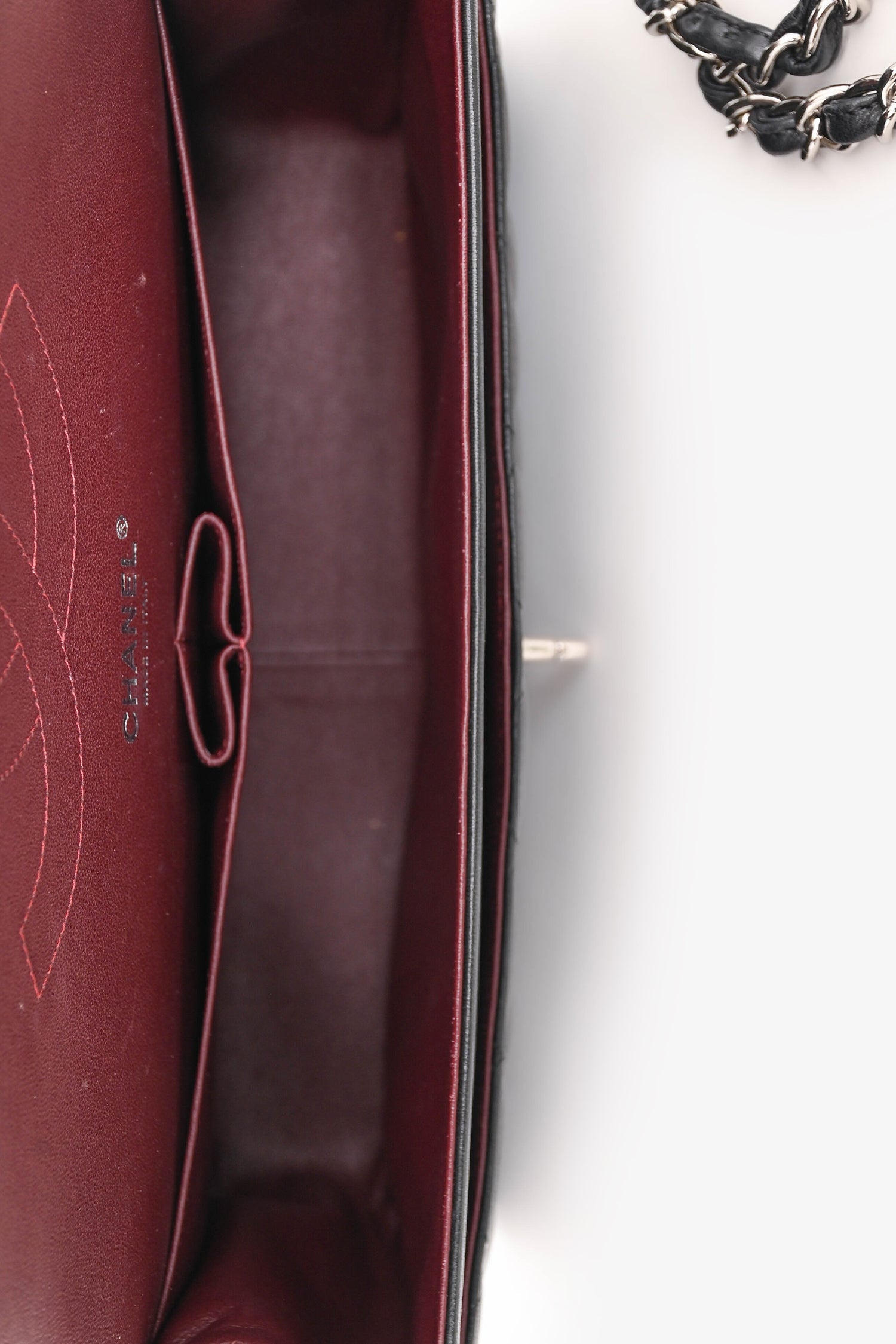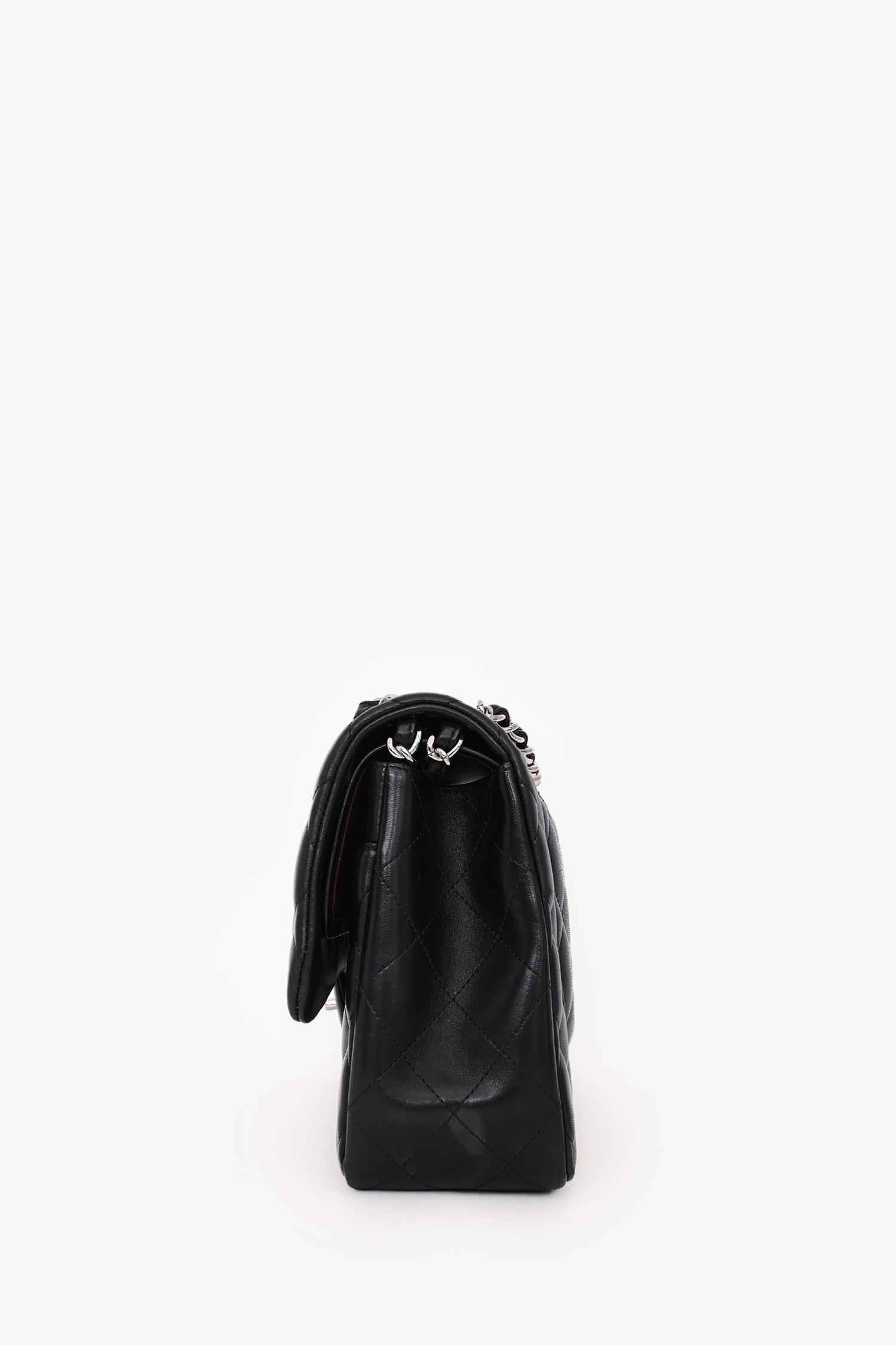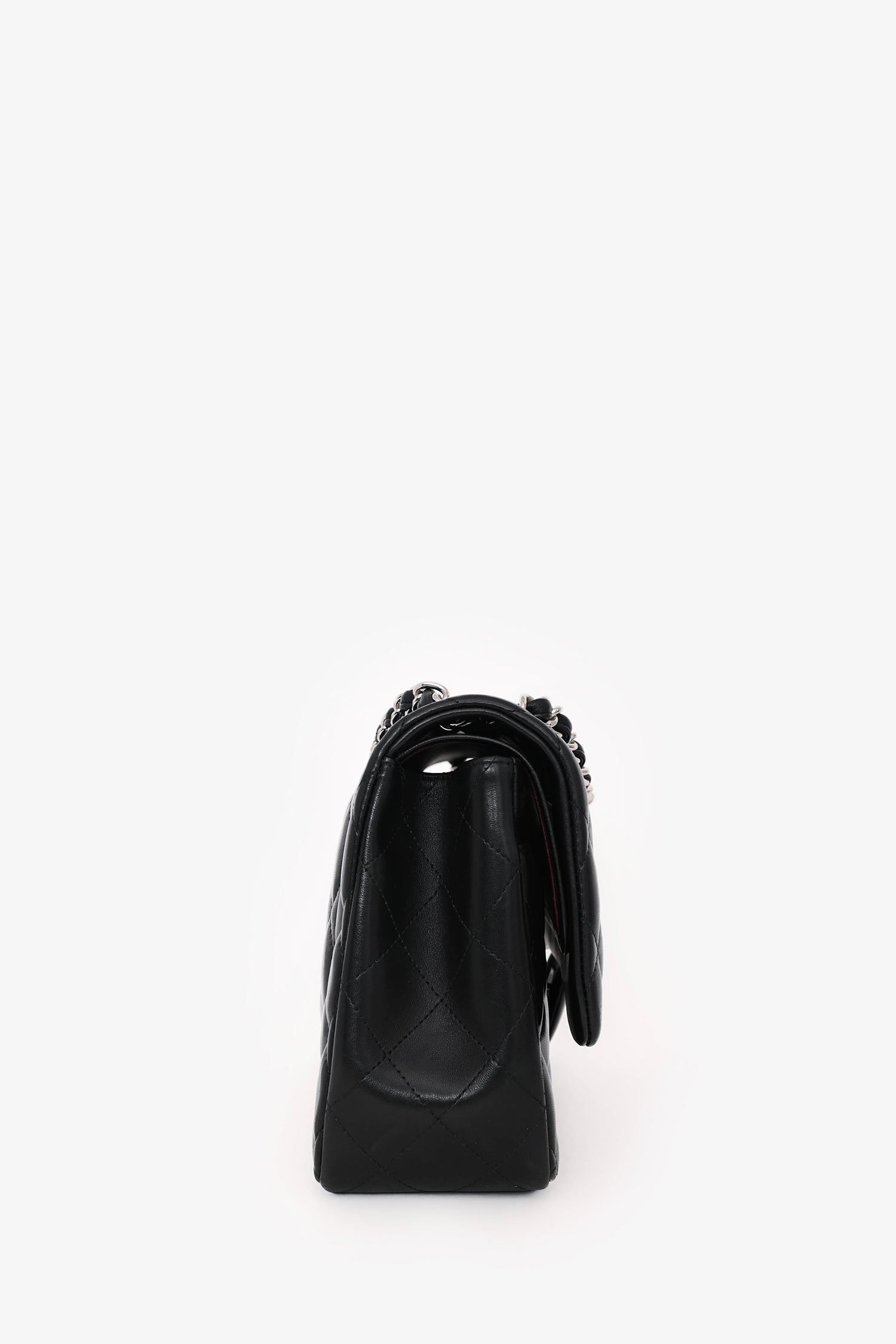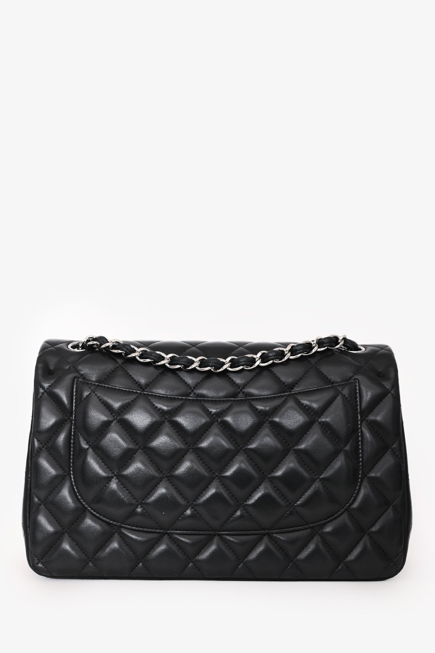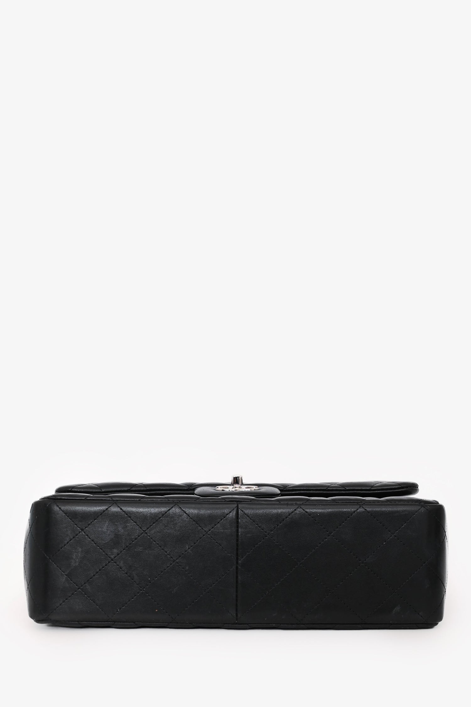 Pre-Loved Chanel™ 2012 Black Lambskin Jumbo Double Flap. Dual front fold-over flaps with a turn-lock closure. Chain-link and leather shoulder strap. 2 interior compartments with 2 pockets. Silver-tone hardware. Tonal stitching.
