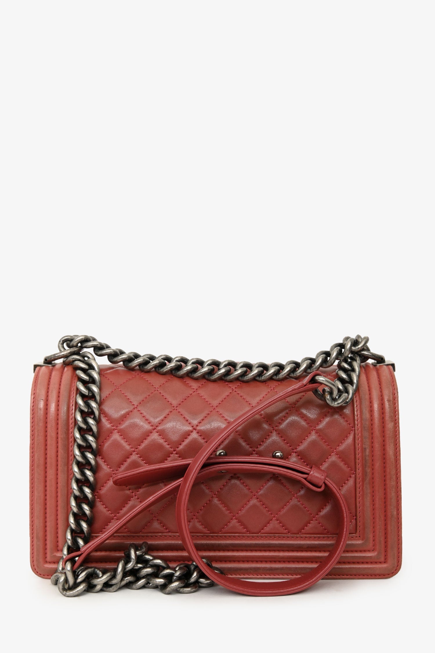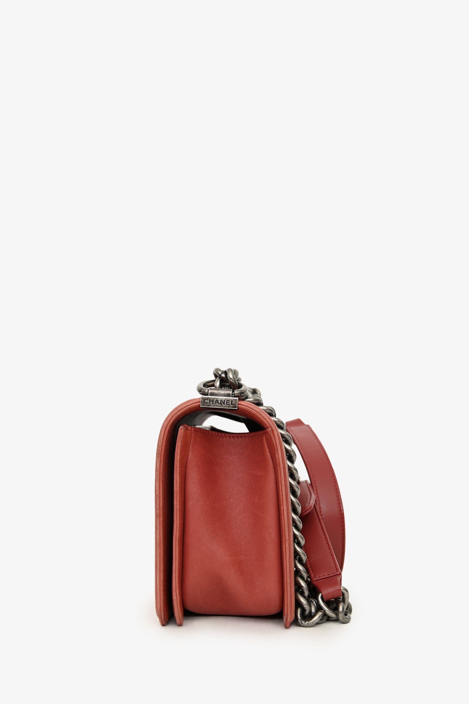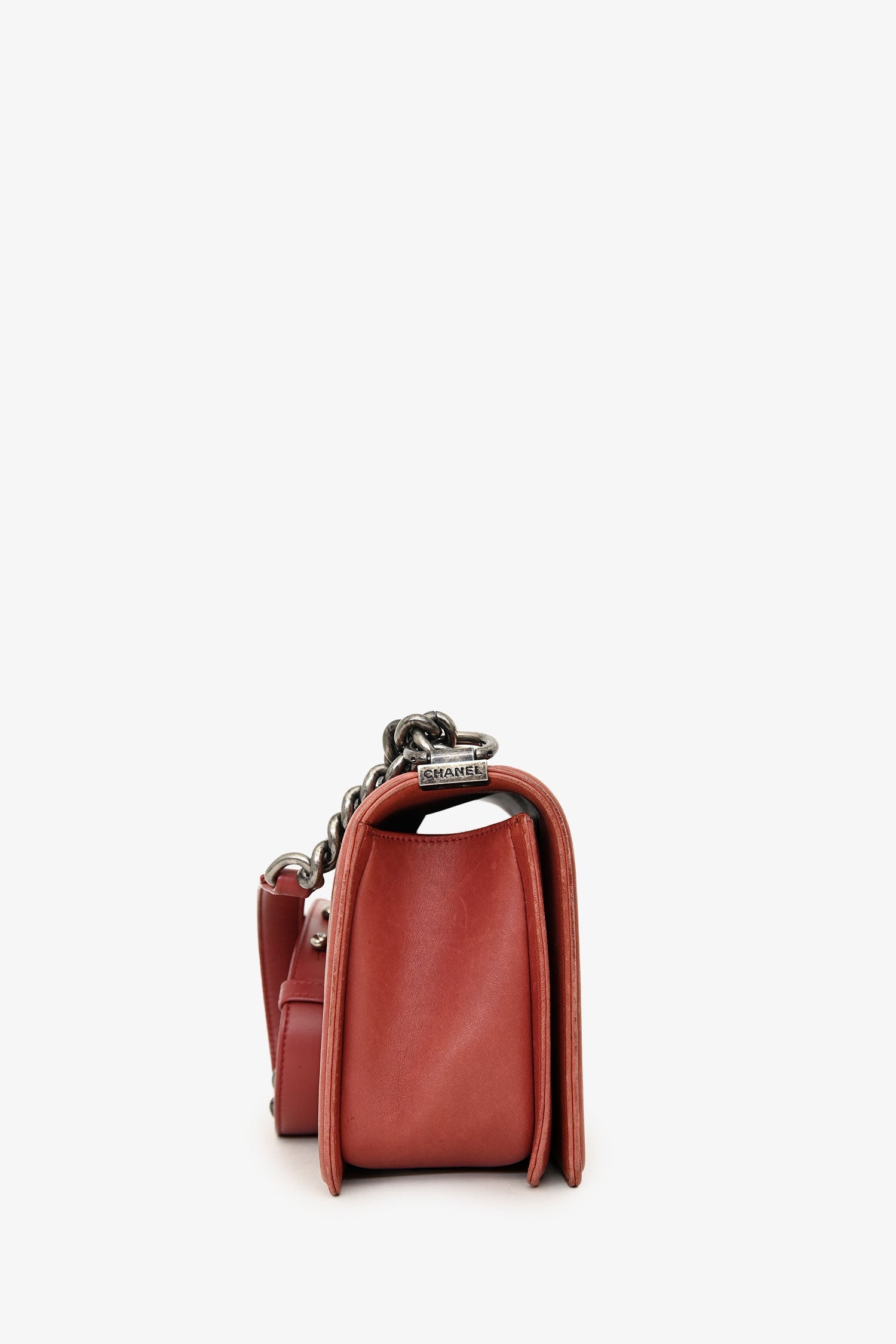 Pre-Loved Chanel™ 2012 Peach Lambskin Medium Boy Bag. Fold-over flap with a slide-lock closure. Chain-link and leather shoulder strap. Lined interior with 2 compartments: 1 main and 1 slip. Silver-tone hardware. Tonal stitching.