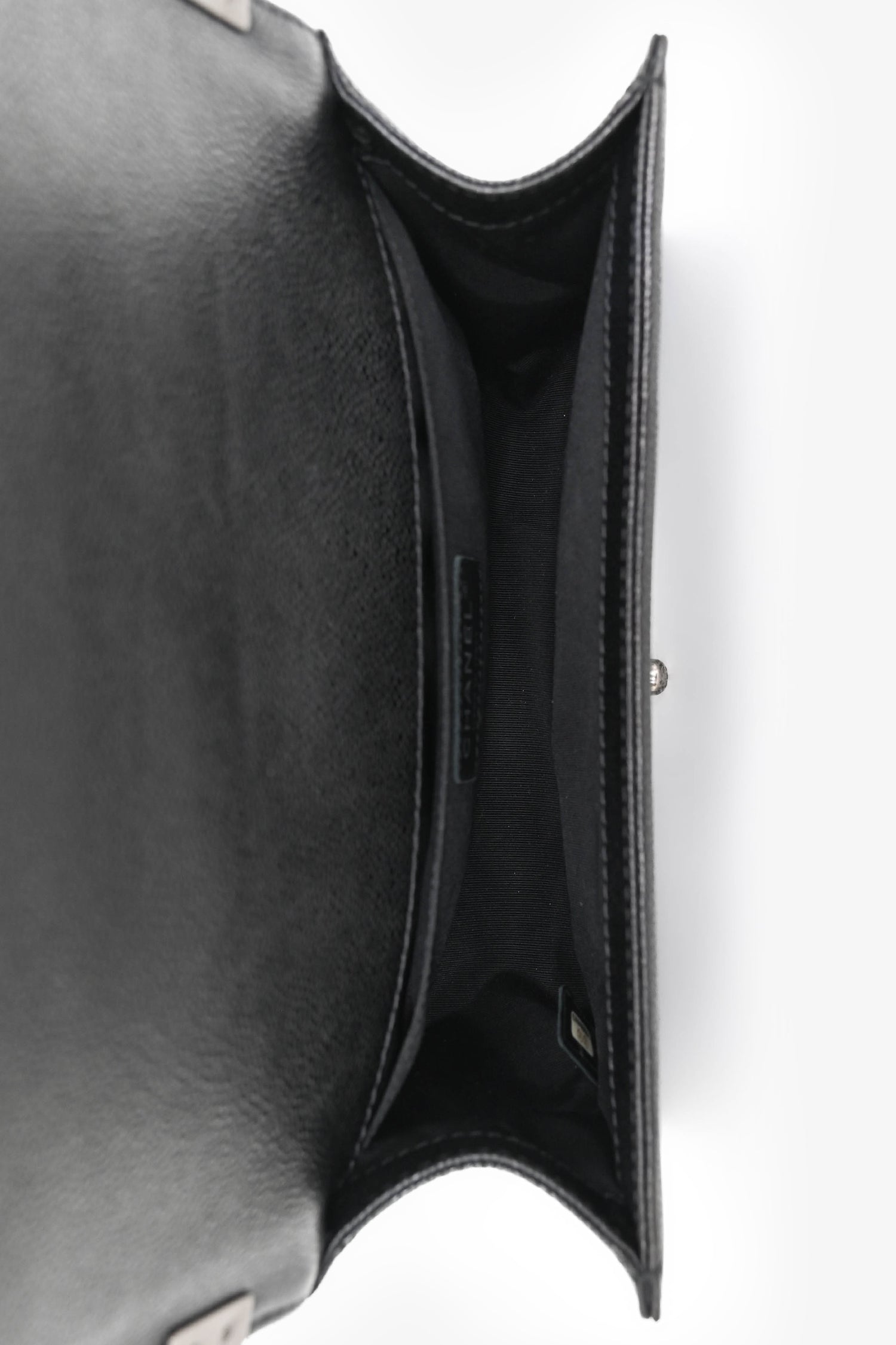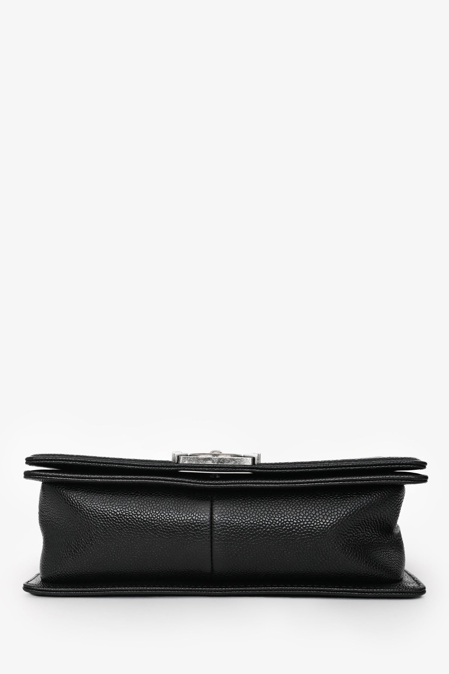 Pre-Loved Chanel 2014 Black Caviar Old Medium Boy Bag. Front fold-over flap with pinch-lock closure. Tonal textile interior lining. Single interior wall slip pocket. Slide-around chain strap. Silver-tone hardware.