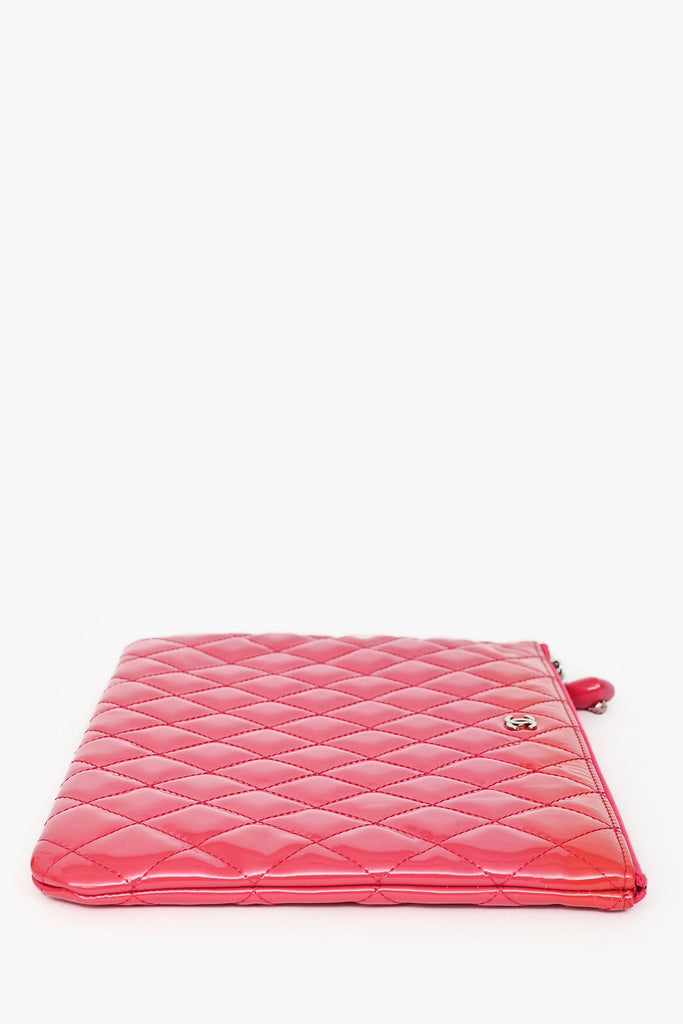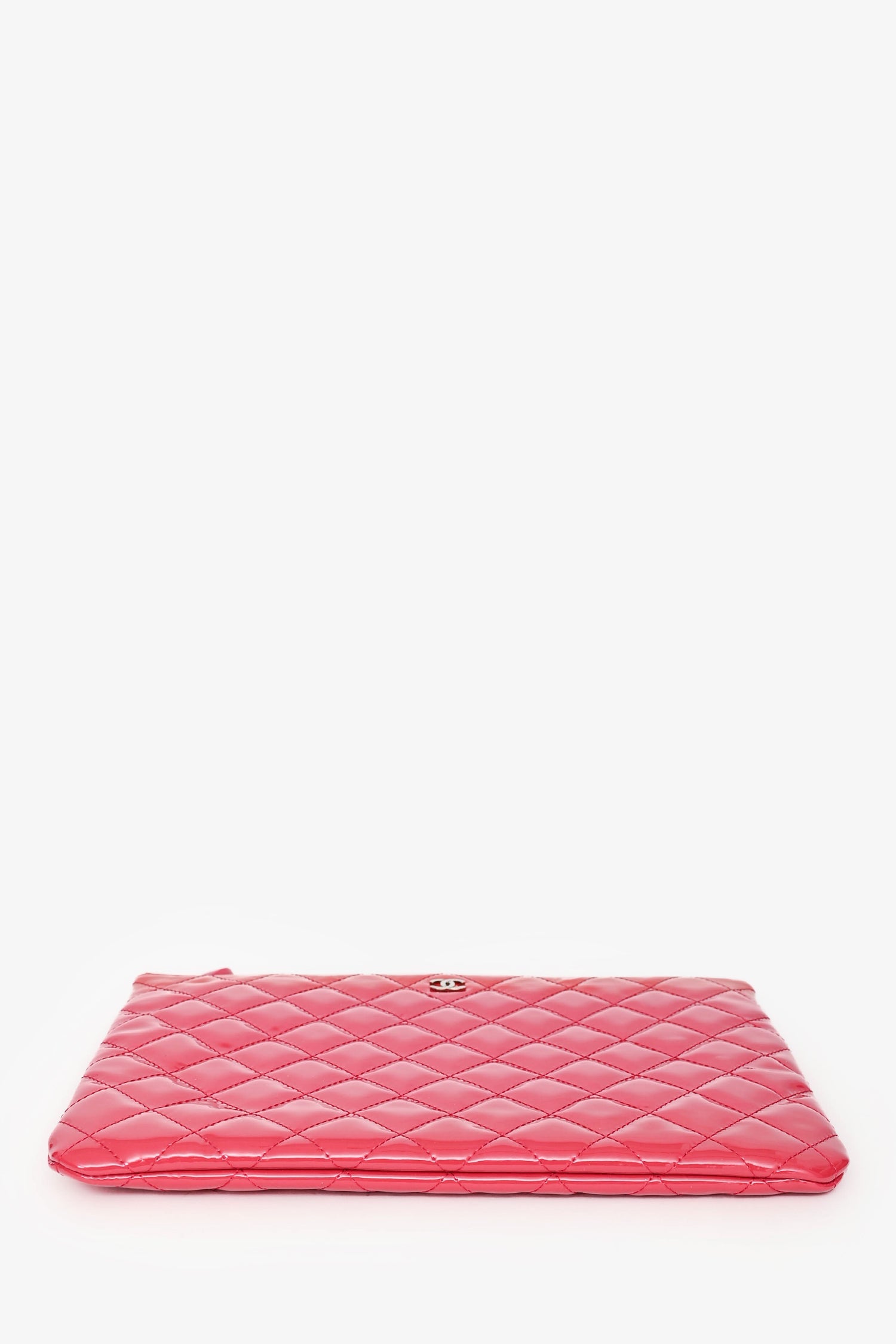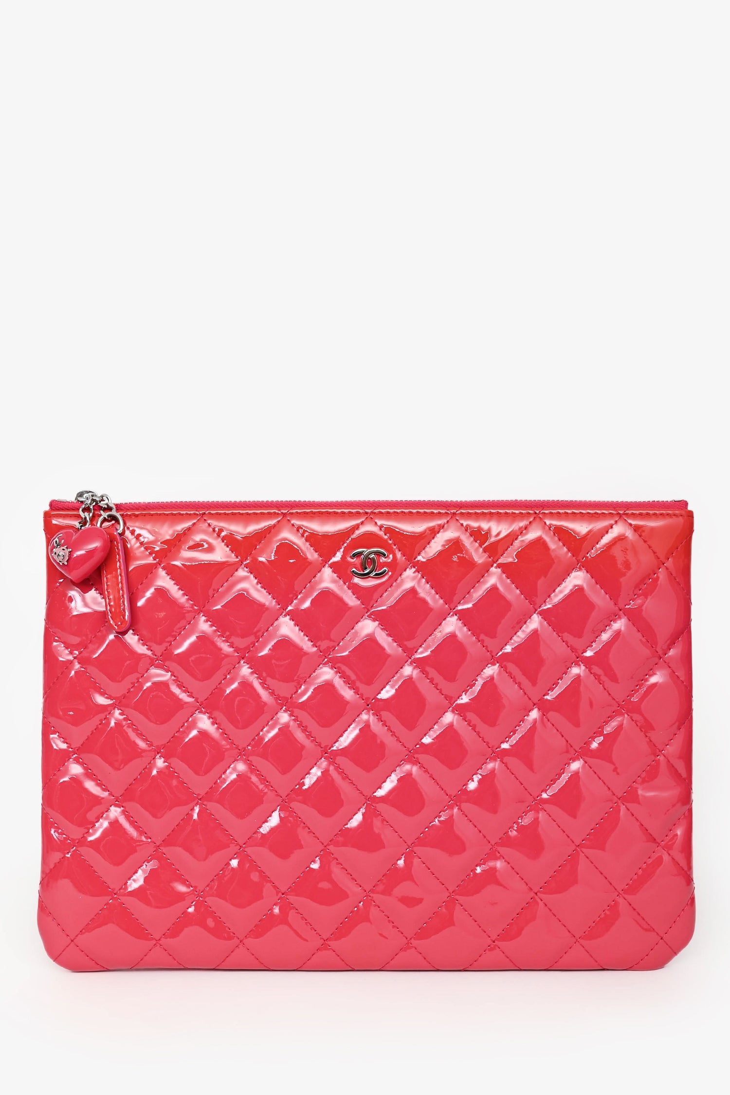 Pre-Loved Chanel™ 2014 Pink Patent Leather Zip Valentines Day O Case. Zipped top. Lacquered patent. Quilted interior. Attached heart shaped charm. Tonal stitching.