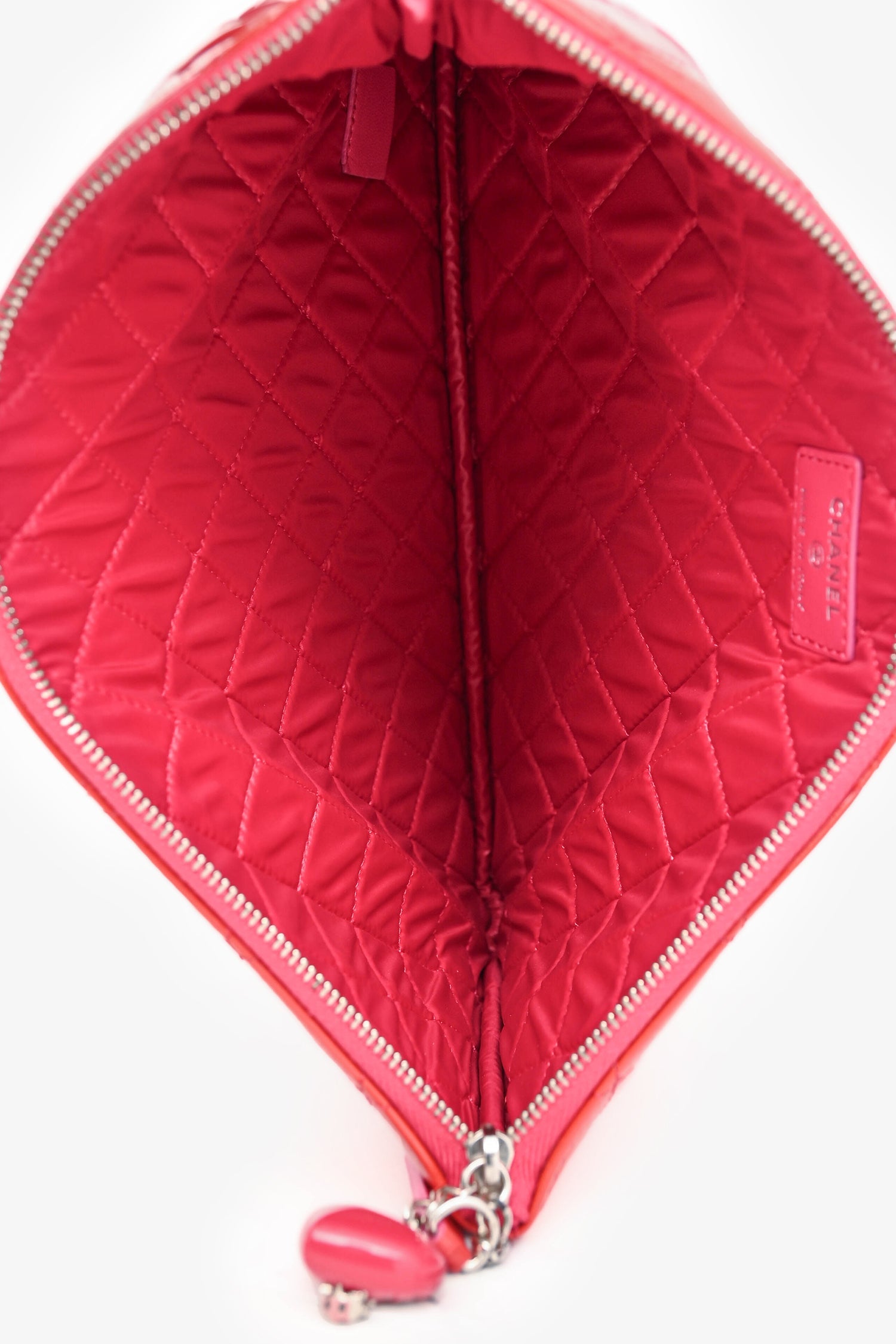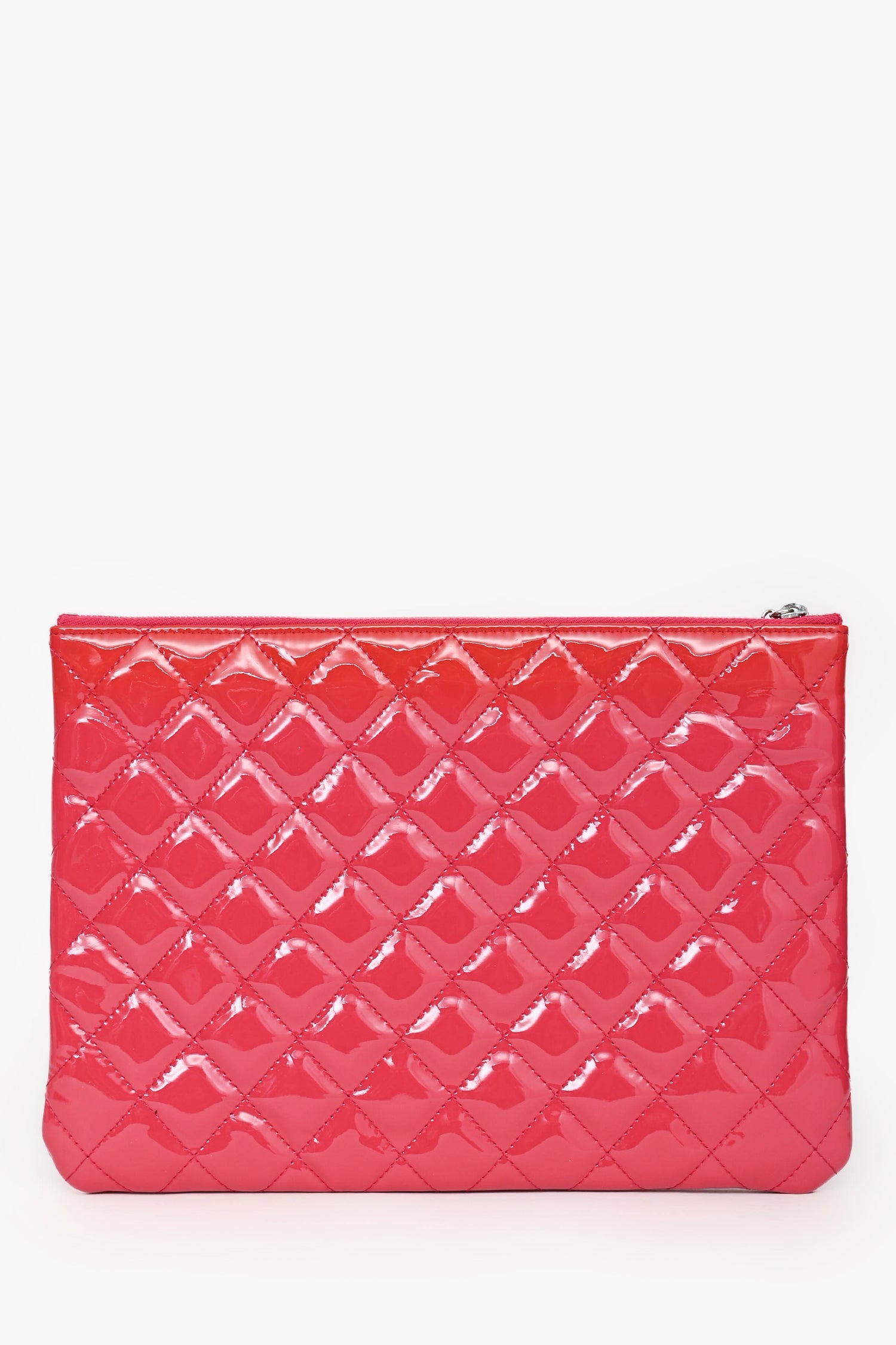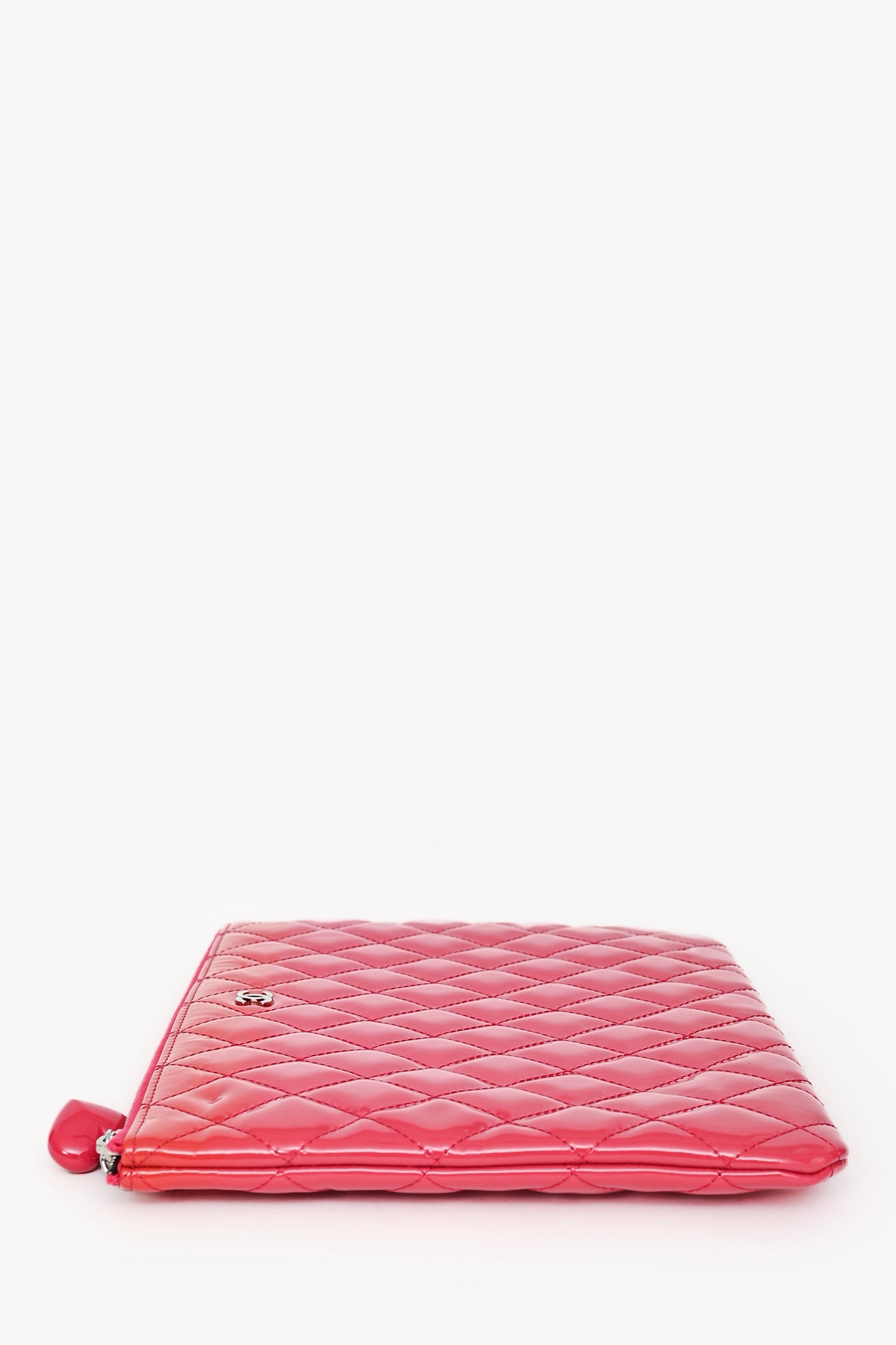 Pre-Loved Chanel™ 2014 Pink Patent Leather Zip Valentines Day O Case. Zipped top. Lacquered patent. Quilted interior. Attached heart shaped charm. Tonal stitching.