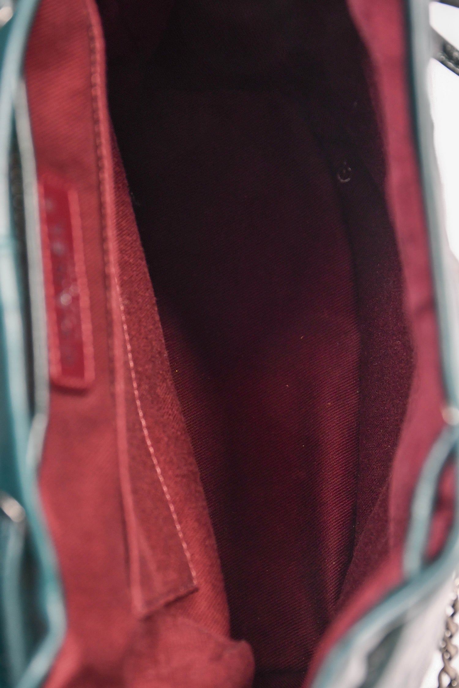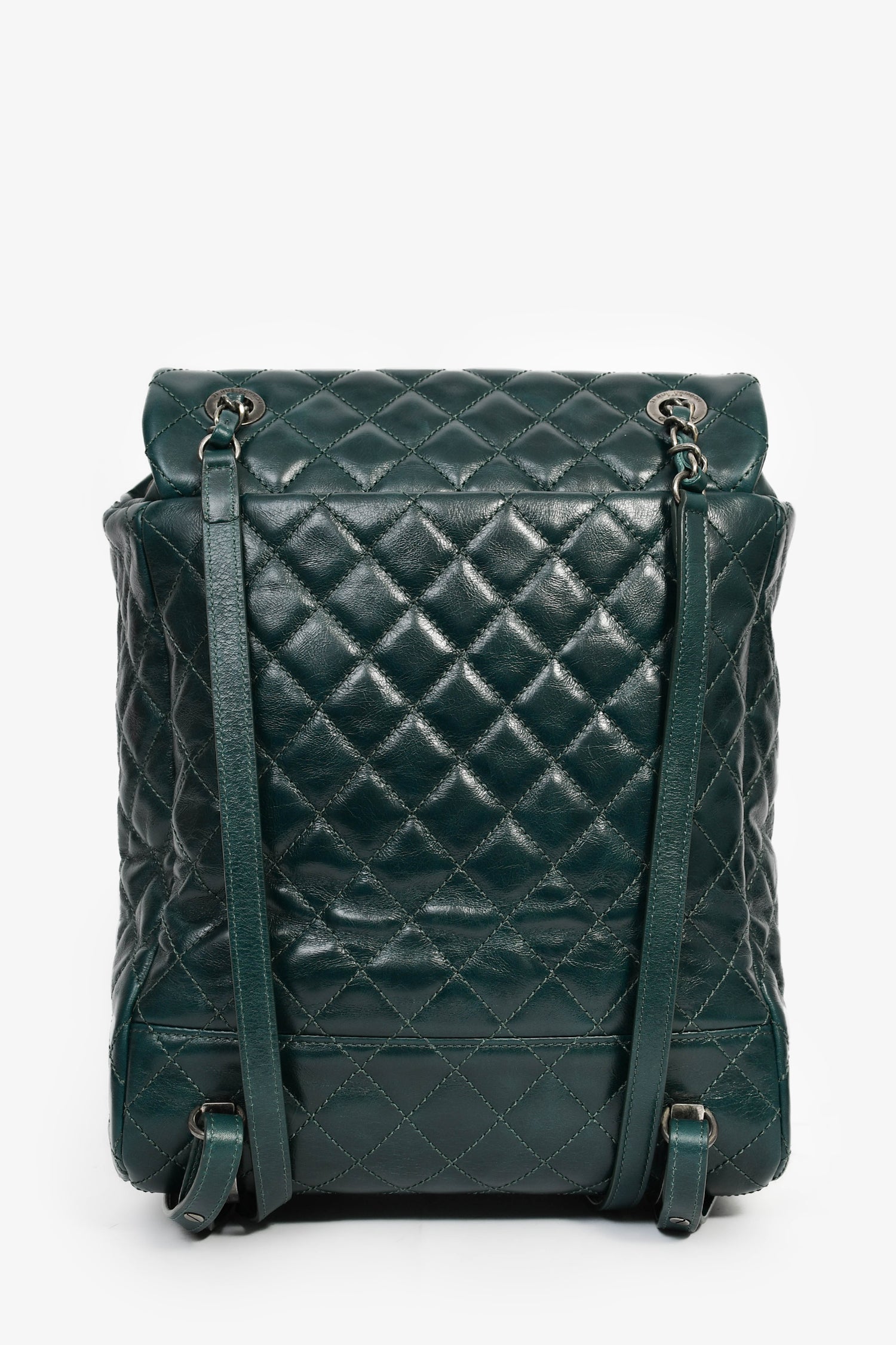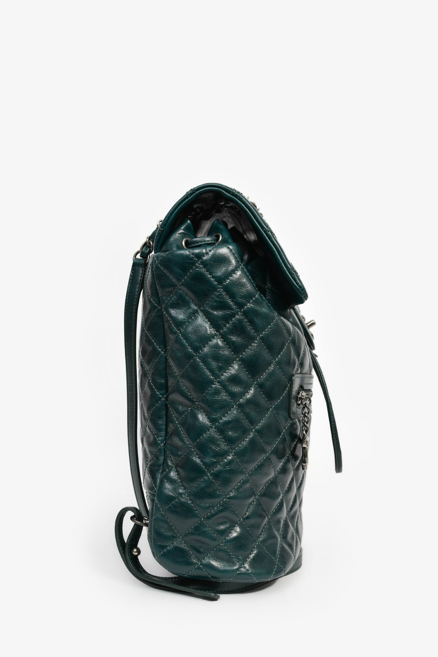 Pre-Loved Chanel™ 2015-16 Green Glazed Calfskin Quilted Small Salzburg Mountain Backpack. Fold-over flap with a turn-lock closure. Adjustable pull tab. Zipped exterior compartment. Lined interior with a single pocket. 2 shoulder straps. Tonal stitching.