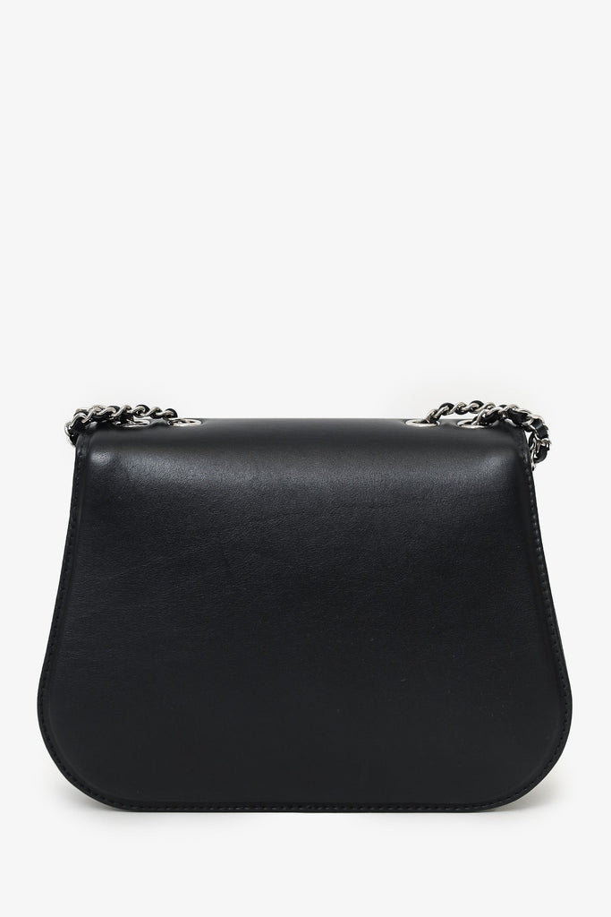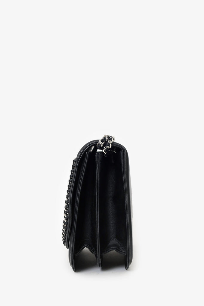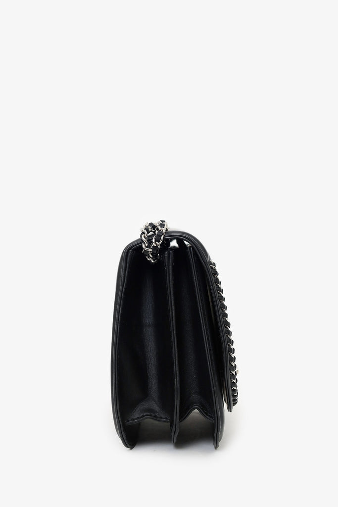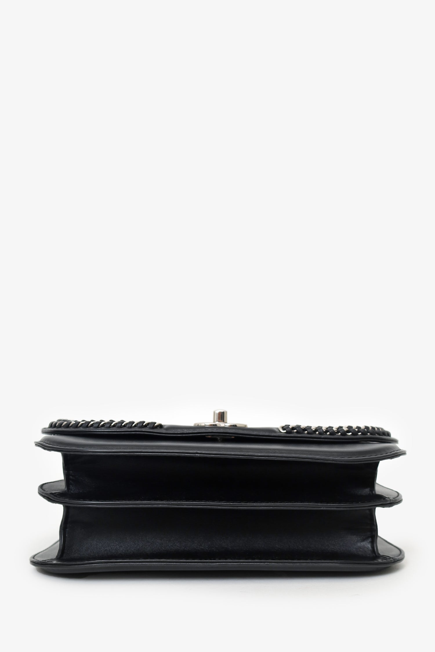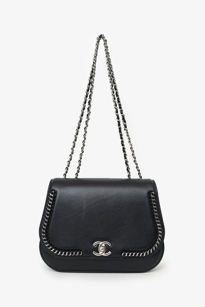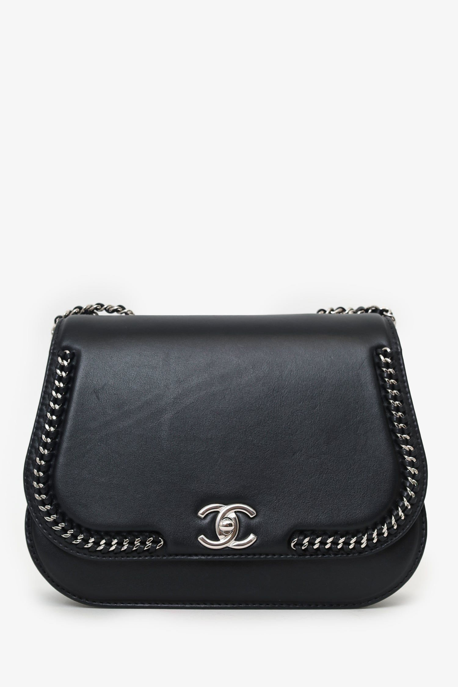 Pre-Loved Chanel 2016-2017 Black Calfskin Braided Chic Flap Bag. Front fold-over flap with turn-lock closure. Twin chainlink shoulder straps that can be pulled in and extended to one long strap. Leather-lined interior. 2 interior compartments; Interior zip pocket on rear wall. Silver-tone hardware. Tonal stitching.
