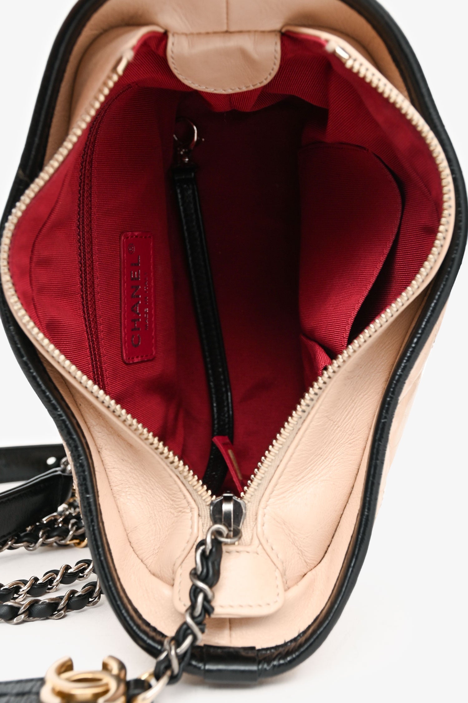 Pre-Loved Chanel™ 2017-18 Beige/Black Leather Small Gabrielle Chain Bag. Top zip closure. Red textile interior lining. 3 interior wall pockets; 2 slip and 1 with zip closure. Tri-tone hardware. Tonal stitching.