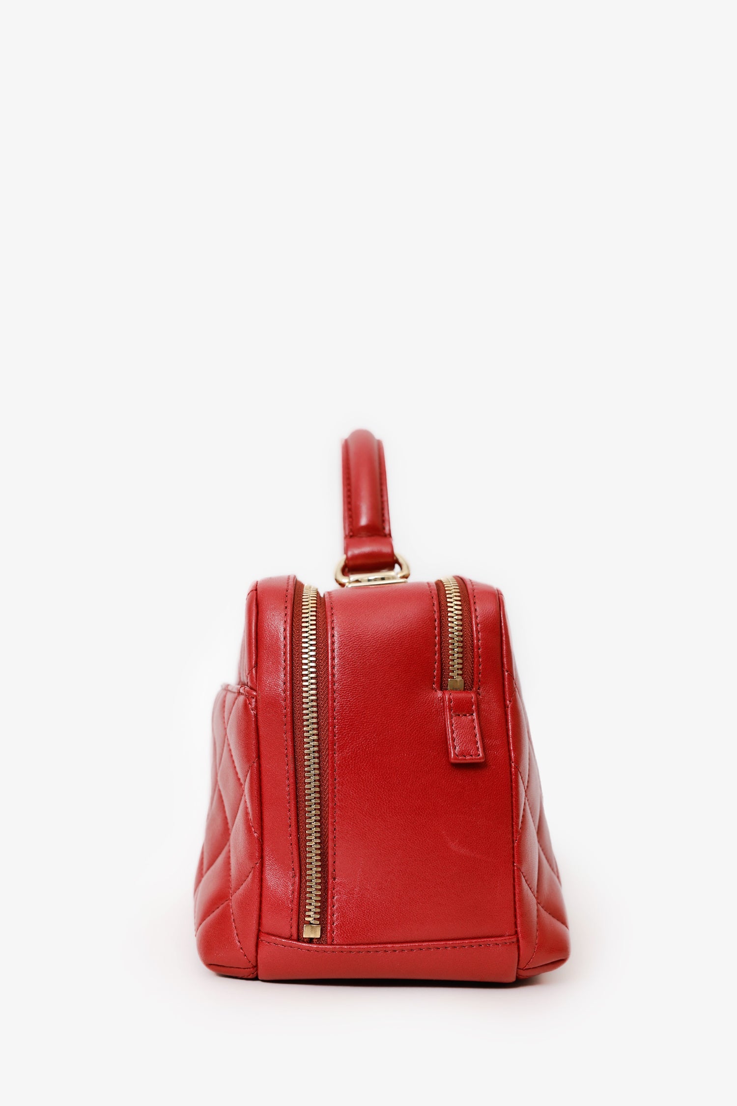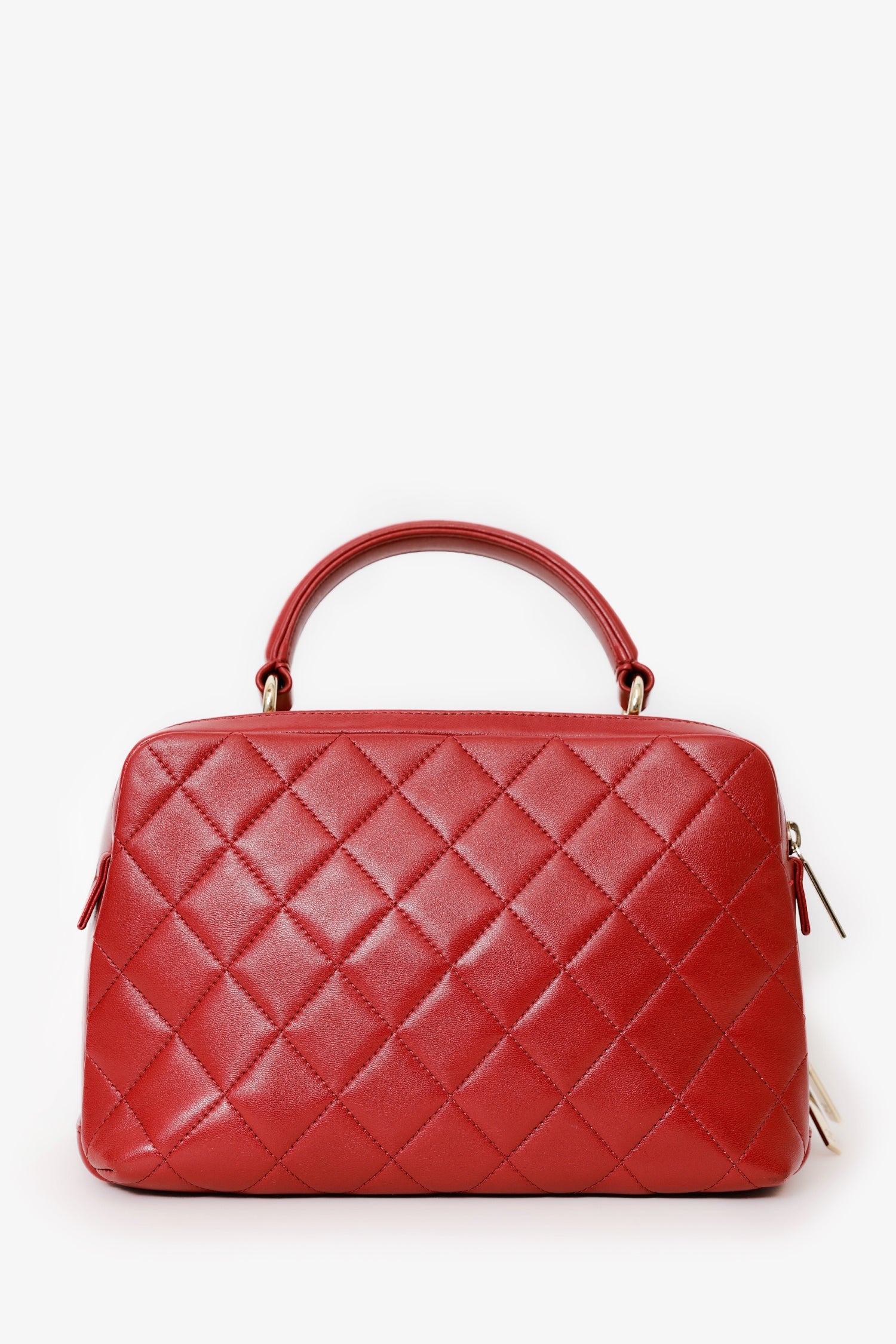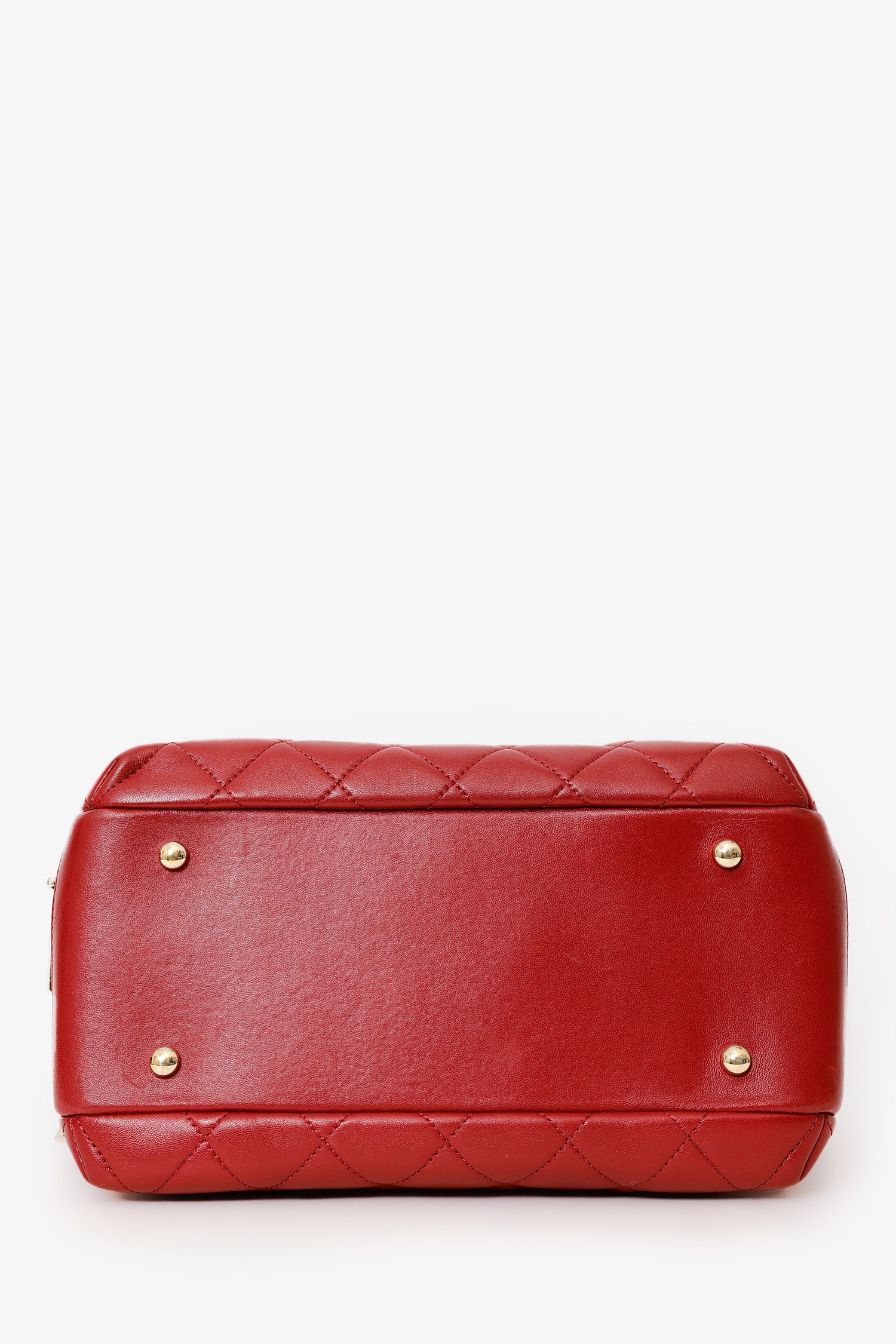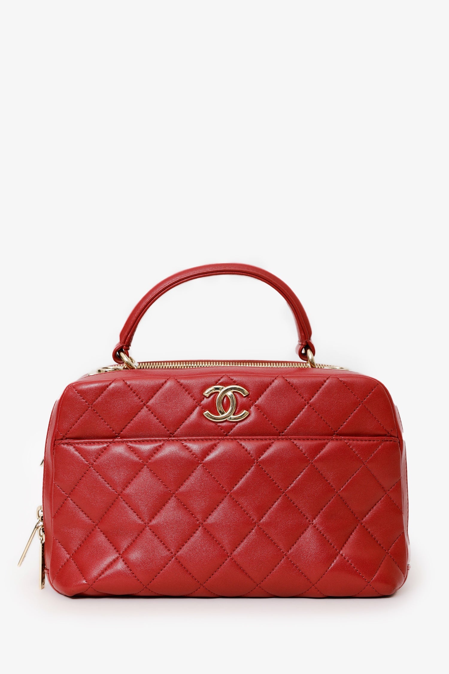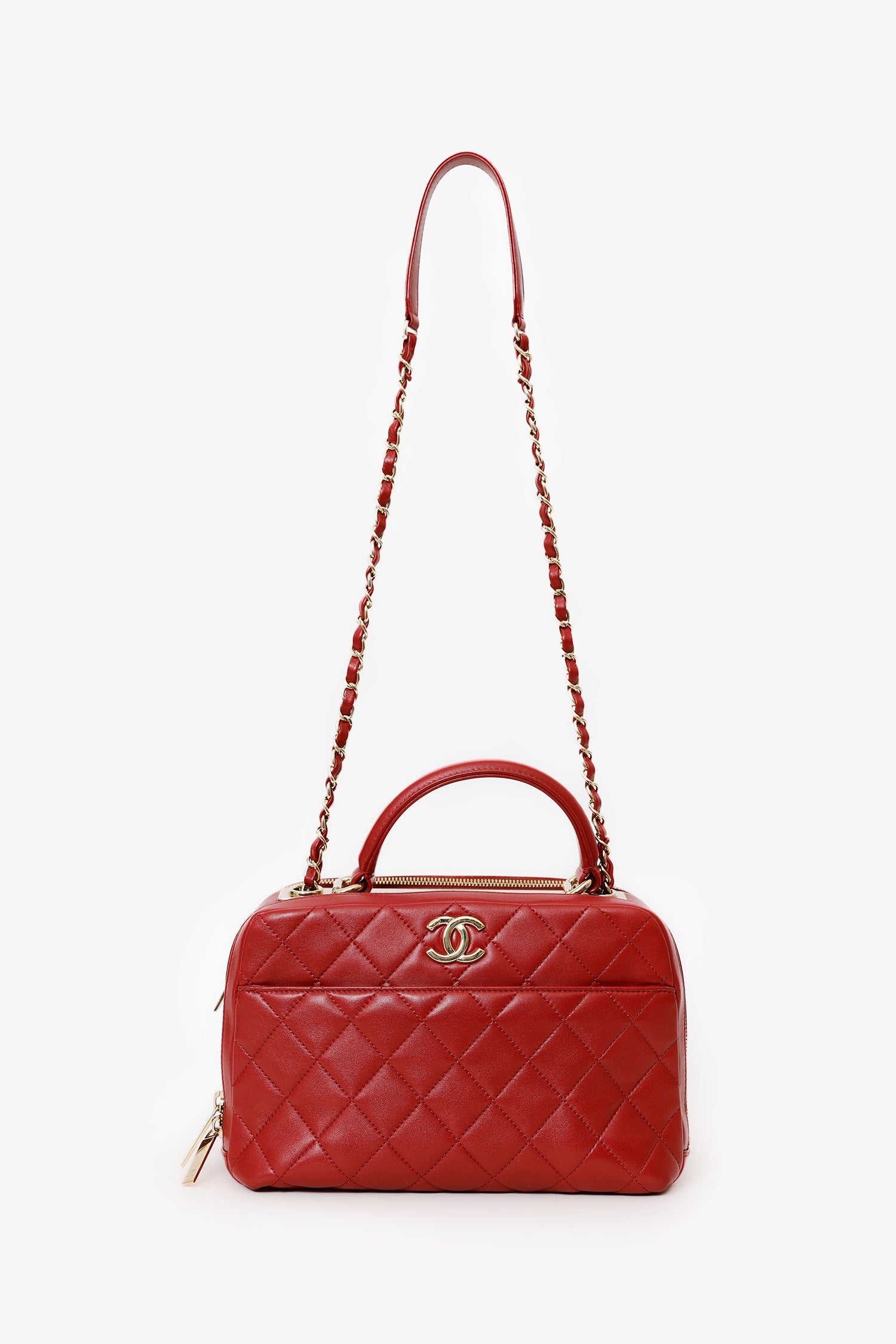 Pre-Loved Chanel™ 2017-18 Red Quilted Lambskin Trendy CC Bowling Bag. Front zip closure. Single top handle. Single leather and chainlink crossbody strap. 1 exterior slip compartment. Protective base studs. Leather lined interior. 2 Interior compartments; front compartment with 2 slip pockets and 1 lipstick compartment. Back compartment with 1 slip pocket. Gold-tone hardware. Tonal stitching.