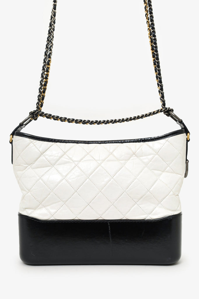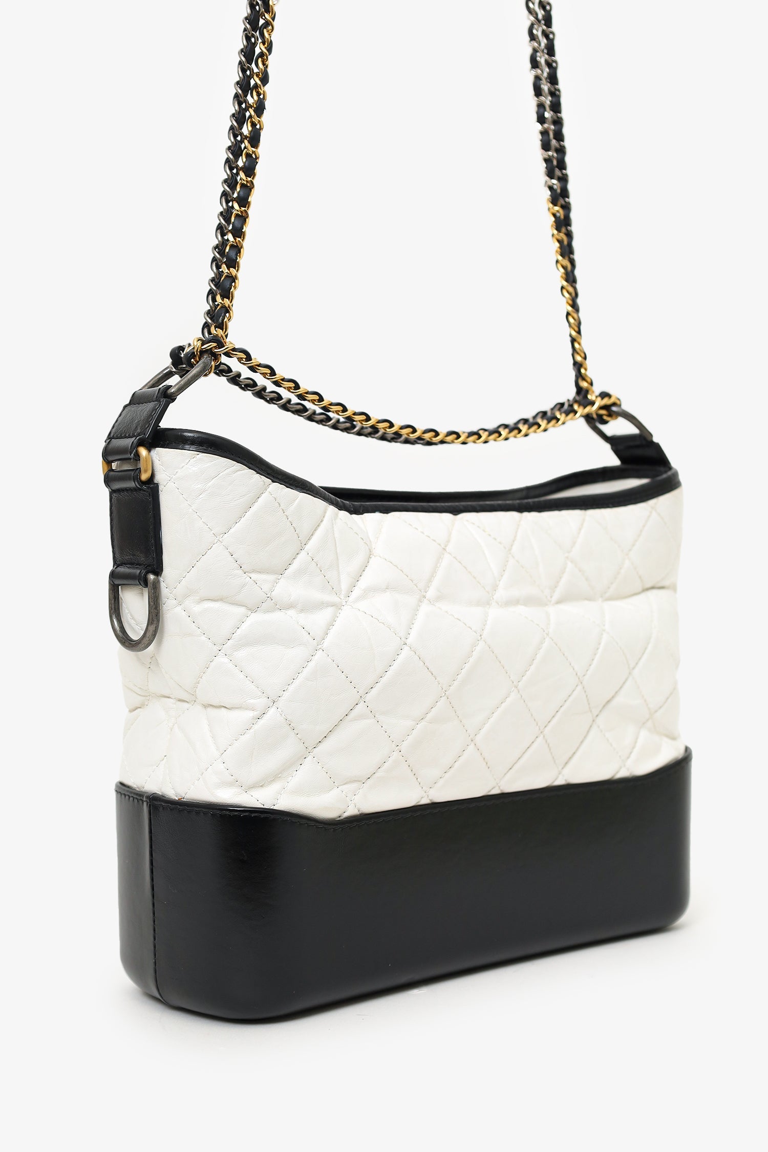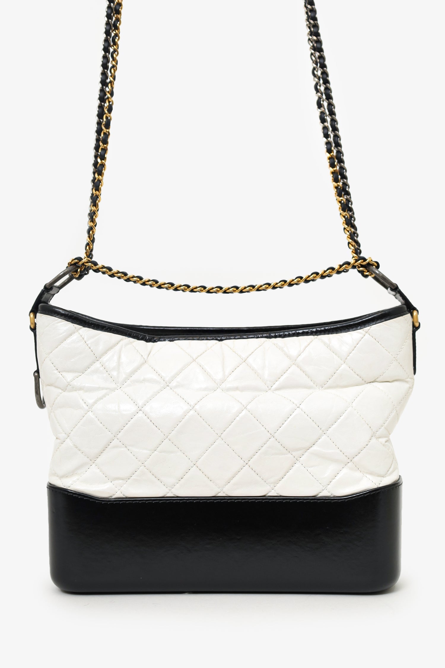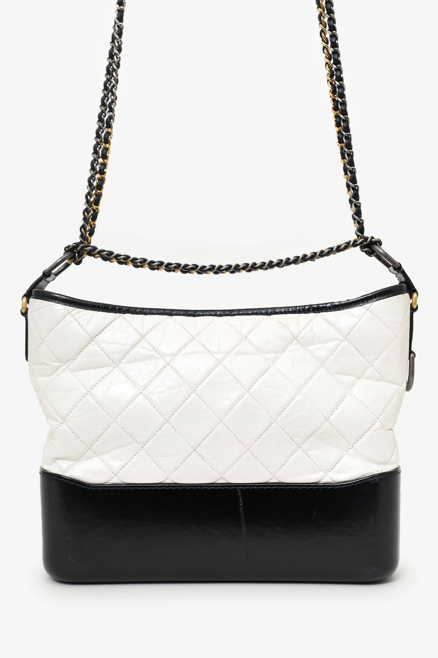 Pre-Loved Chanel™ 2017 Black/White Quilted Lambskin Leather Medium Gabrielle Bag. Top zip closure. Double twin shoulder straps that can be pulled into one long strap. Lined interior. 3 interior pockets; 2 slip and 1 zip. Gold and silver-tone hardware. Tonal stitching.