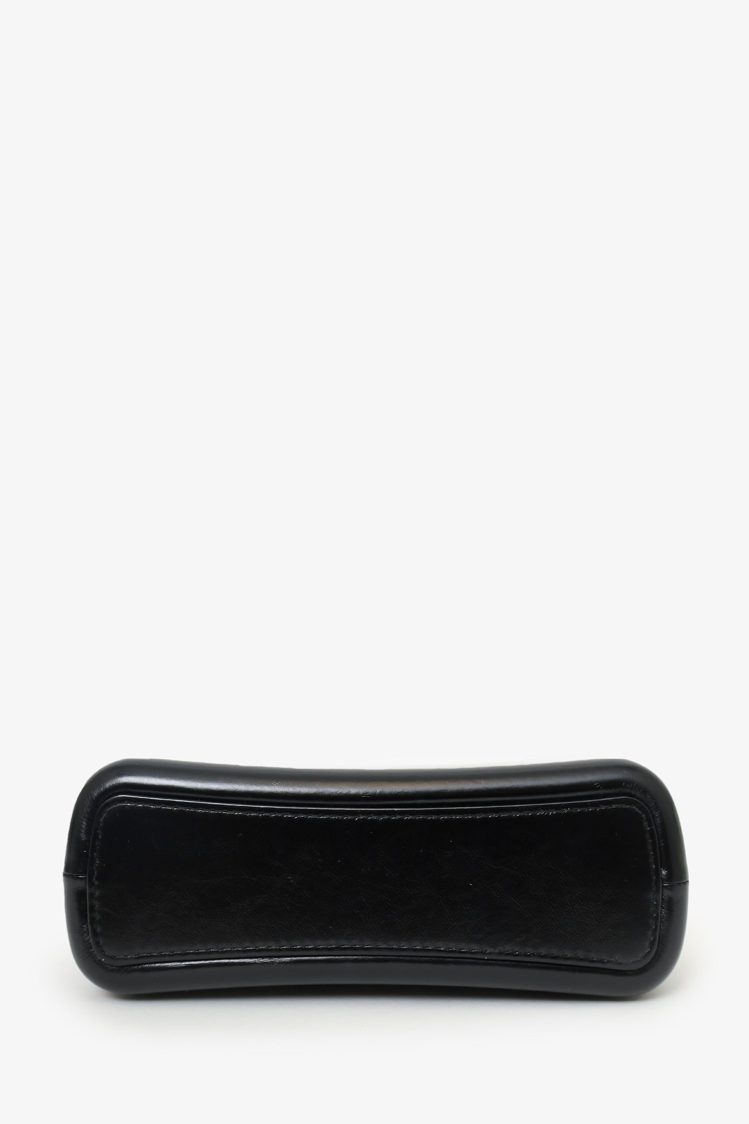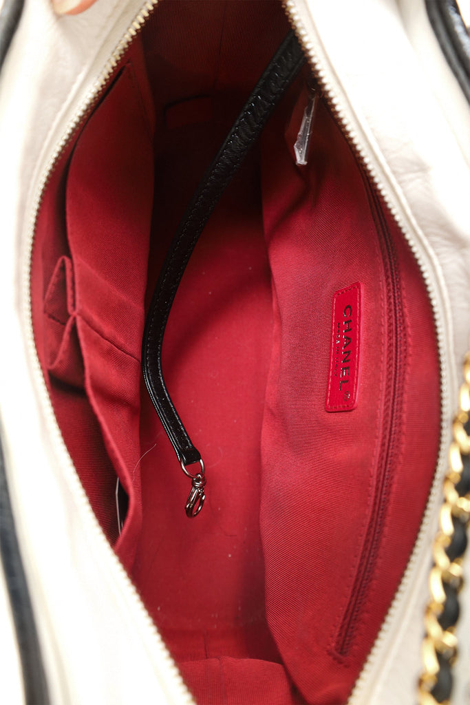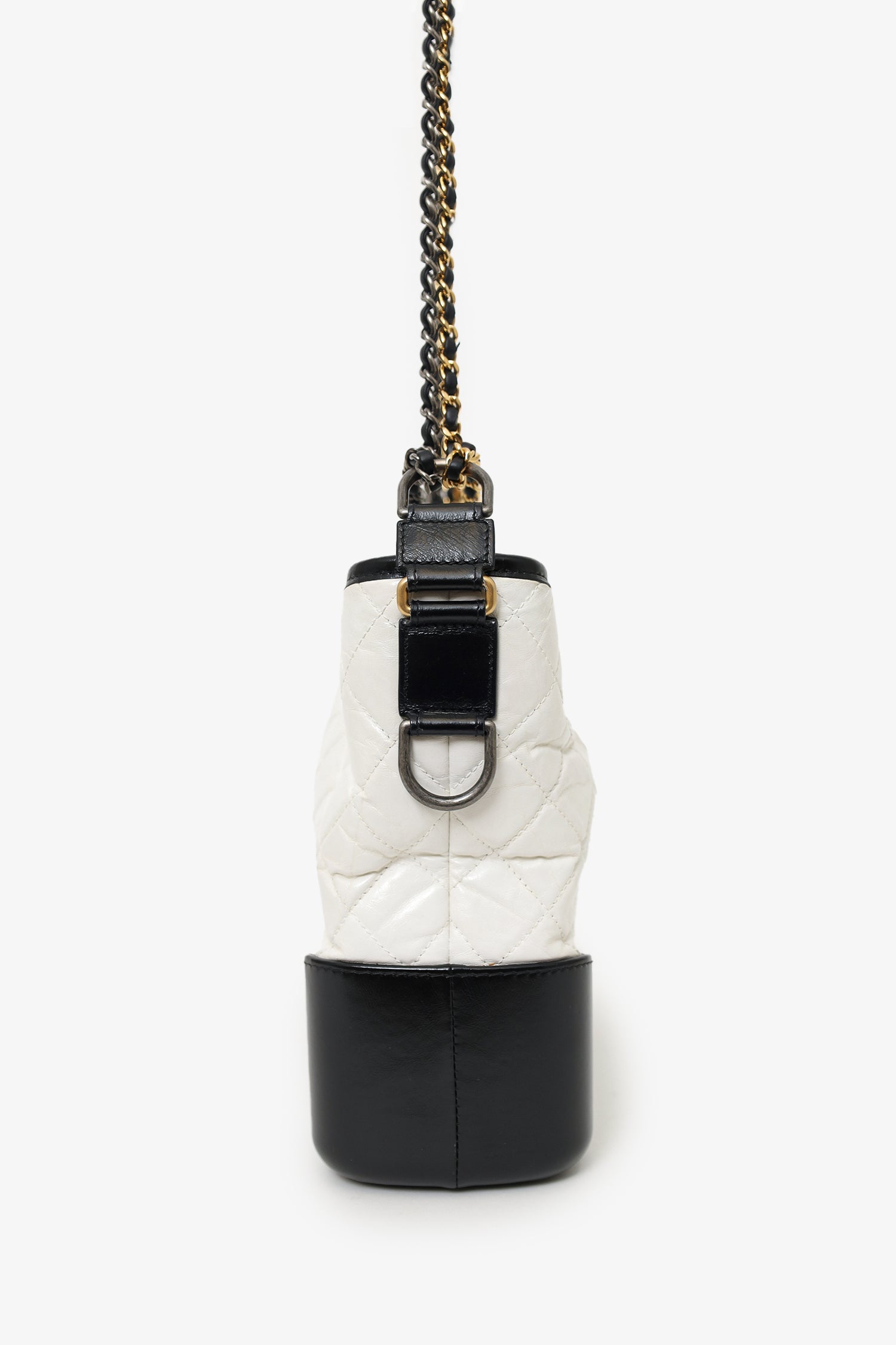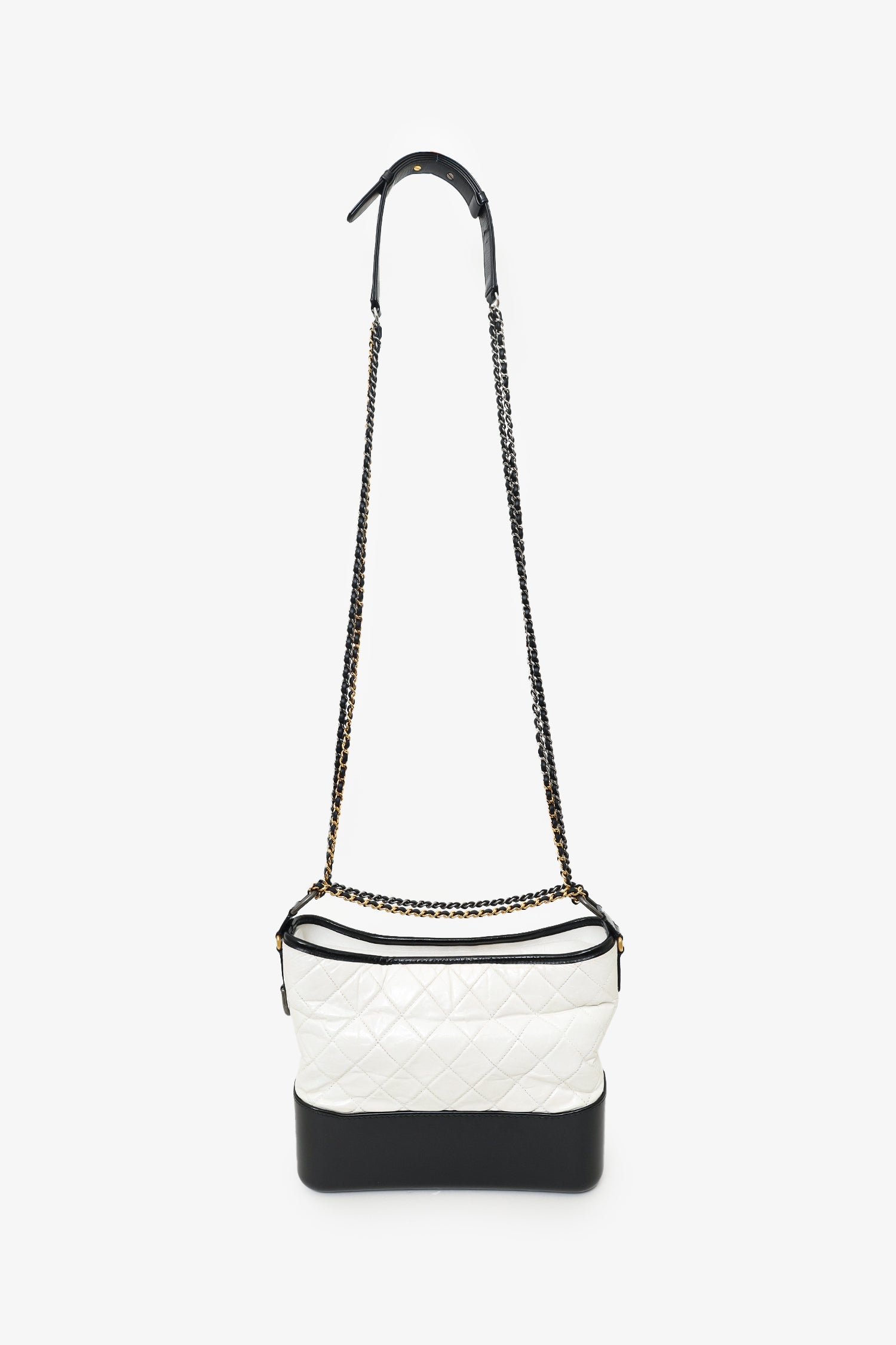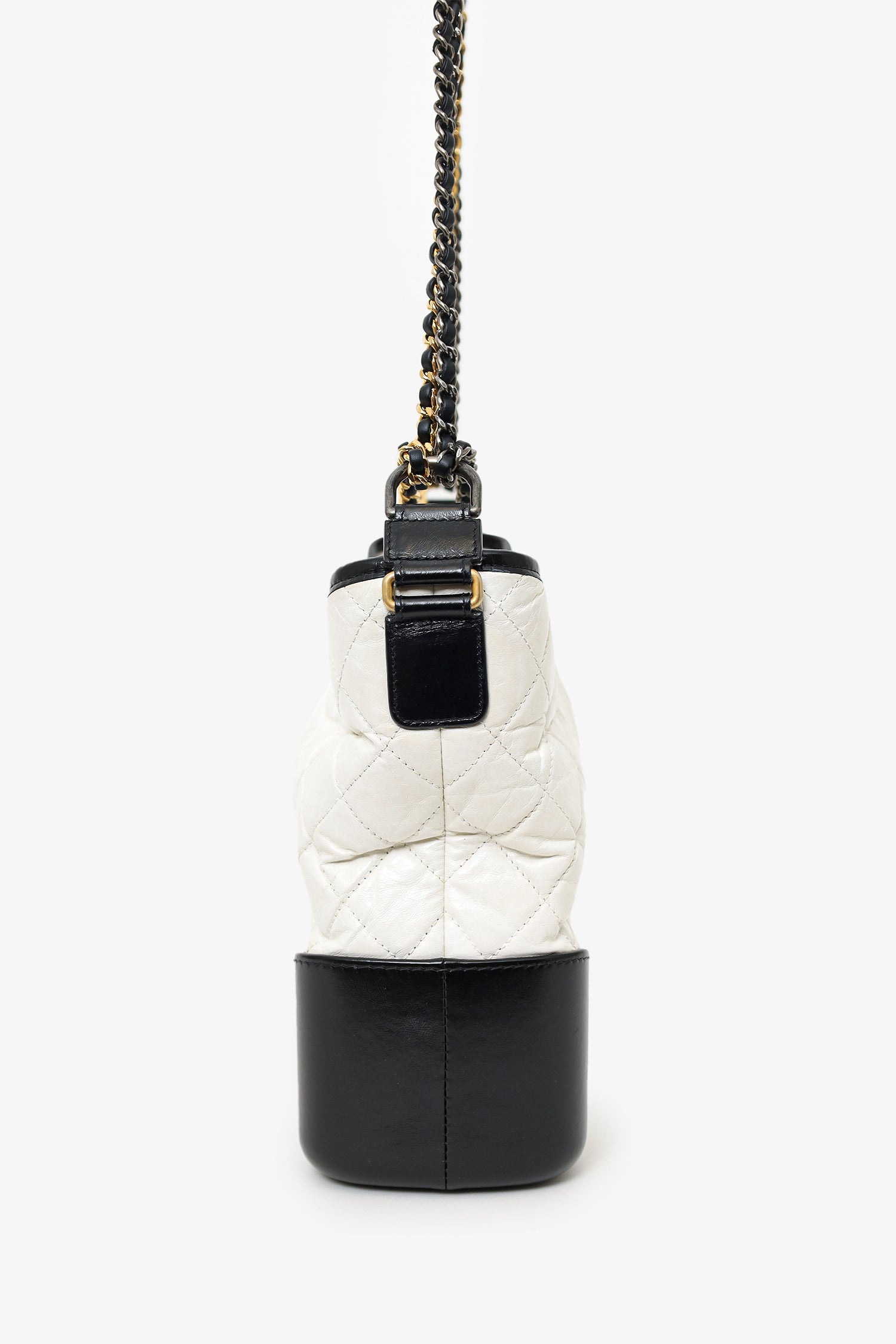 Pre-Loved Chanel™ 2017 Black/White Quilted Lambskin Leather Medium Gabrielle Bag. Top zip closure. Double twin shoulder straps that can be pulled into one long strap. Lined interior. 3 interior pockets; 2 slip and 1 zip. Gold and silver-tone hardware. Tonal stitching.