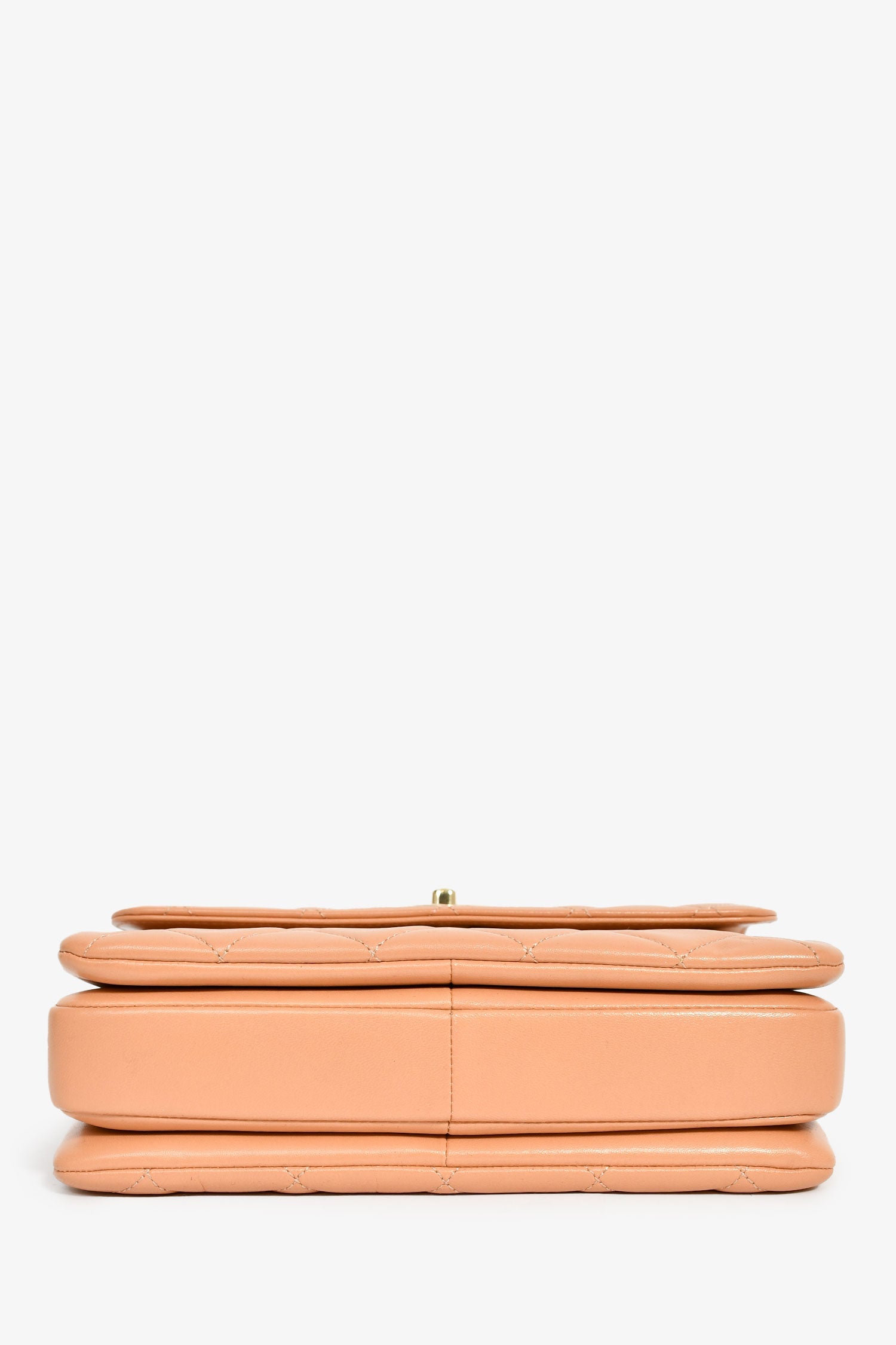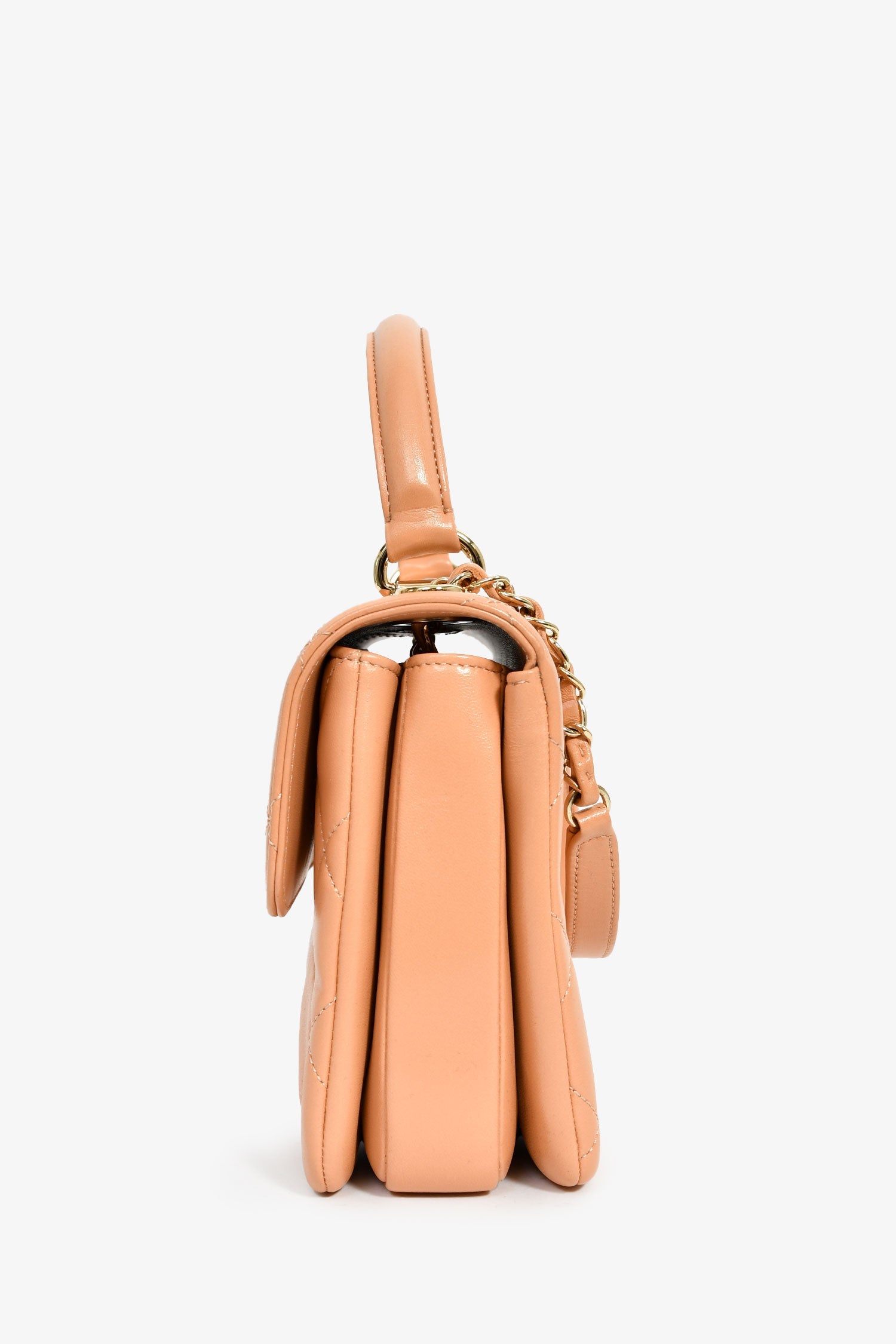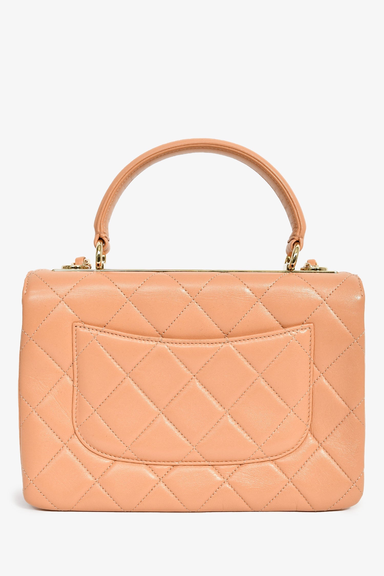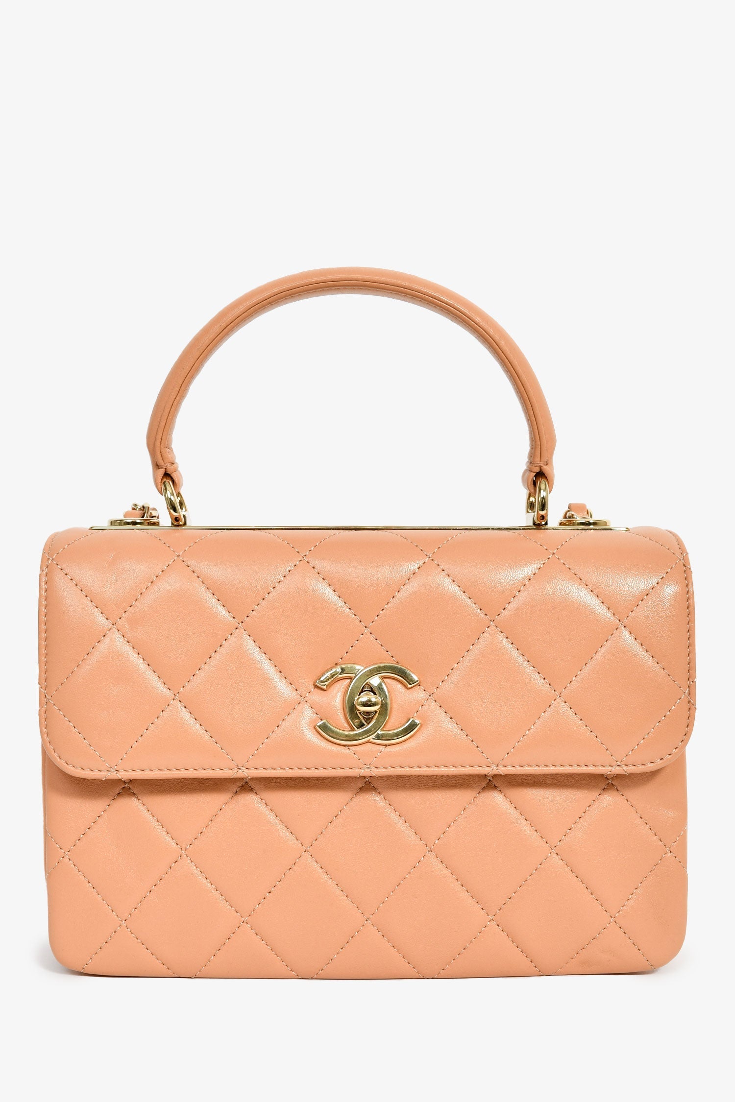 Pre-Loved Chanel™ 2017 Tan Lambskin Leather Small 'Trendy' Bag. Front fold-over flap with turn-lock closure. Top handle. Chain-link strap. Single exterior rear slip pocket. Lined interior. 3 main compartments; separated by dividers. 3 interior wall pockets; 2 slip, 1 with zip closure. Gold-tone hardware. Tonal stitching.