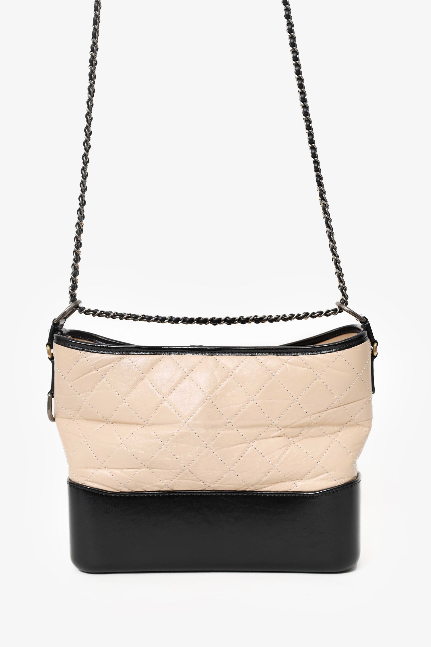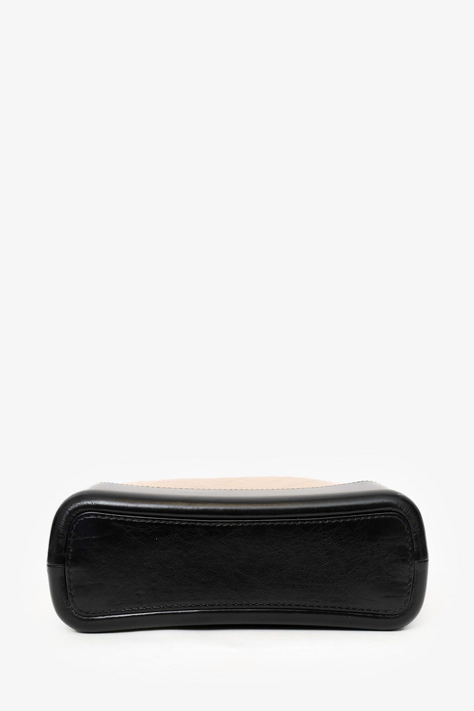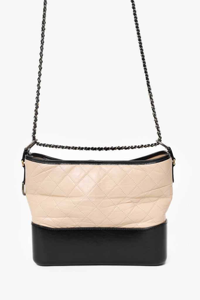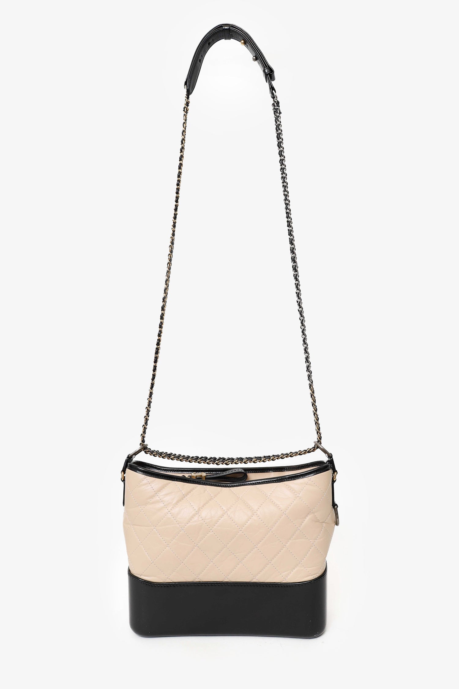 Pre-Loved Chanel™ 2018-19 Beige/Black Leather Medium Gabrielle Chain Bag. Top zip closure. Twin chainlink strap that can be pulled into one longer strap. Lined interior. 3 interior pockets; 2 slip and 1 zip. Gold and silver-tone hardware. Tonal stitching.