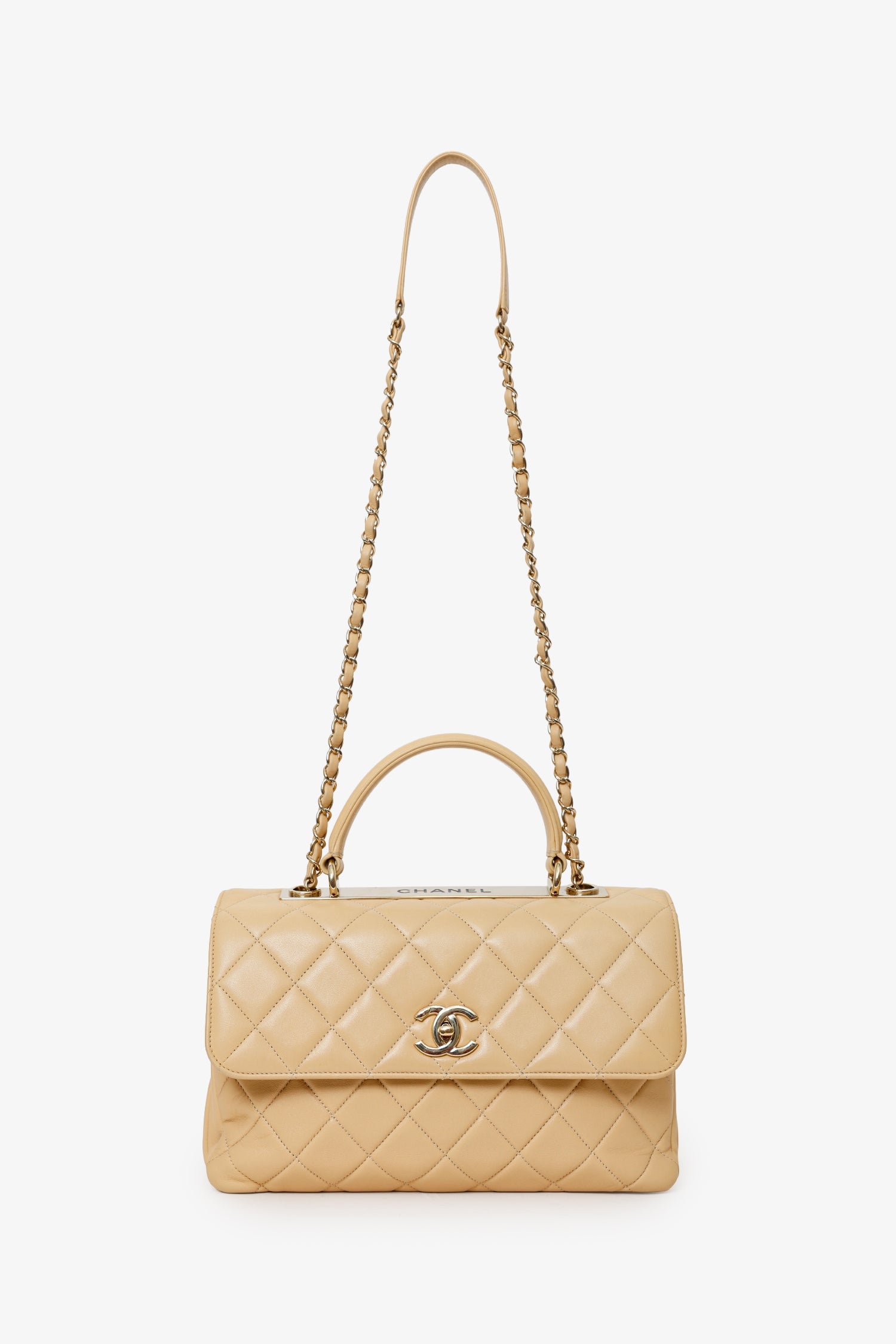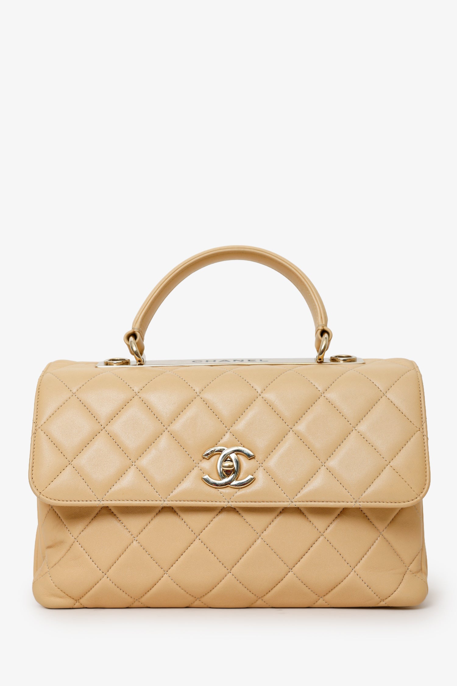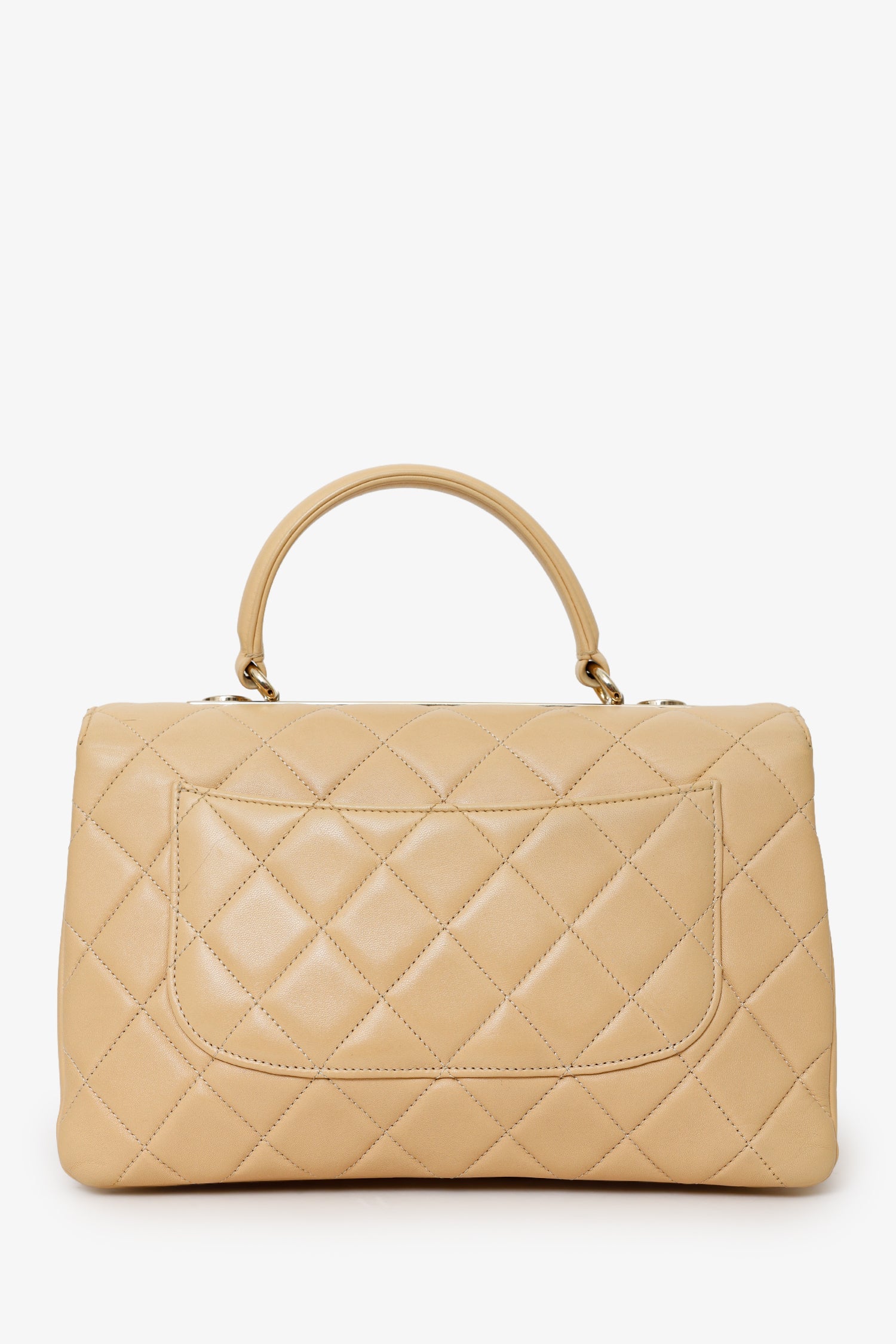 Pre-Loved Chanel™ 2018-19 Beige Quilted Lambskin Medium Trendy CC Top Handle Bag. Front fold-over flap with turn-lock closure. Top handle. Single removable chainlink shoulder strap. 1 rear exterior slip pocket. 3 interior compartments; front compartment with 2 slip pockets and 1 lipstick compartment. Middle compartment is 1 large open pocket. Rear compartment with 1 rear wall zip pocket. Gold-tone hardware. Tonal stitching.