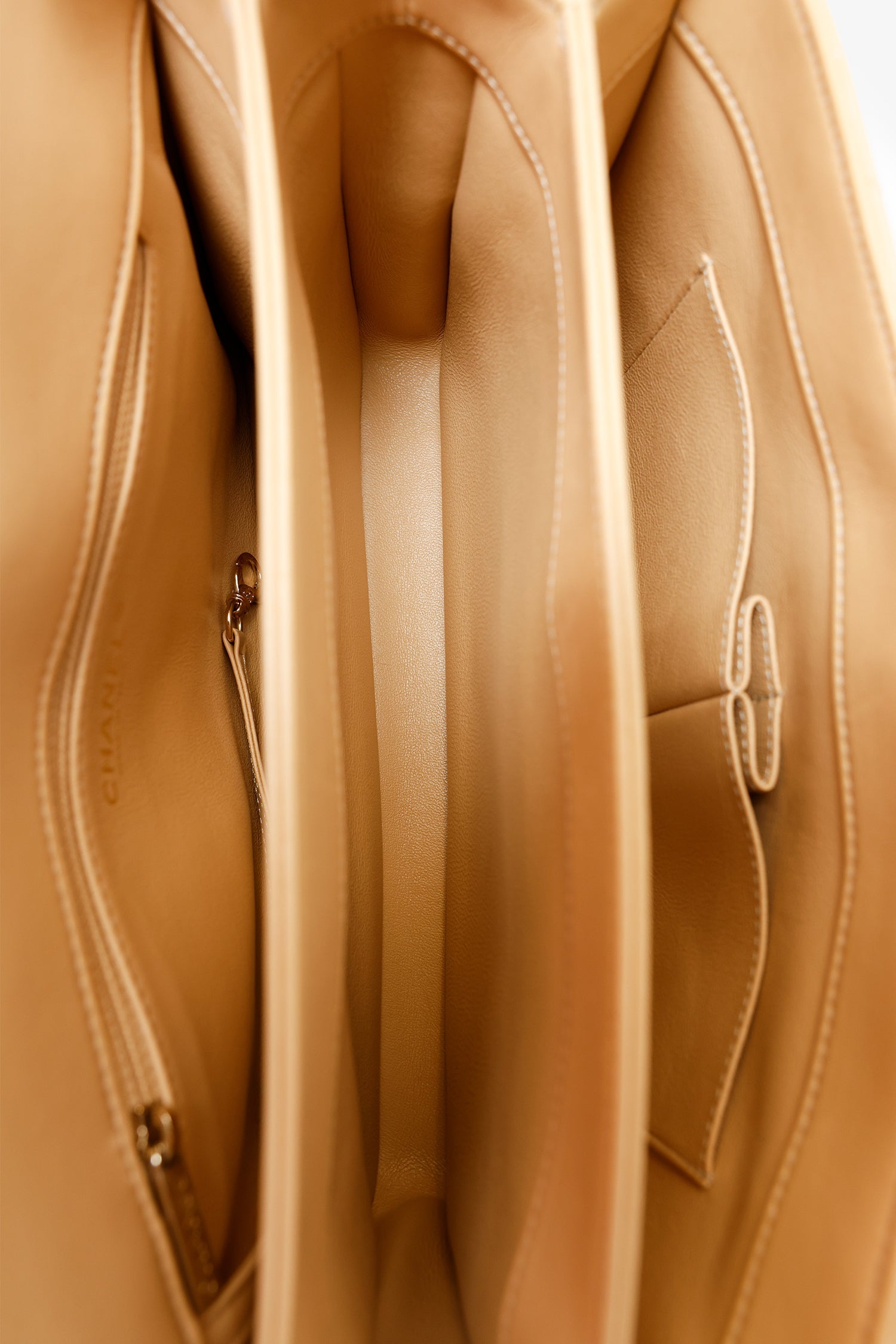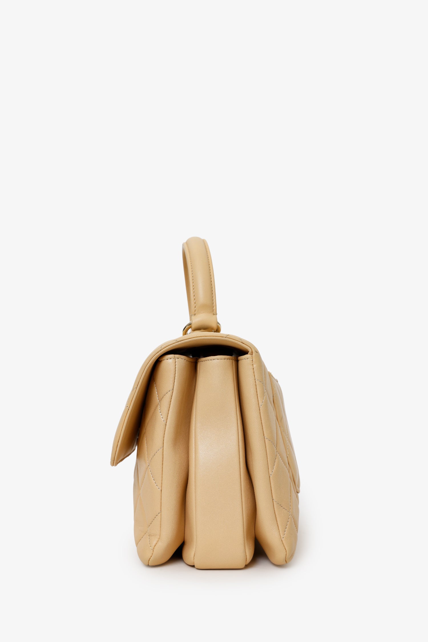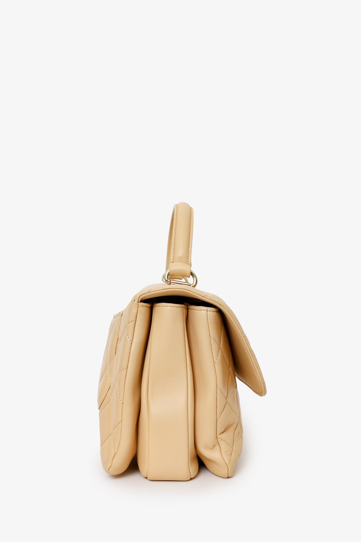 Pre-Loved Chanel™ 2018-19 Beige Quilted Lambskin Medium Trendy CC Top Handle Bag. Front fold-over flap with turn-lock closure. Top handle. Single removable chainlink shoulder strap. 1 rear exterior slip pocket. 3 interior compartments; front compartment with 2 slip pockets and 1 lipstick compartment. Middle compartment is 1 large open pocket. Rear compartment with 1 rear wall zip pocket. Gold-tone hardware. Tonal stitching.