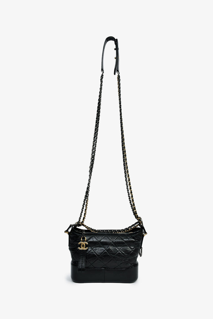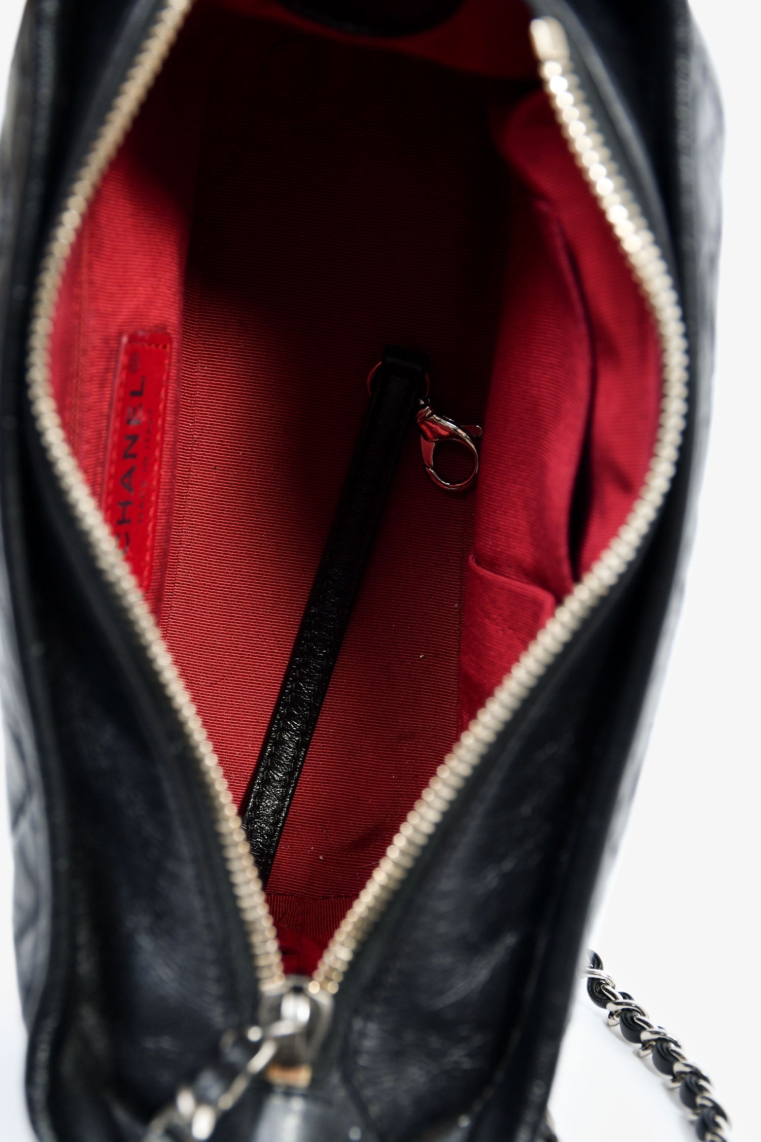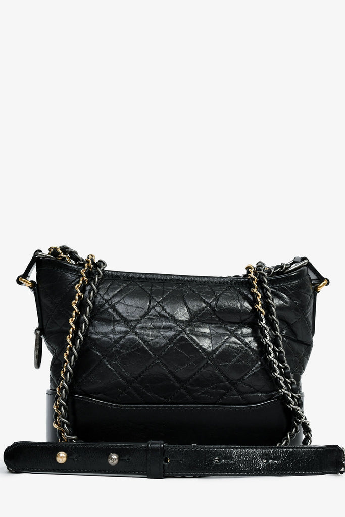 Pre-Loved Chanel™ 2018 Black Lambskin Leather Small Gabrielle Bag. Top zip closure. Twin chainlink strap that can be pulled into one longer strap. Red textile interior lining. Two interior wall pockets; one slip and one with zip closure. Gold and silver-tone hardware. Tonal stitching.