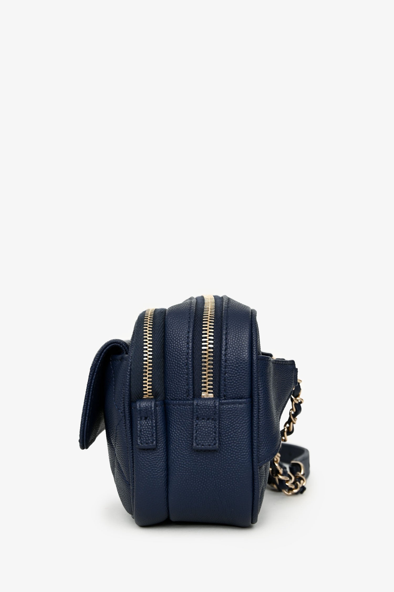 Pre-Loved Chanel™ 2019-20 Navy Caviar Leather Casual Trip Belt Bag with Insert. Top zip closure. Adjustable chain link strap with buckle closure. Single slip pocket in the front. 2 interior compartments with zip closure. Single wall slip pocket with a zip. Includes removable insert. Gold-tone hardware. Tonal stitching.