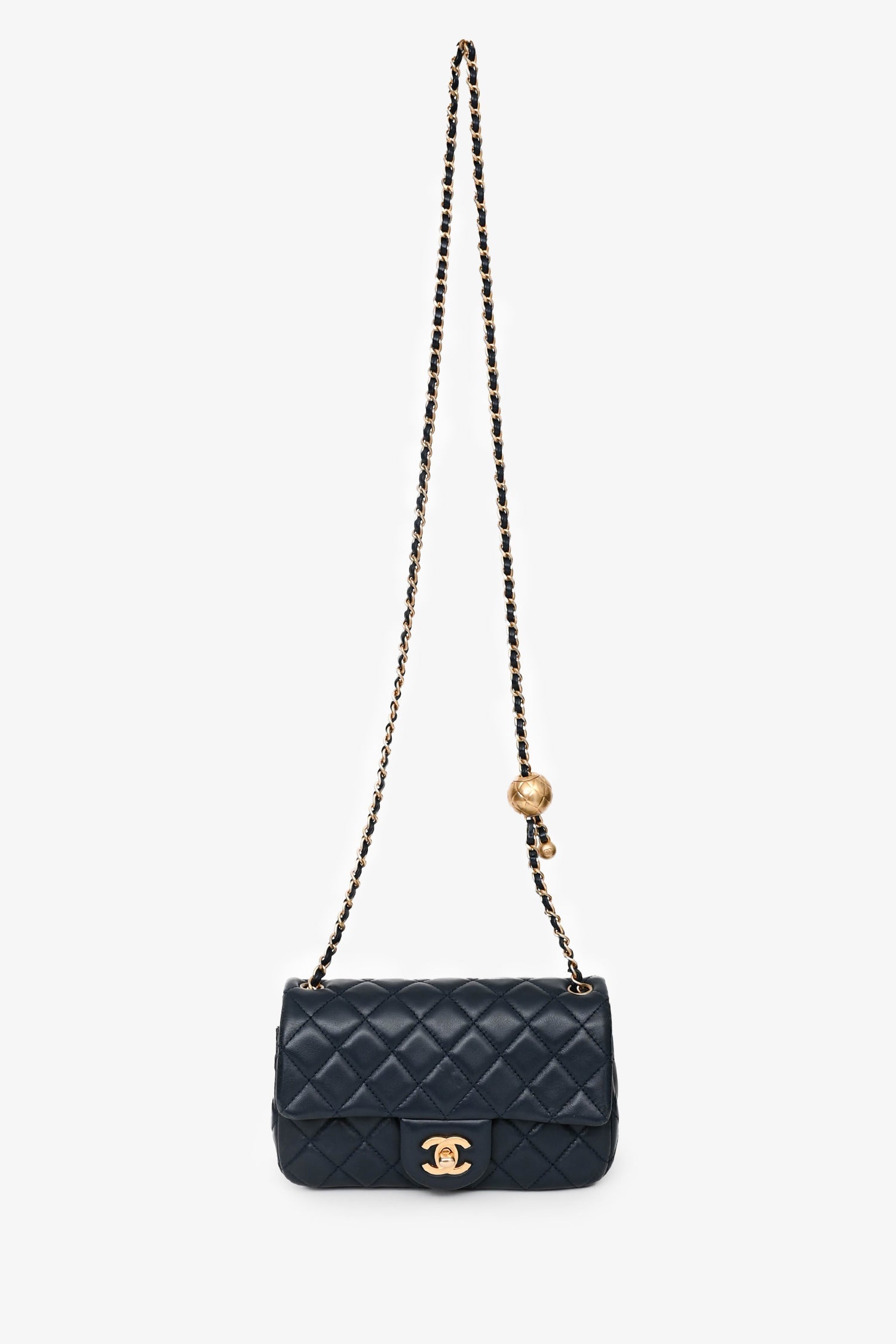 Pre-Loved Chanel™ 2019-20 Navy Lambskin Leather Mini Rectangular Pearl Crush Flap Bag. Diamond quilted lambskin exterior. Adjustable leather-threaded chain shoulder strap. Front flap with signature CC turn-lock closure. Leather-lined interior with slip and zipped pockets. Exterior slip pocket. Gold-tone hardware. Tonal stitching.
