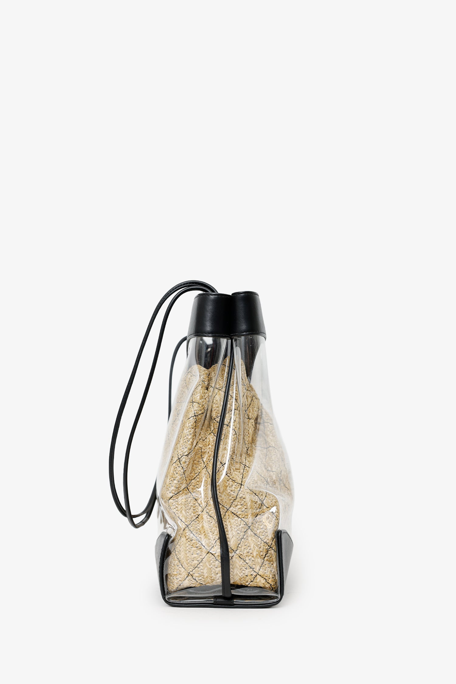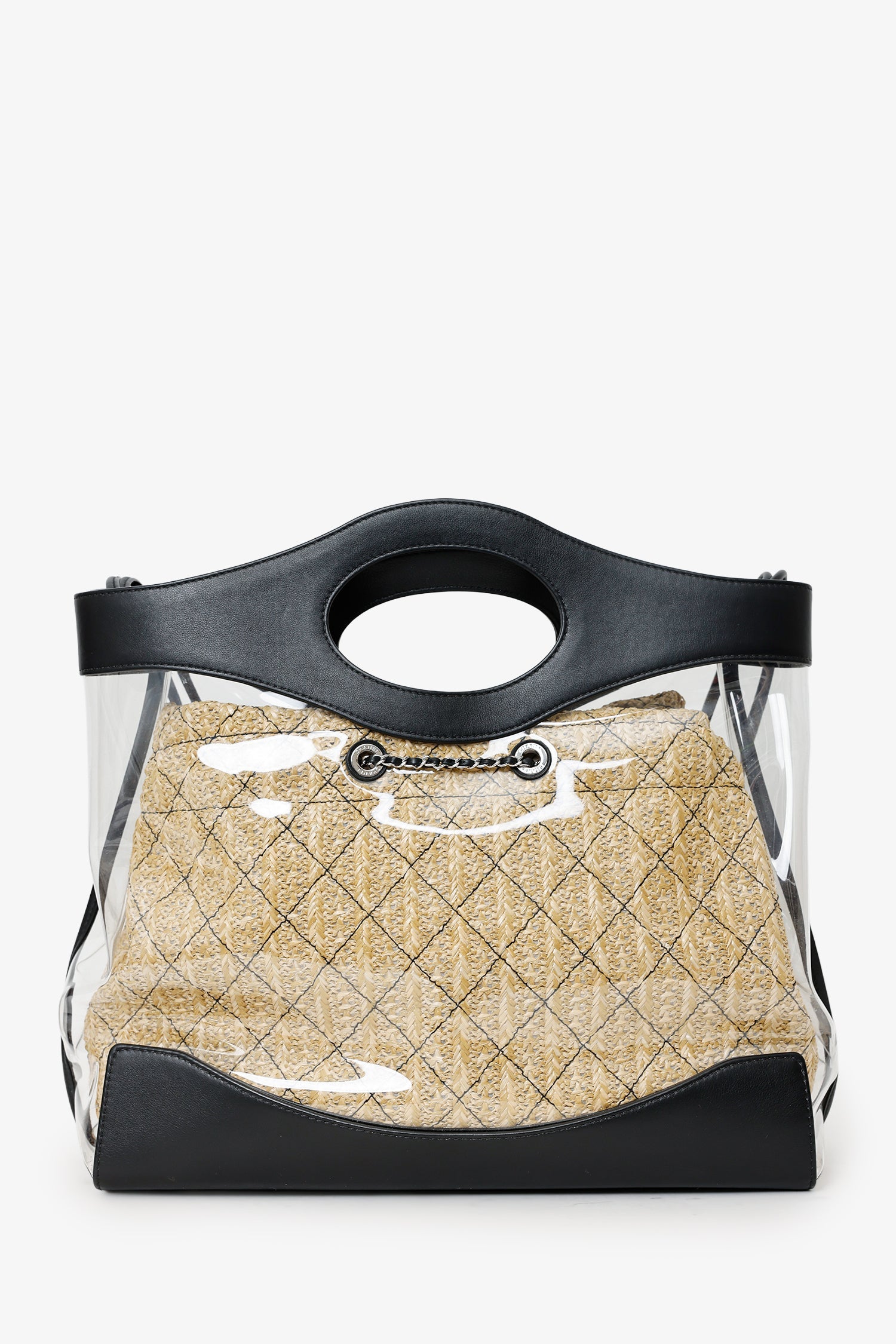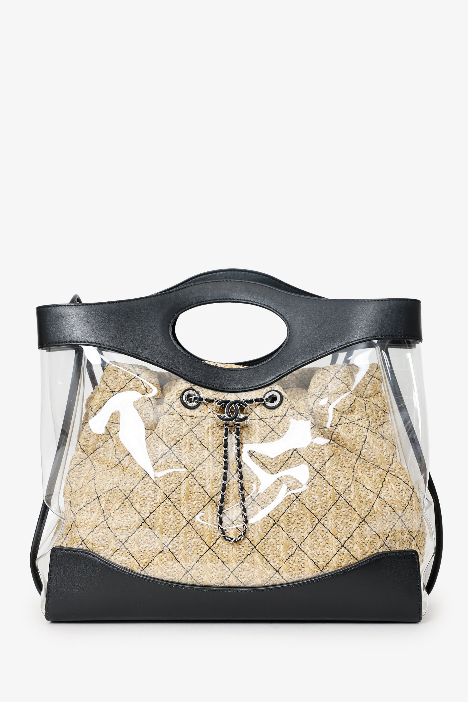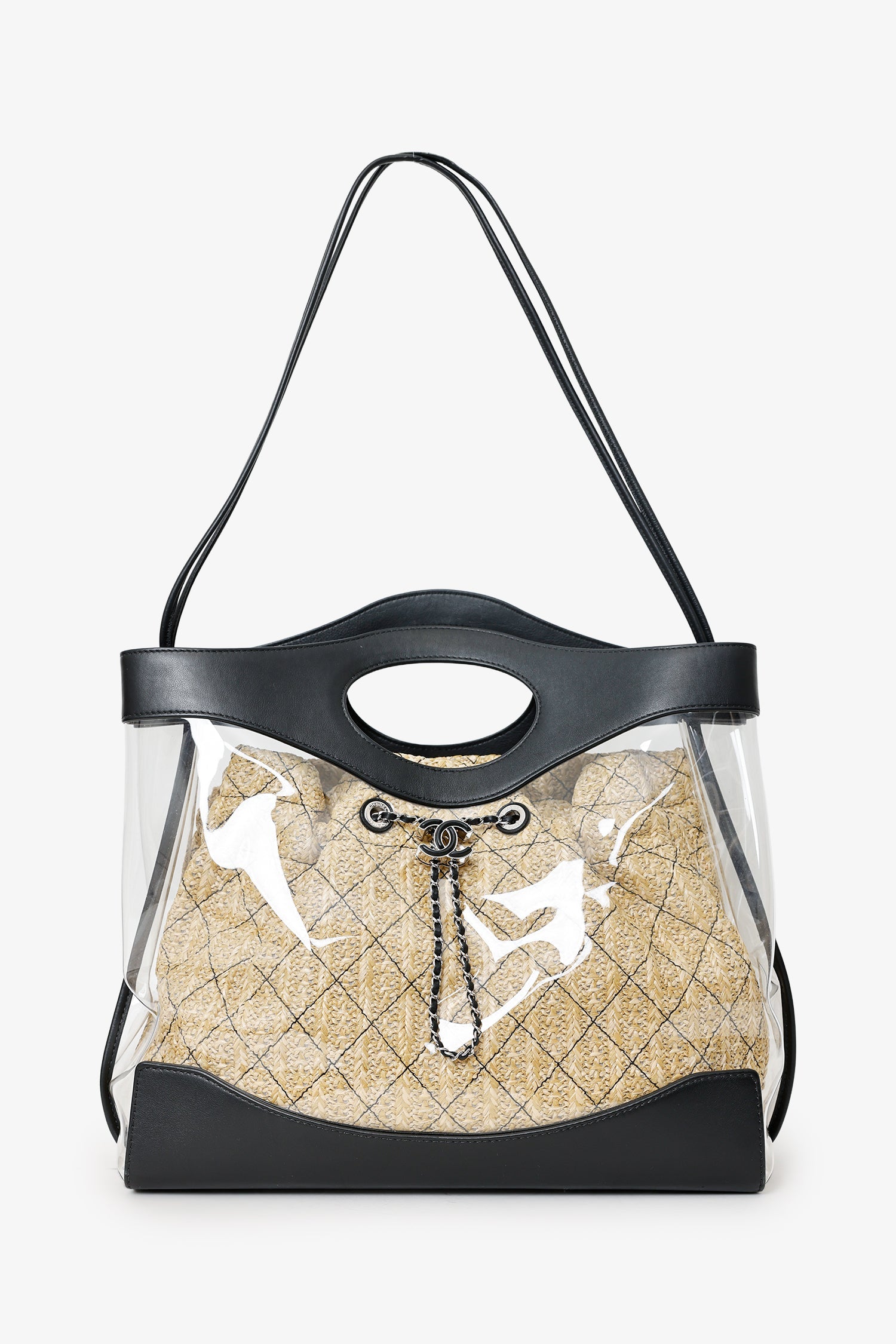 Pre-Loved Chanel™ 2019 Black PVC Raffia 31 Shopping Bag. Top open. Twin top handles. Twin shoulder straps. Protective base studs. Lined interior. Single rear wall pocket with zip closure. Silver-tone hardware. Tonal stitching.