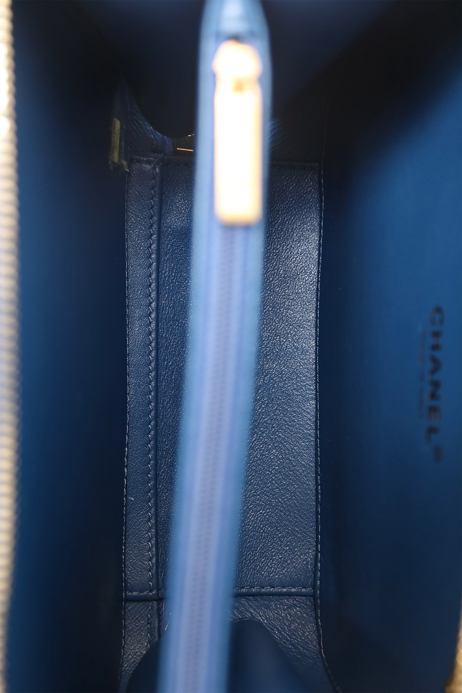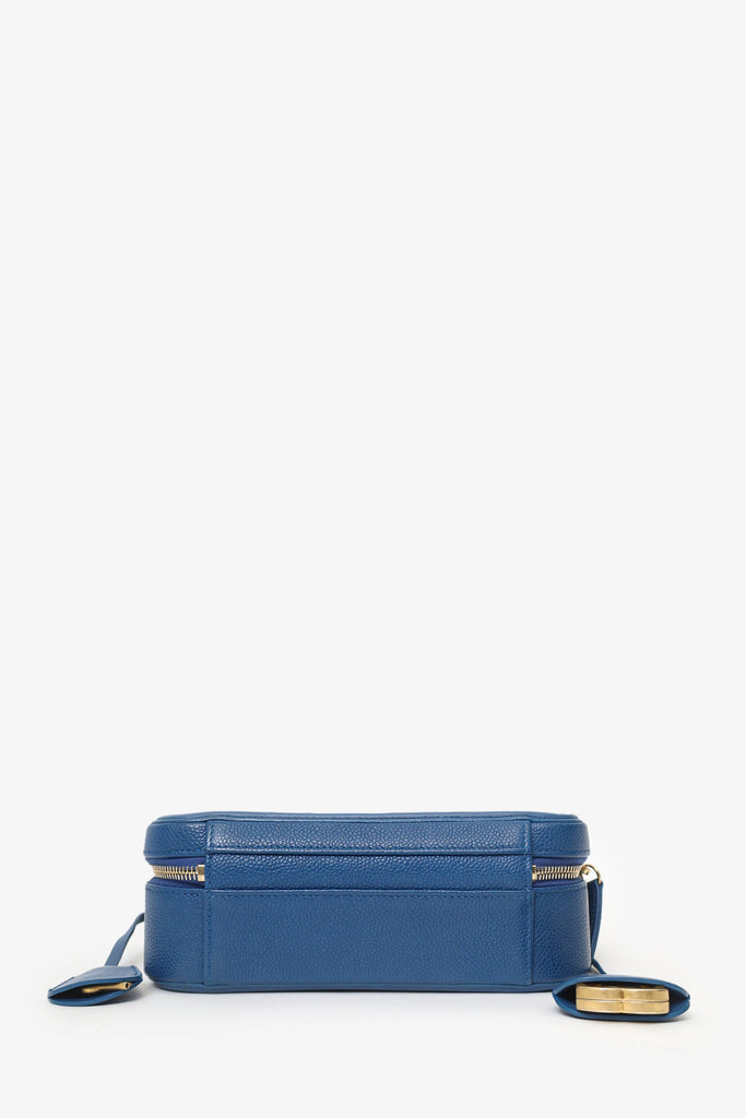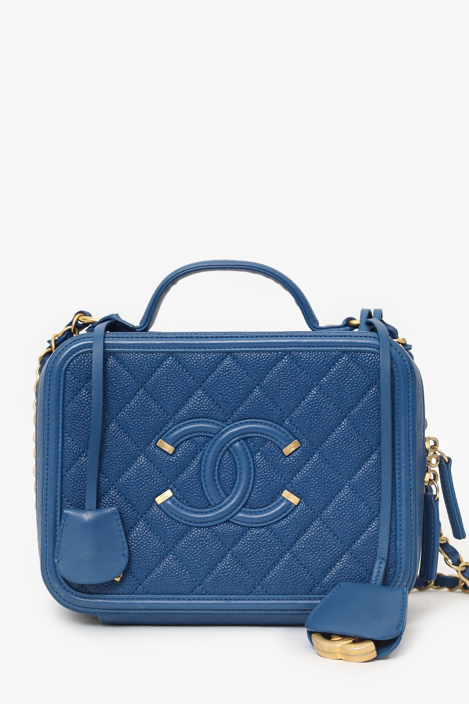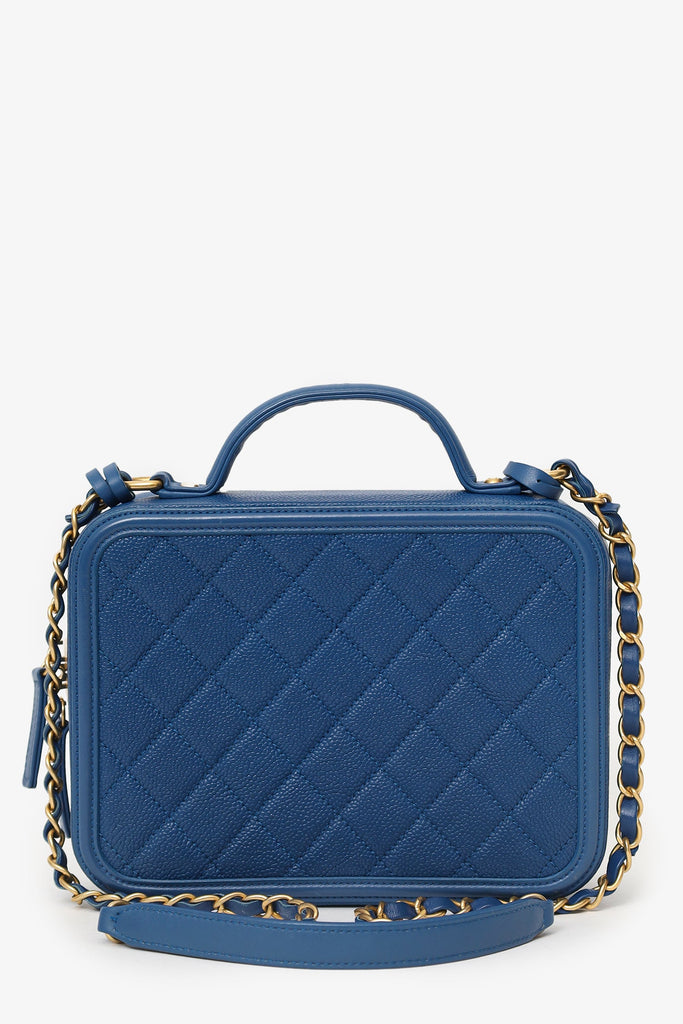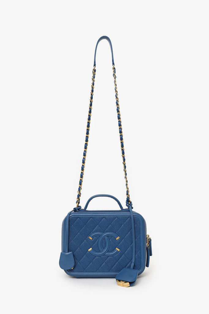 Pre-Loved Chanel™ 2019 Blue Caviar Quilted Small CC Filigree Vanity Case. 2-way top zip closure. Top handle. Chainlink and leather shoulder strap with removable bag tags. Lined interior with 4 pockets; 2 slip, and 2 zip. Gold-tone hardware. Tonal stitching.