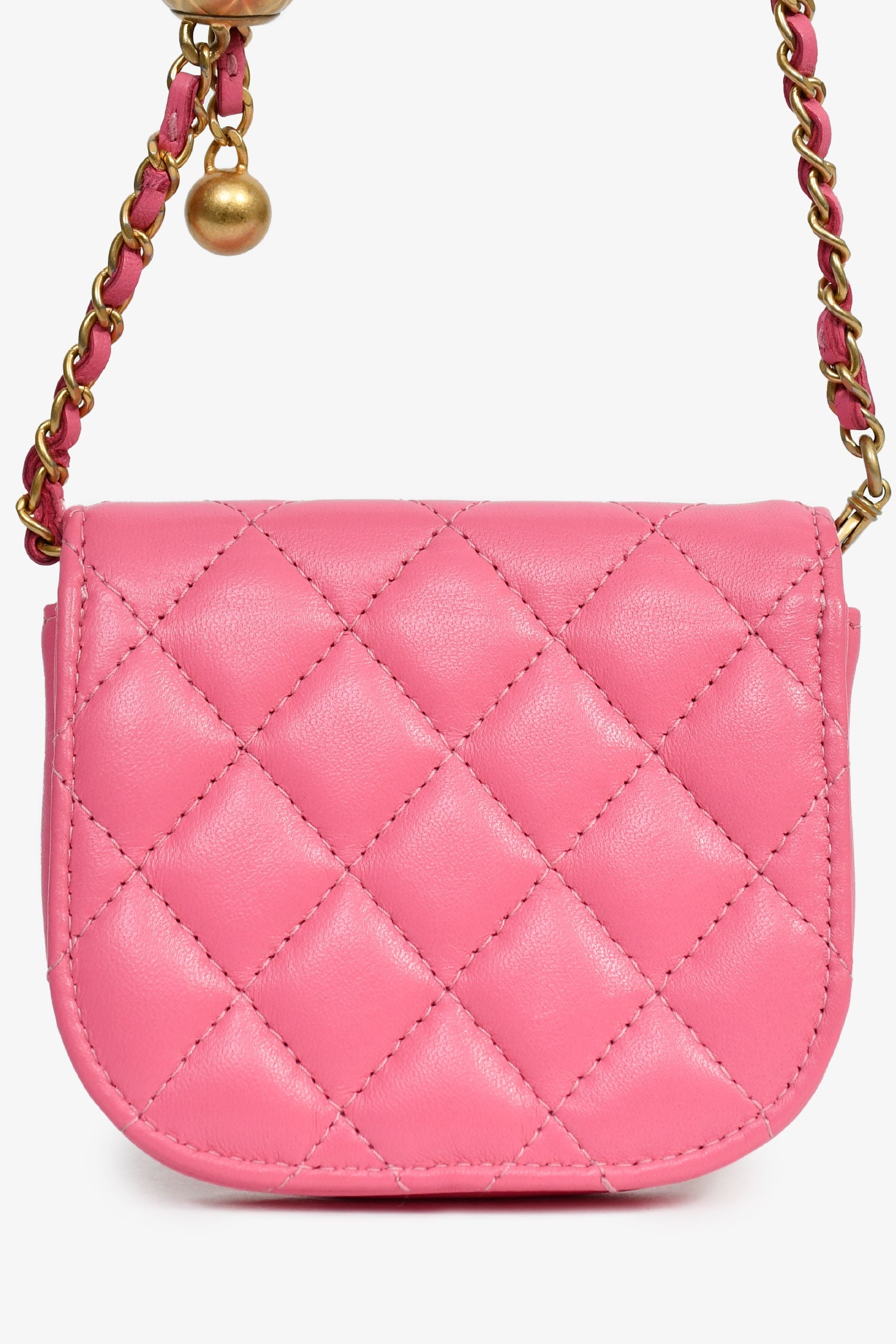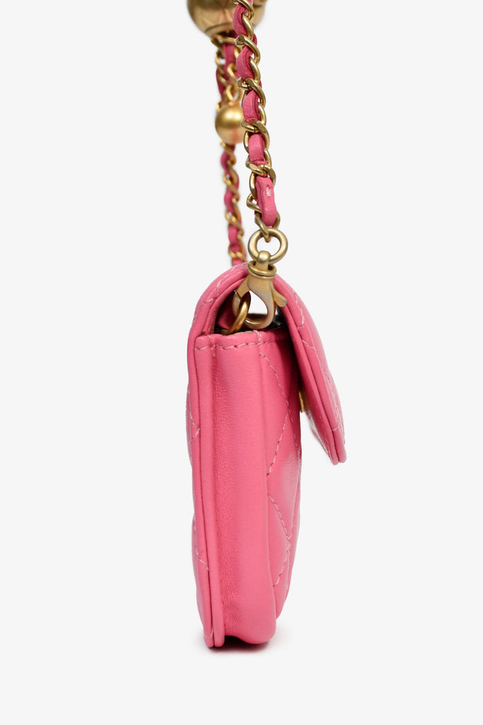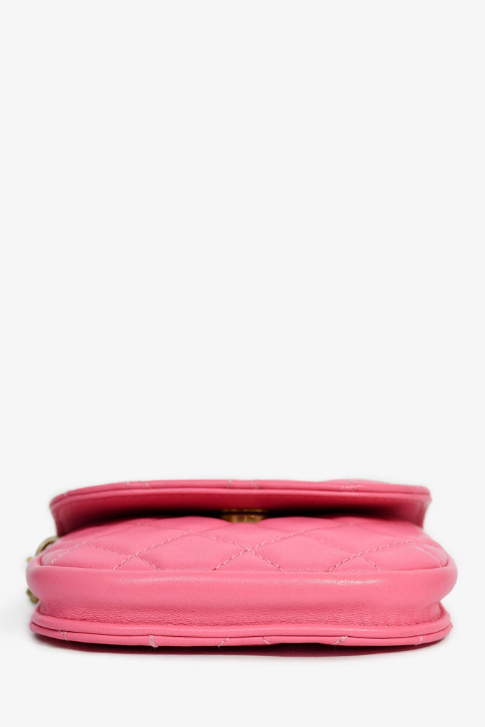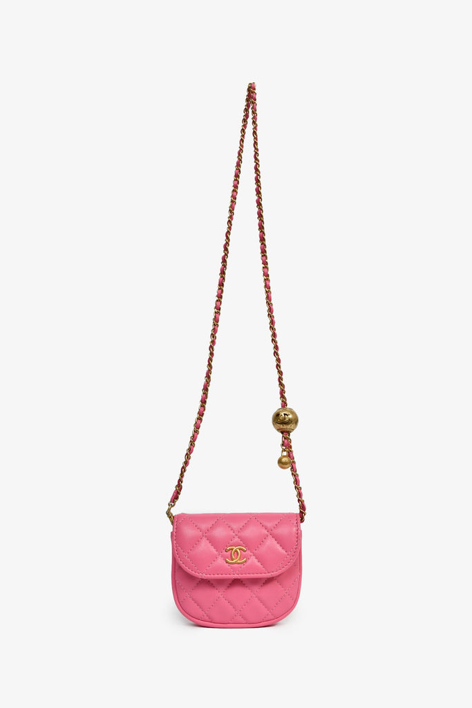 Pre-Loved Chanel™ 2019 Pink Lambskin Mini Pearl Crush Waist Bag. Front fold-over flap with snap-button closure. Adjustable chainlink strap with leather detail. Canvas-lined interior. Gold-tone hardware. Tonal stitching.