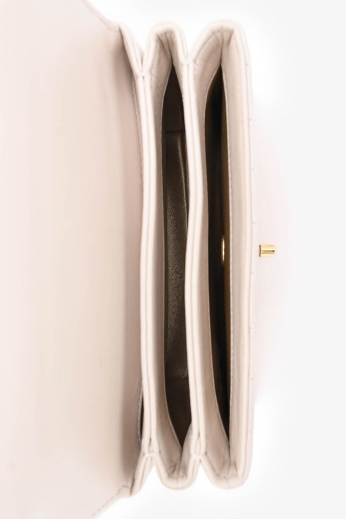 Pre-Loved Chanel™ 2020 Beige Lambskin Mini Top Handle Bag with Quilted Gold Hardware. Front flap with a turn lock closure. Three interior compartments. Leather-lined interior. One slip pocket in the third interior compartment. Logo detailing underneath the top handle. Signature chain shoulder strap with leather shoulder pad. Gold-tone hardware. Tonal stitching.