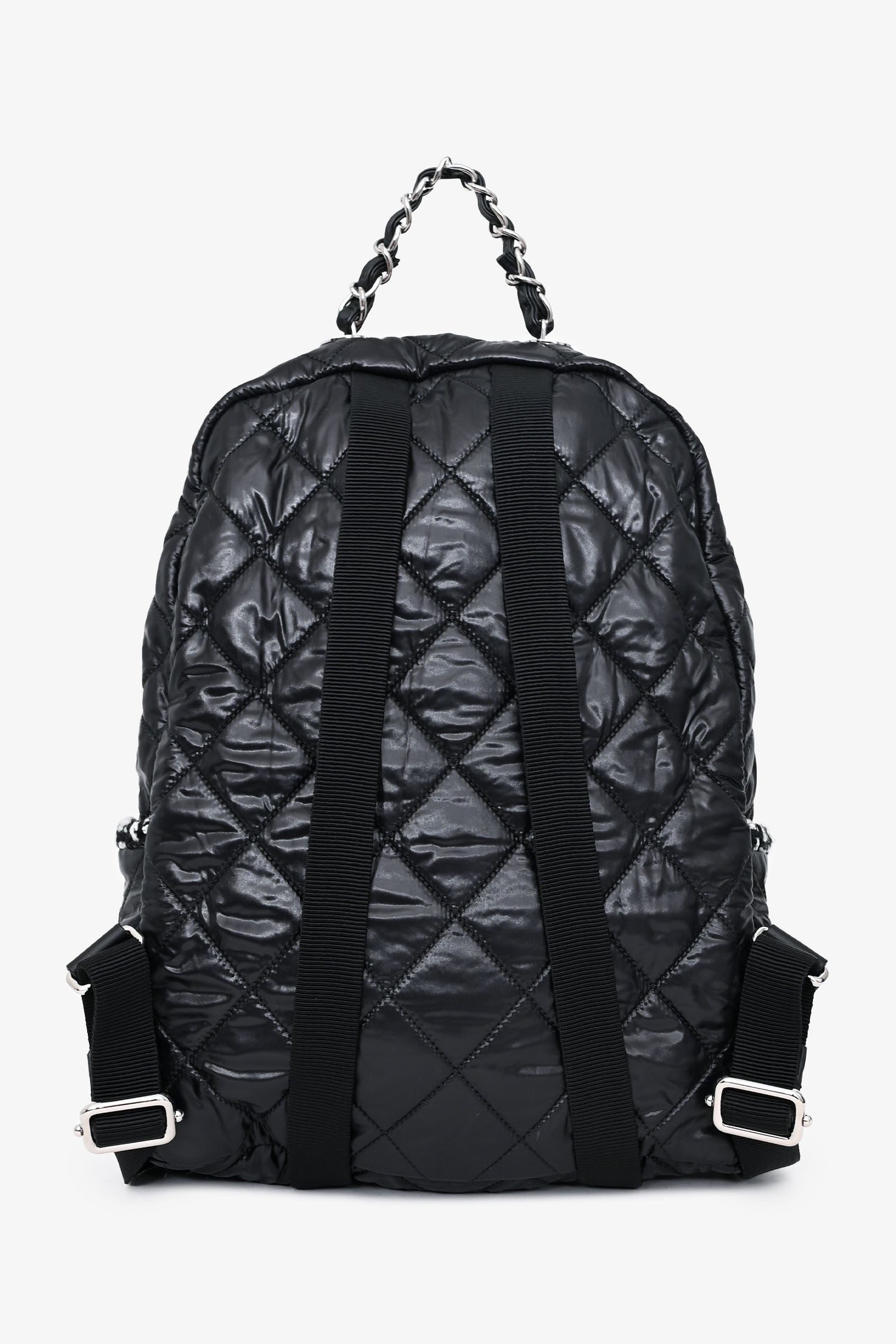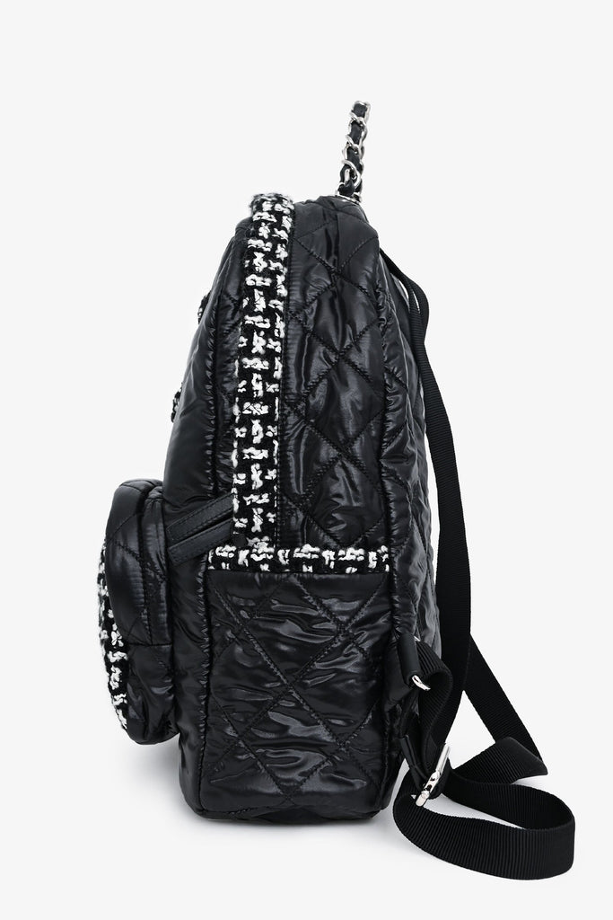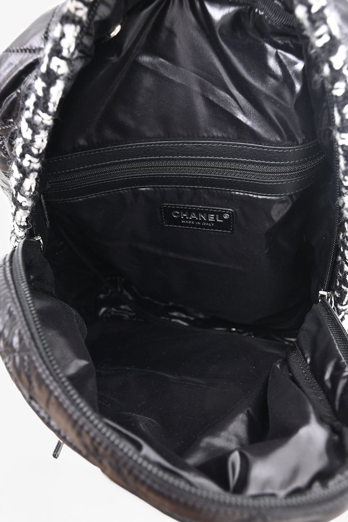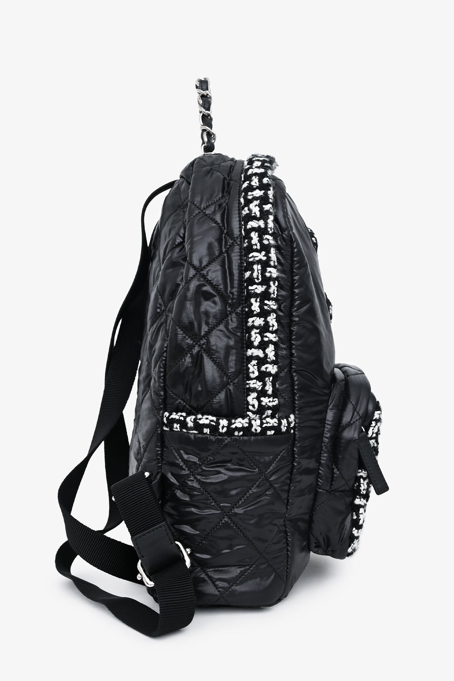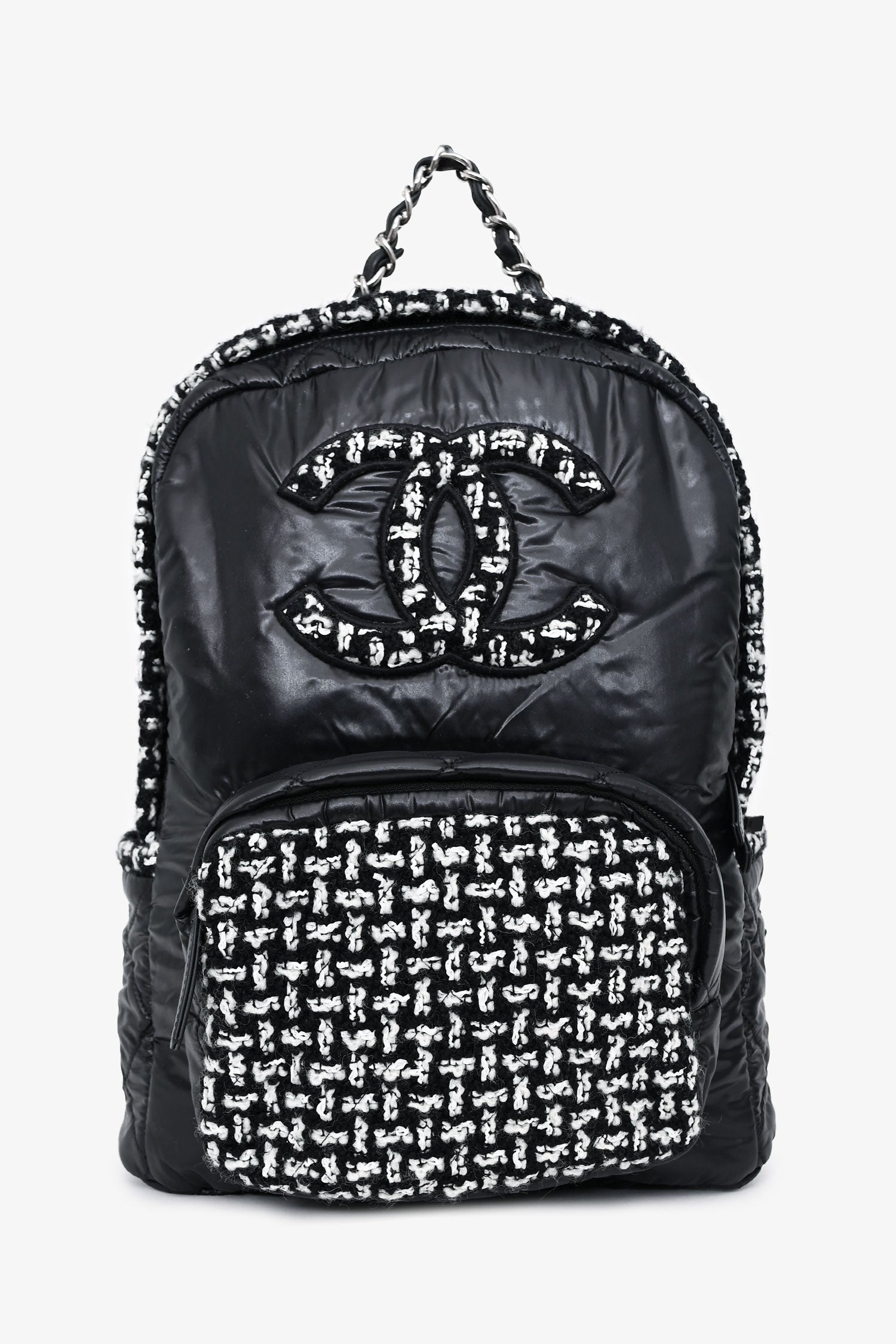 Pre-Loved Chanel™ 2020 Black Nylon/Tweed Backpack. Backpack zipper closure. Front pocket with zipper closure. Two side slip pockets. Signature Pre-Loved Chanel™ chain handle drop. Two over-the-shoulder backpack straps. Interior logo detailing. Interior pocket with zipper closure. Interior security strap with a lobster clasp. Silver-tone hardware. Tonal stitching.