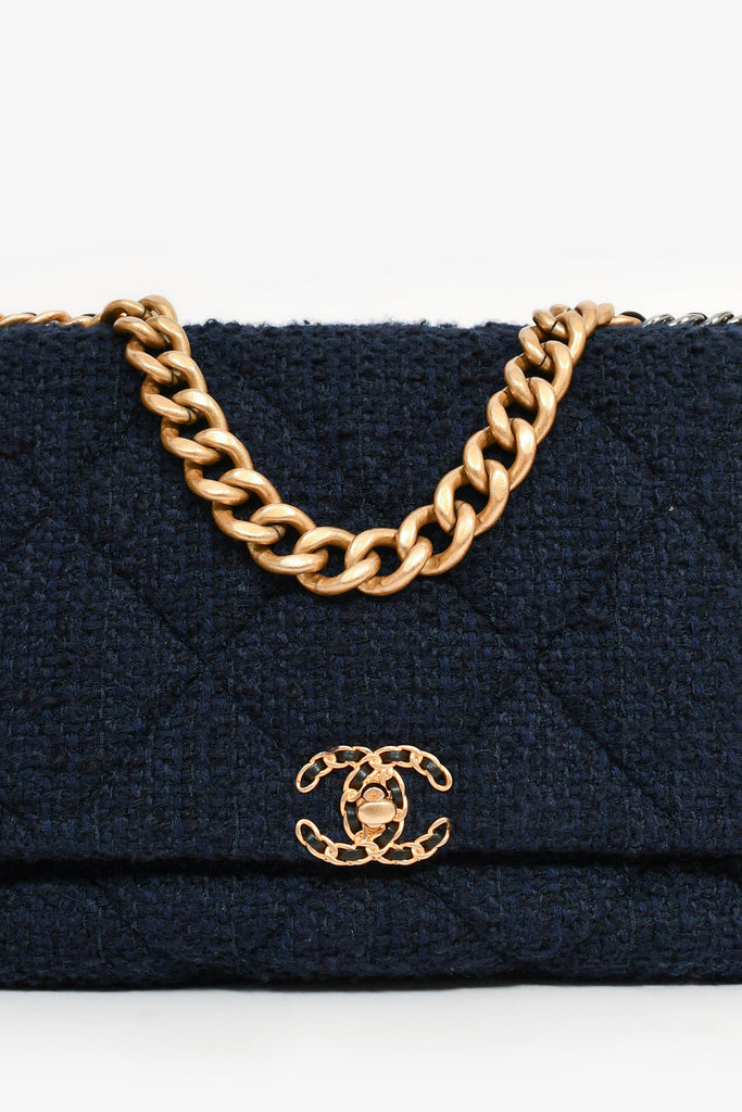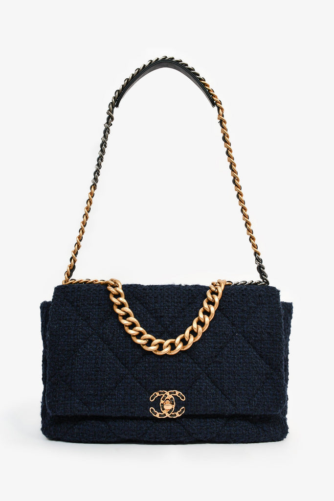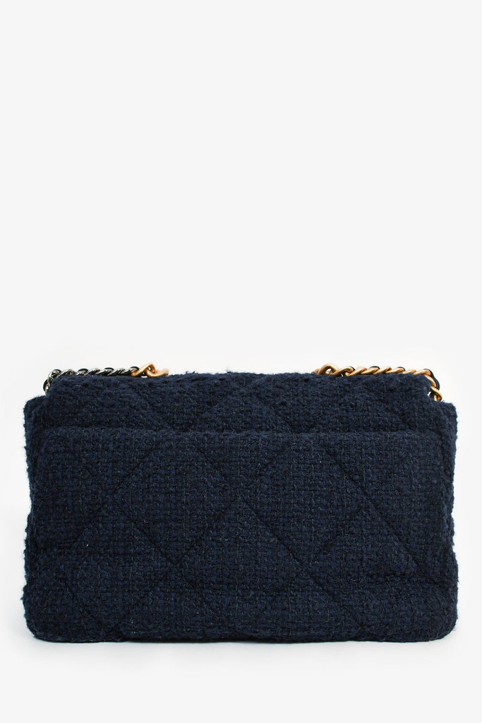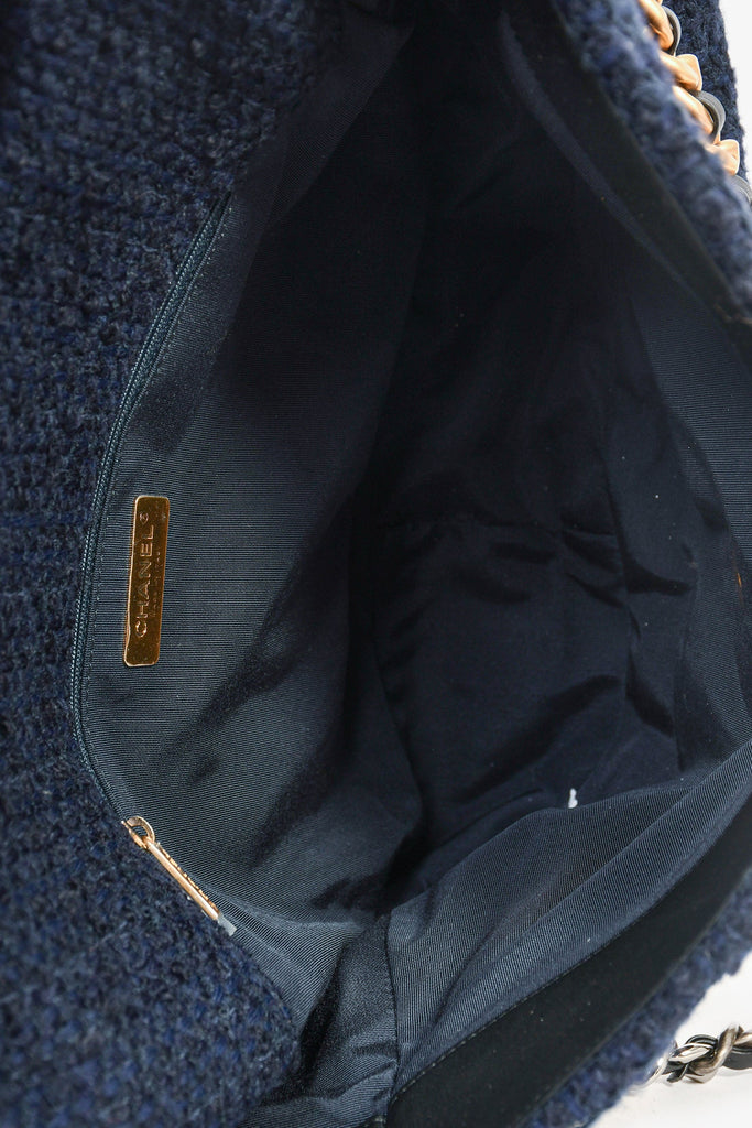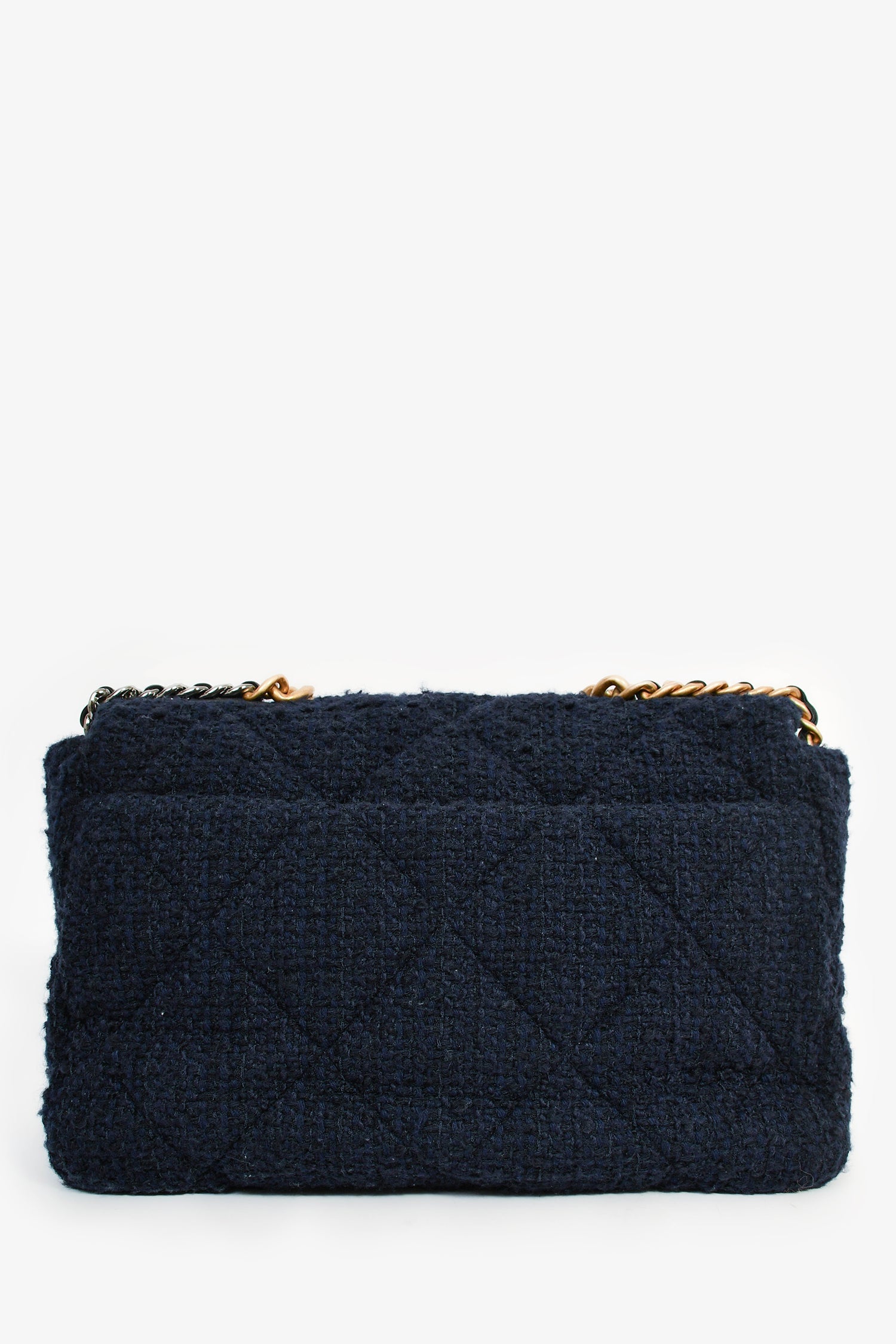 Pre-Loved Chanel™ 2020 Navy Tweed Large Chanel™ 19 Shoulder Bag. Front fold-over flap with turn-lock closure. Tonal textile interior lining. Single interior wall zip pocket. Duo-tone hardware. Exterior rear slip pocket.