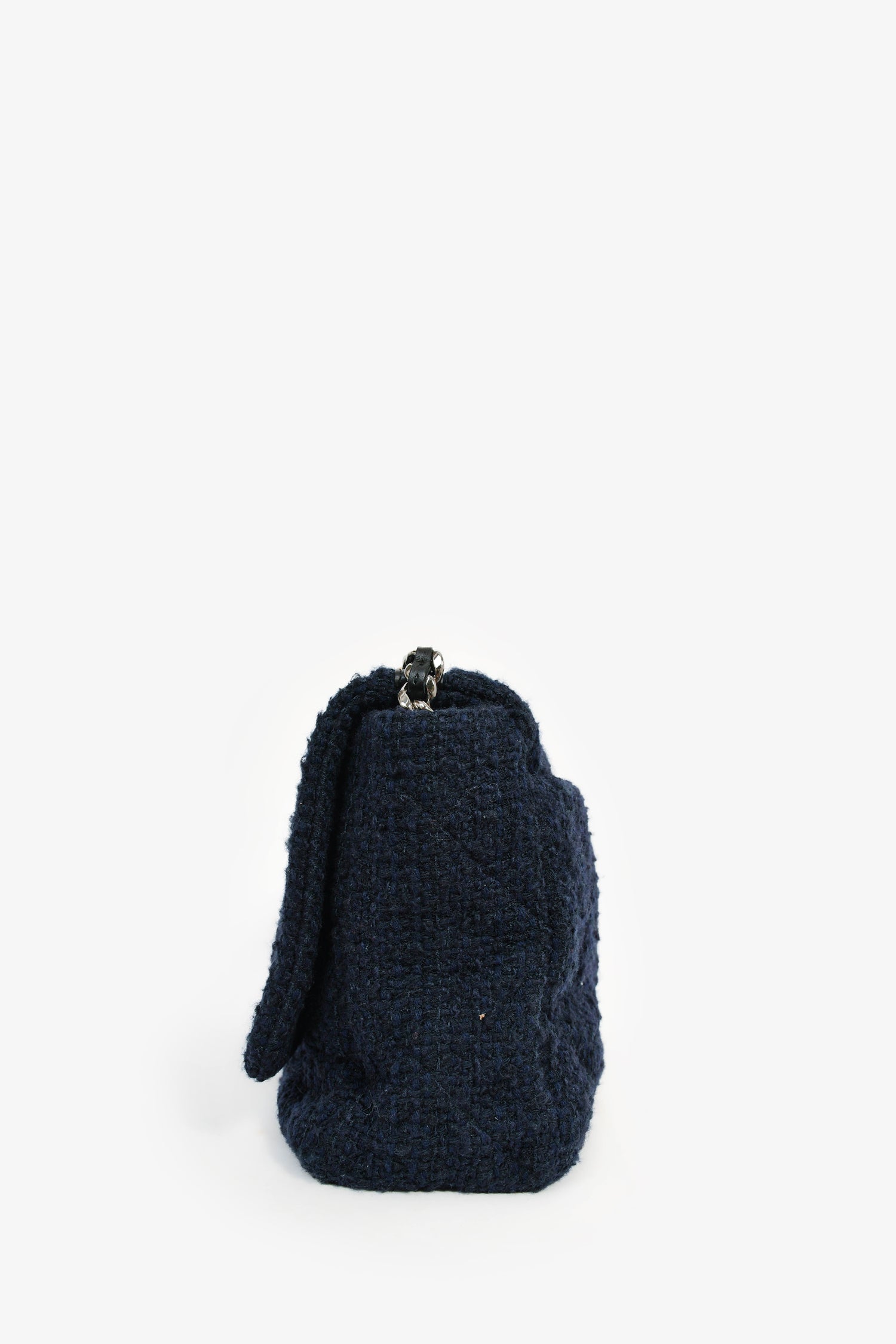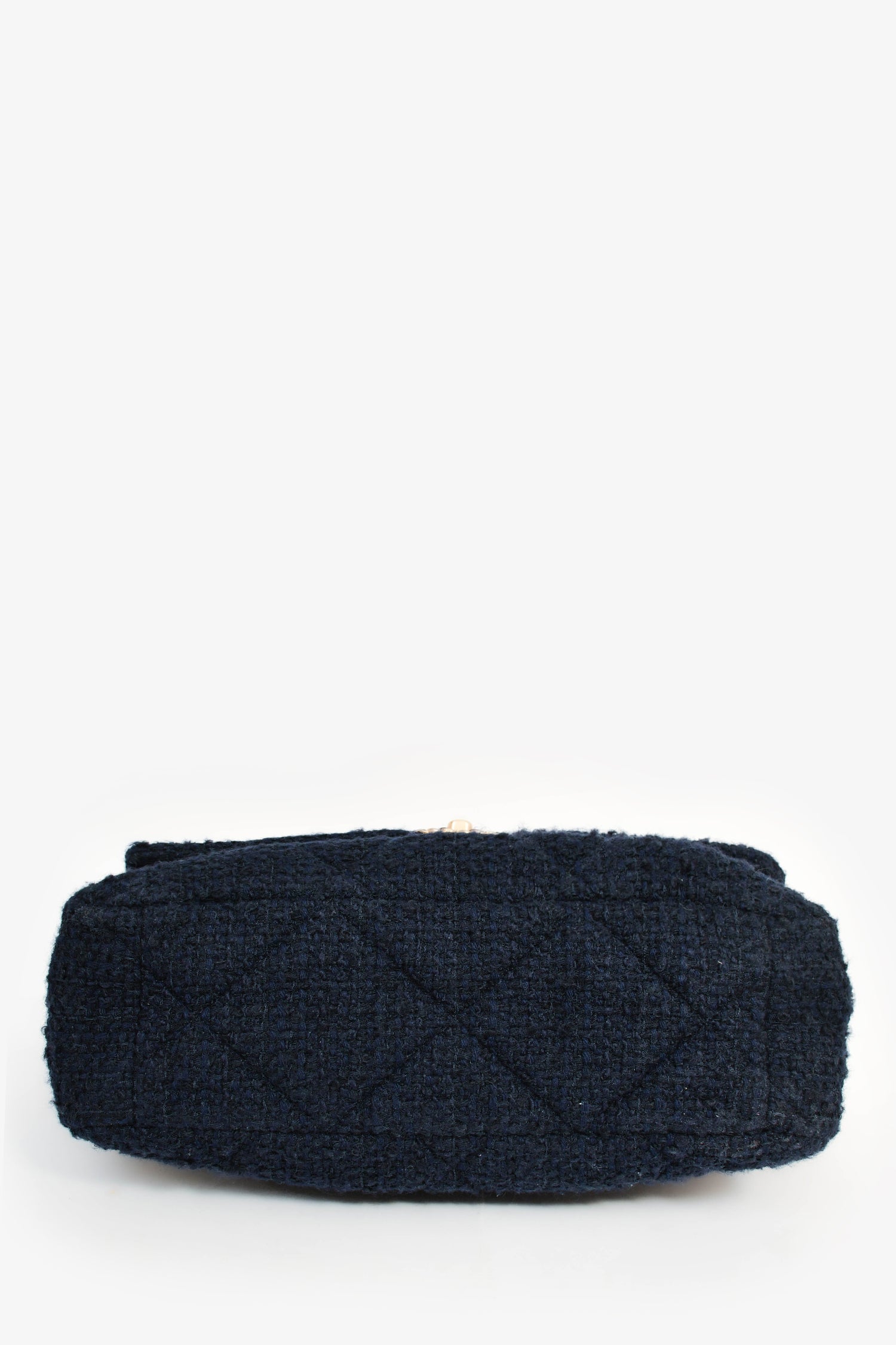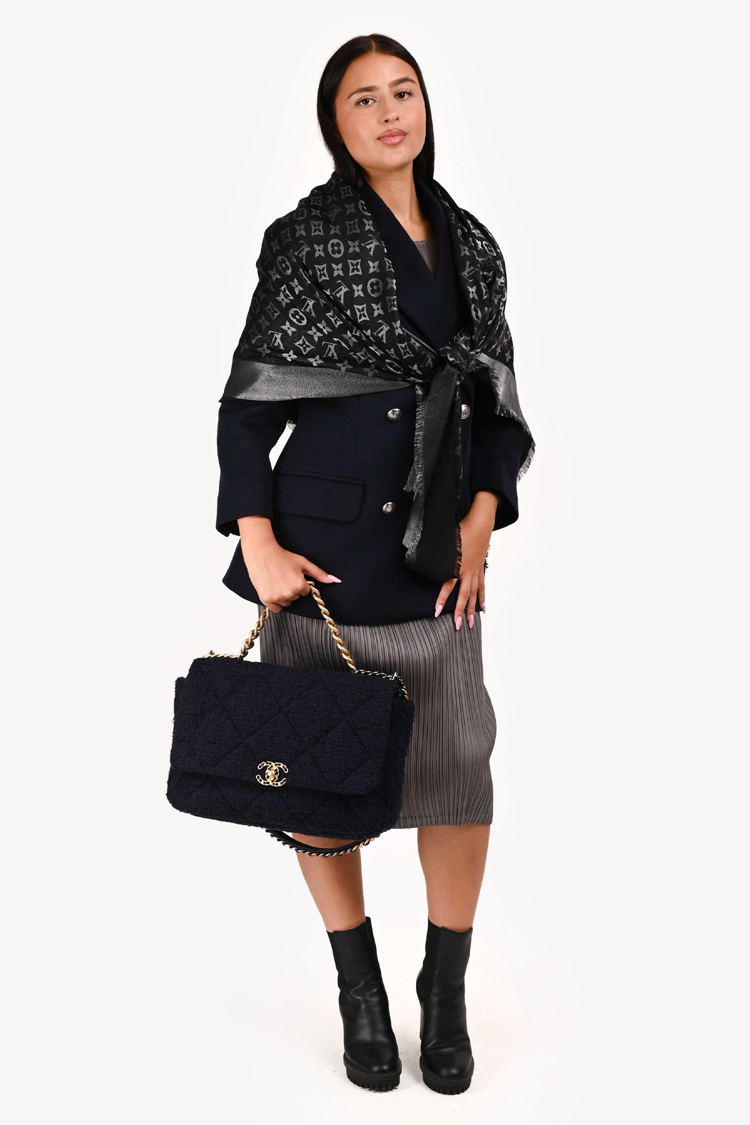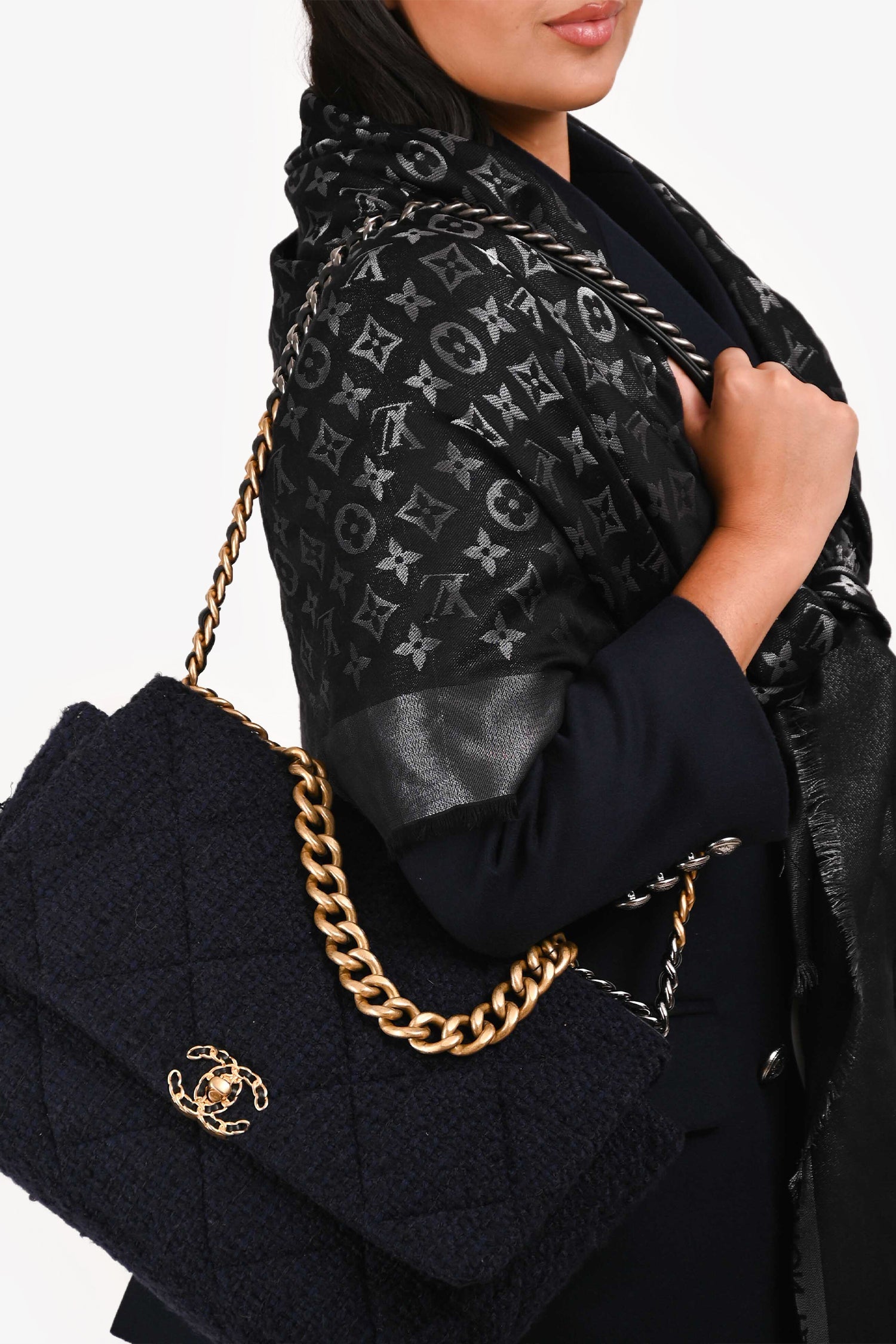Pre-Loved Chanel™ 2020 Navy Tweed Large Chanel™ 19 Shoulder Bag. Front fold-over flap with turn-lock closure. Tonal textile interior lining. Single interior wall zip pocket. Duo-tone hardware. Exterior rear slip pocket.