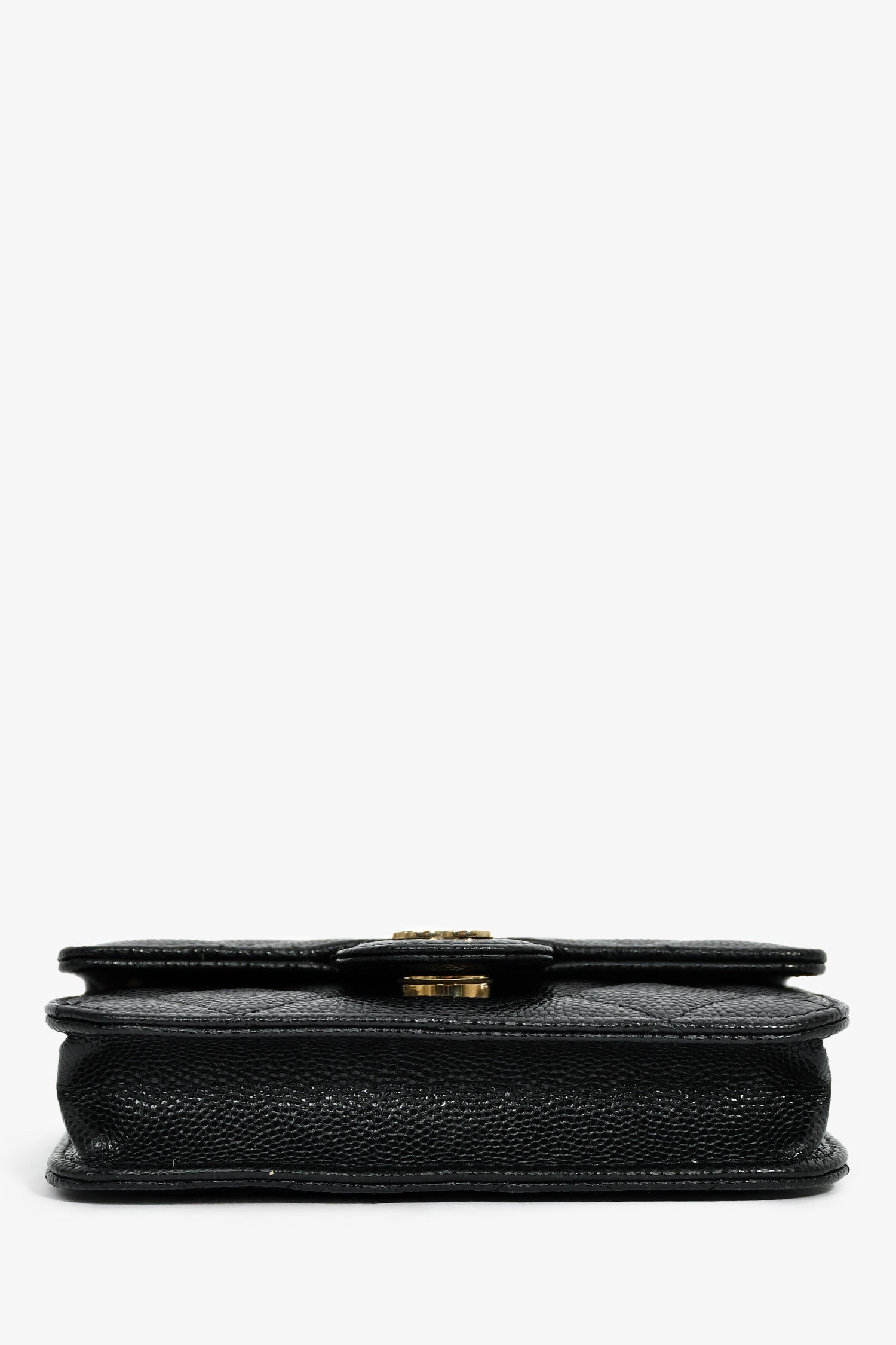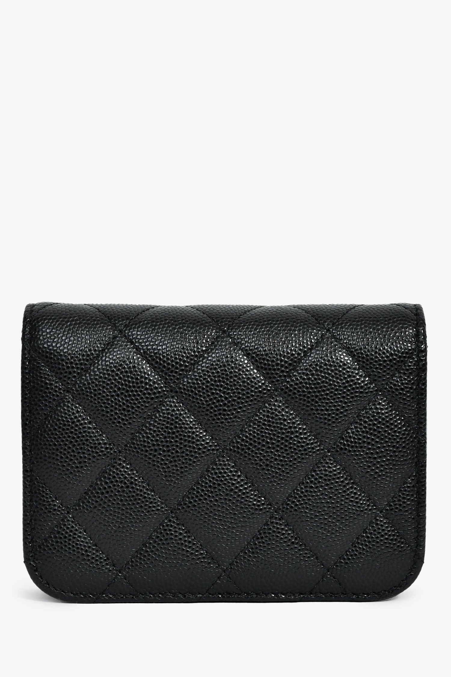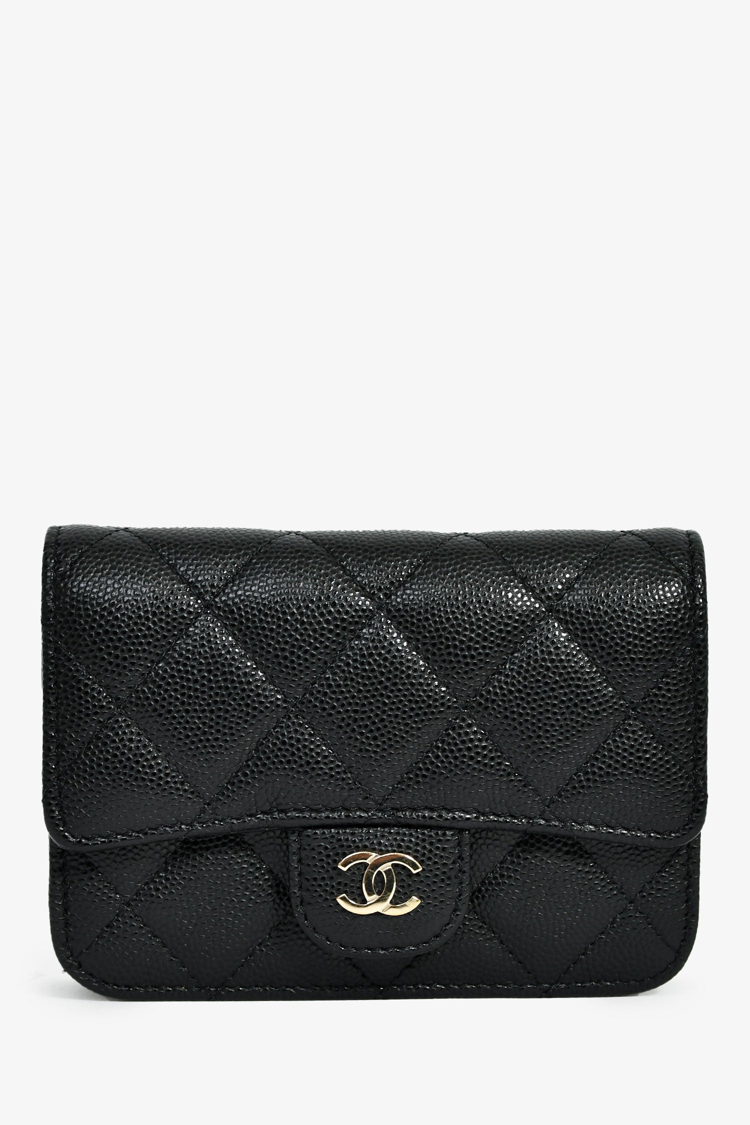 Pre-Loved Chanel™ 2021+ Black Caviar Leather Small Flap Card Holder On Chain Champagne Hardware. Front fold-over flap with magnetic button closure. Attached chain-link strap (not adjustable). Lined interior. Open interior. Tonal stitching.