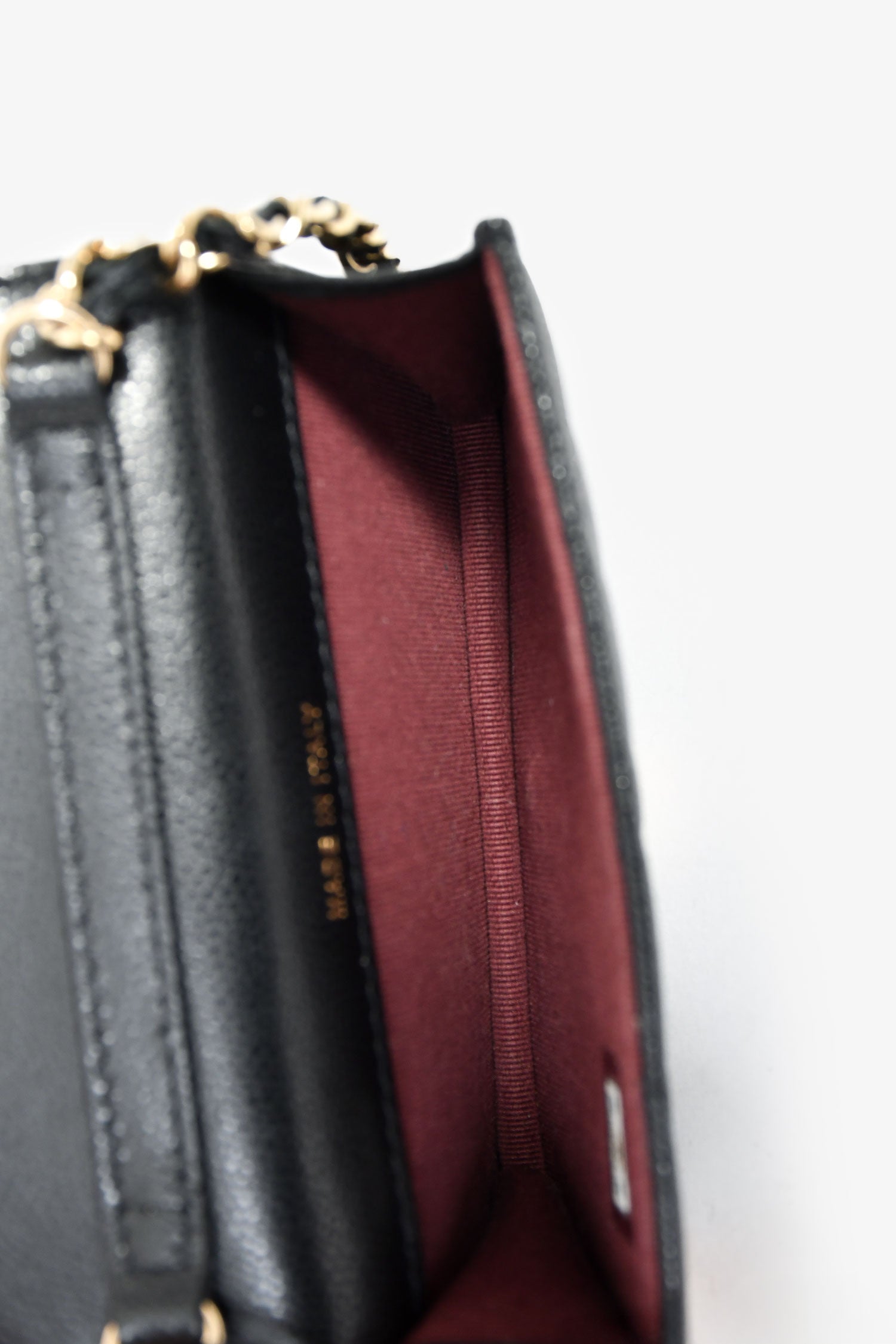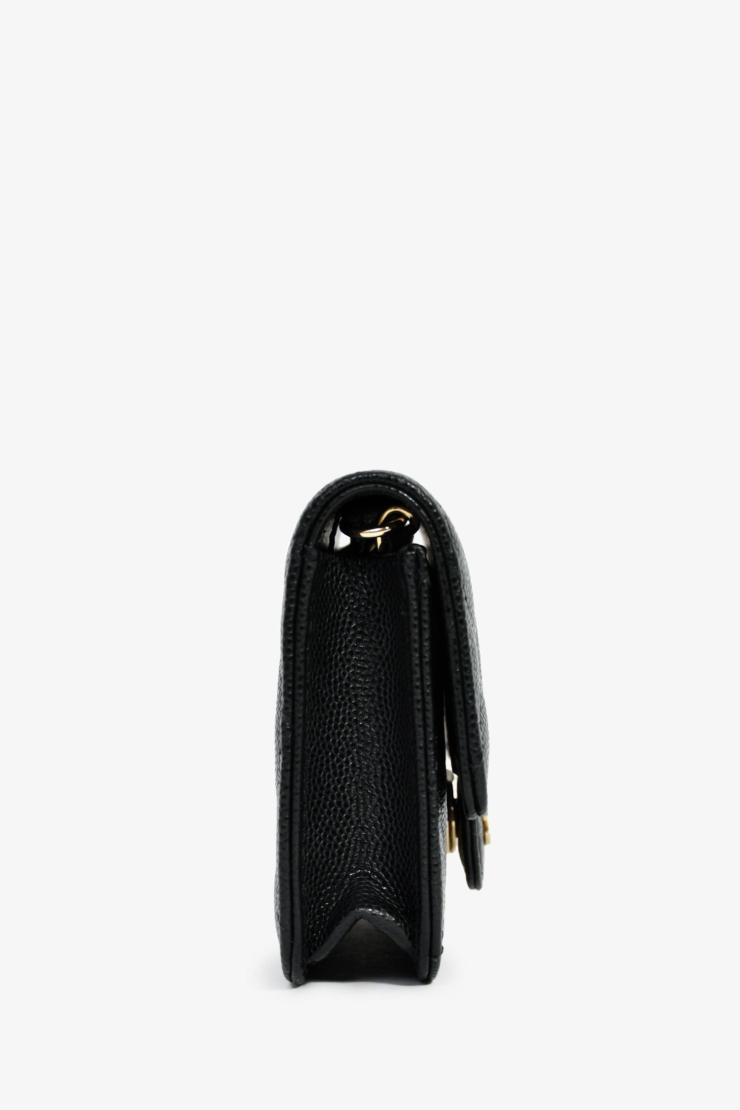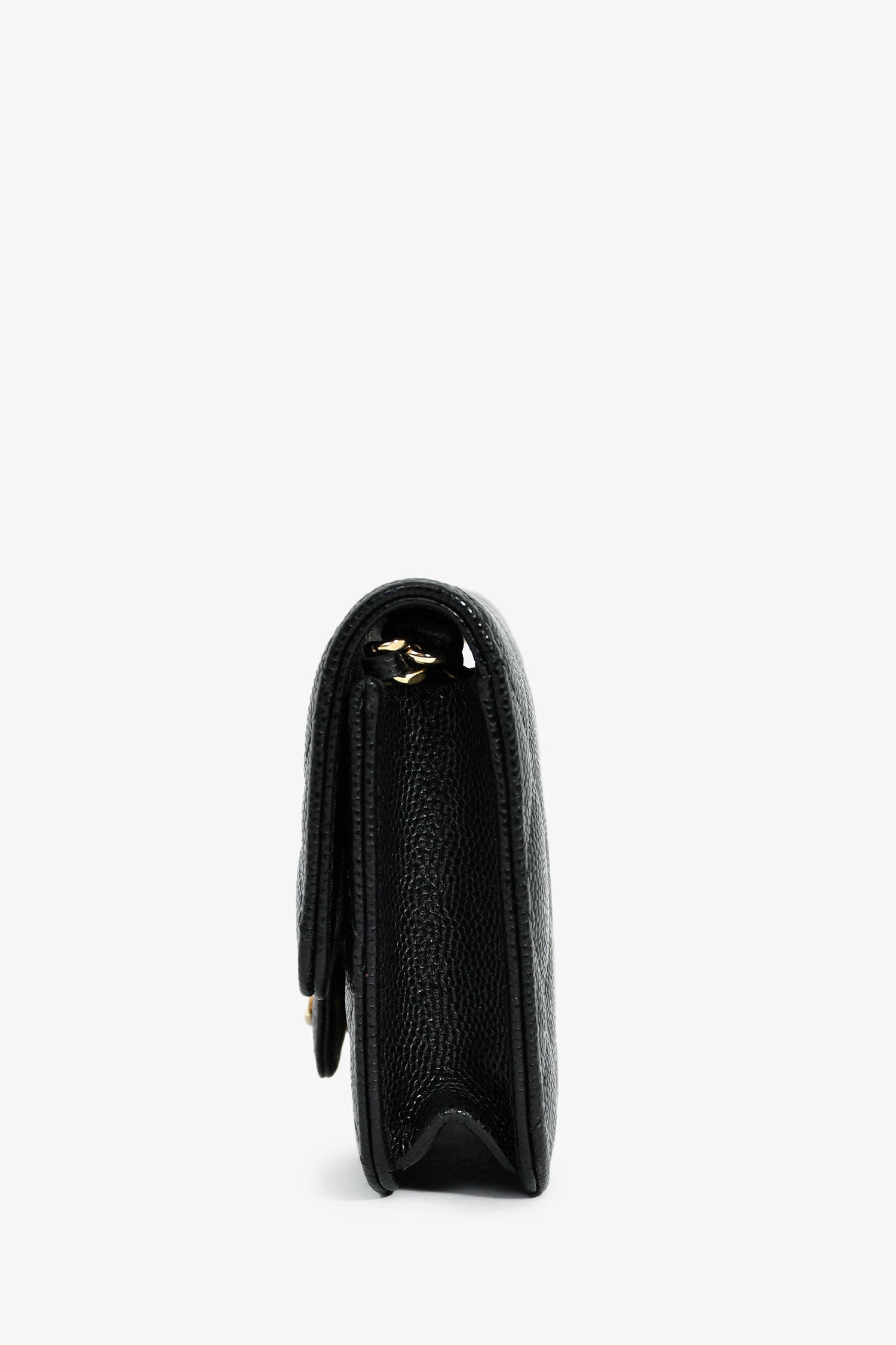 Pre-Loved Chanel™ 2021+ Black Caviar Leather Small Flap Card Holder On Chain Champagne Hardware. Front fold-over flap with magnetic button closure. Attached chain-link strap (not adjustable). Lined interior. Open interior. Tonal stitching.