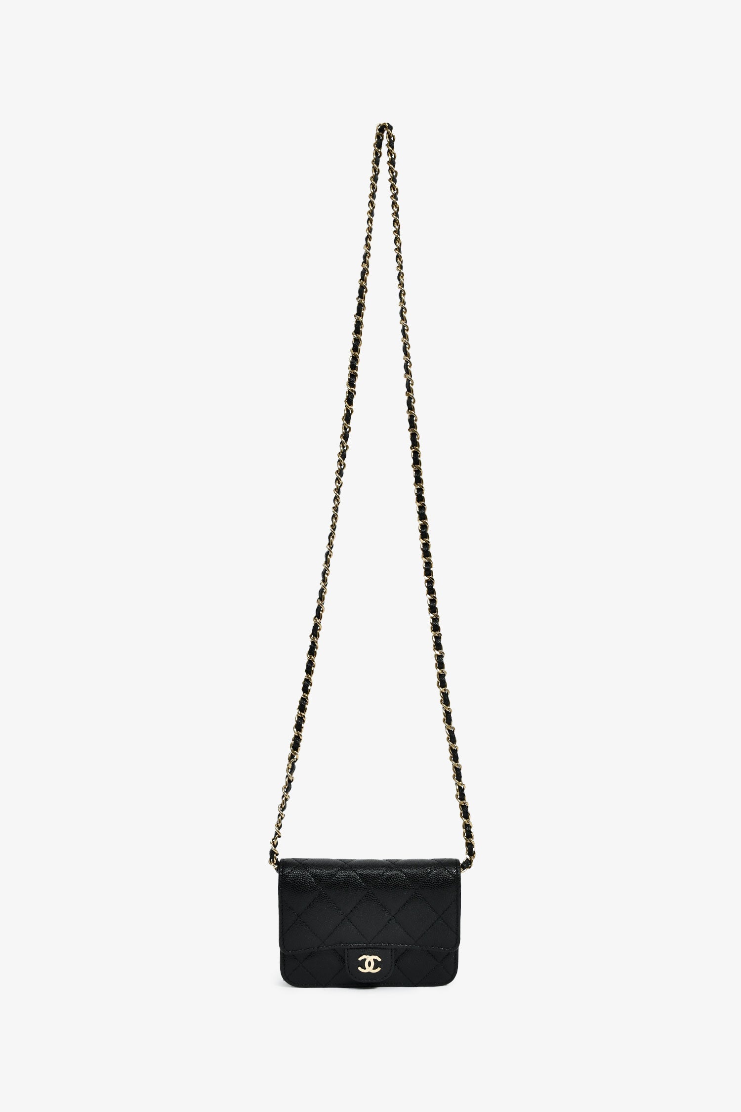 Pre-Loved Chanel™ 2021+ Black Caviar Leather Small Flap Card Holder On Chain Champagne Hardware