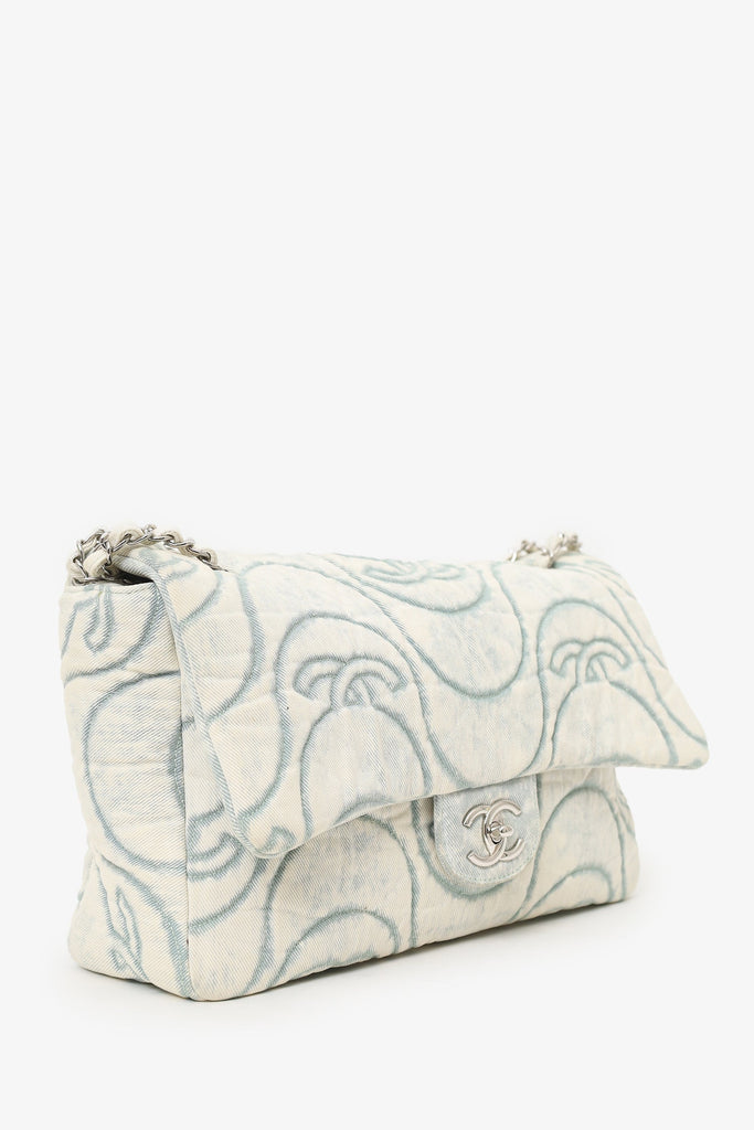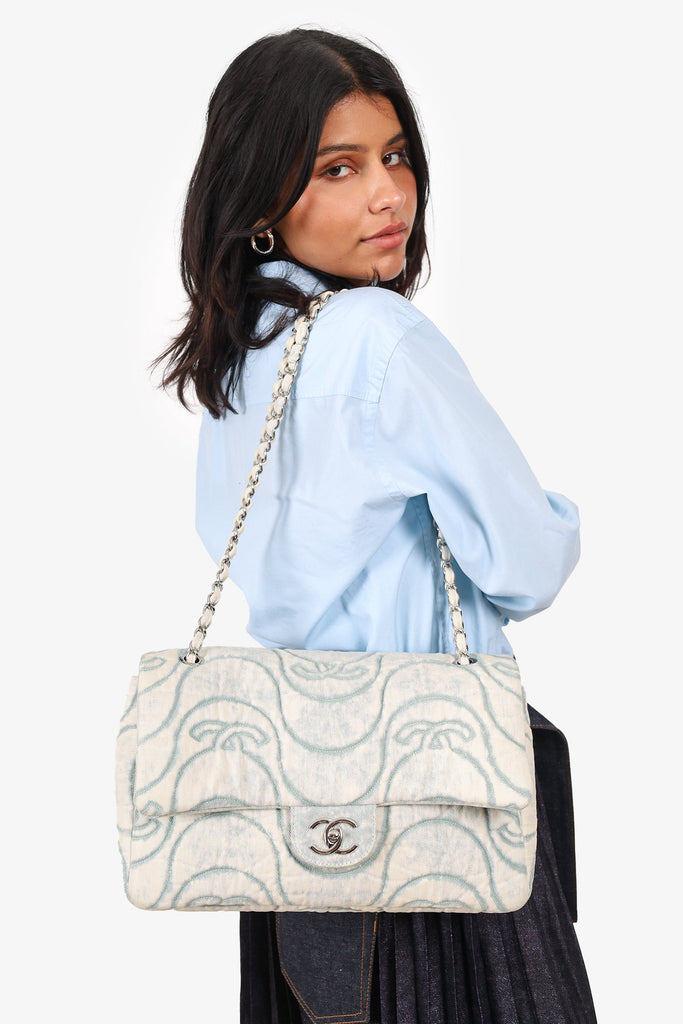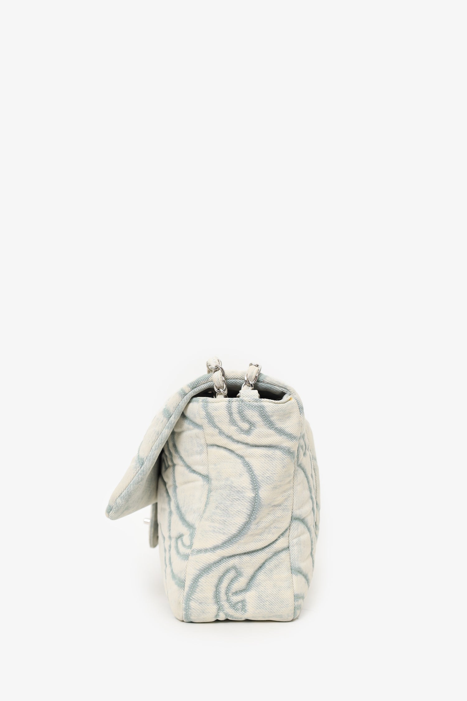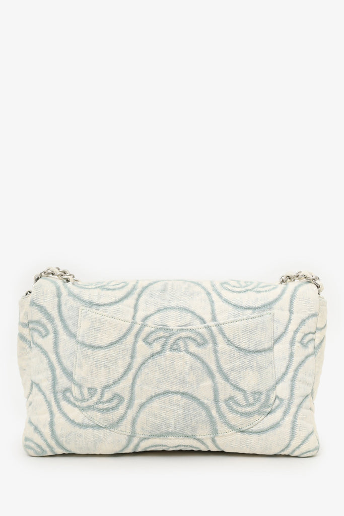 Pre-Loved Chanel™ 2021 Blue Denim Wave Jumbo Flap Bag. Fold-over flap with turn-lock closure. Single exterior rear pocket.  Denim interior. 3 interior slip pockets; 2 at front wall and 1 at rear. Silver-tone hardware. Tonal stitching.