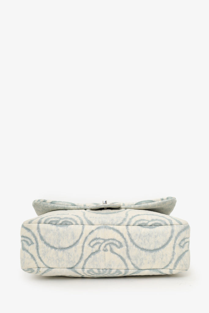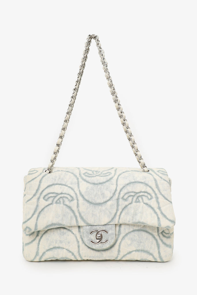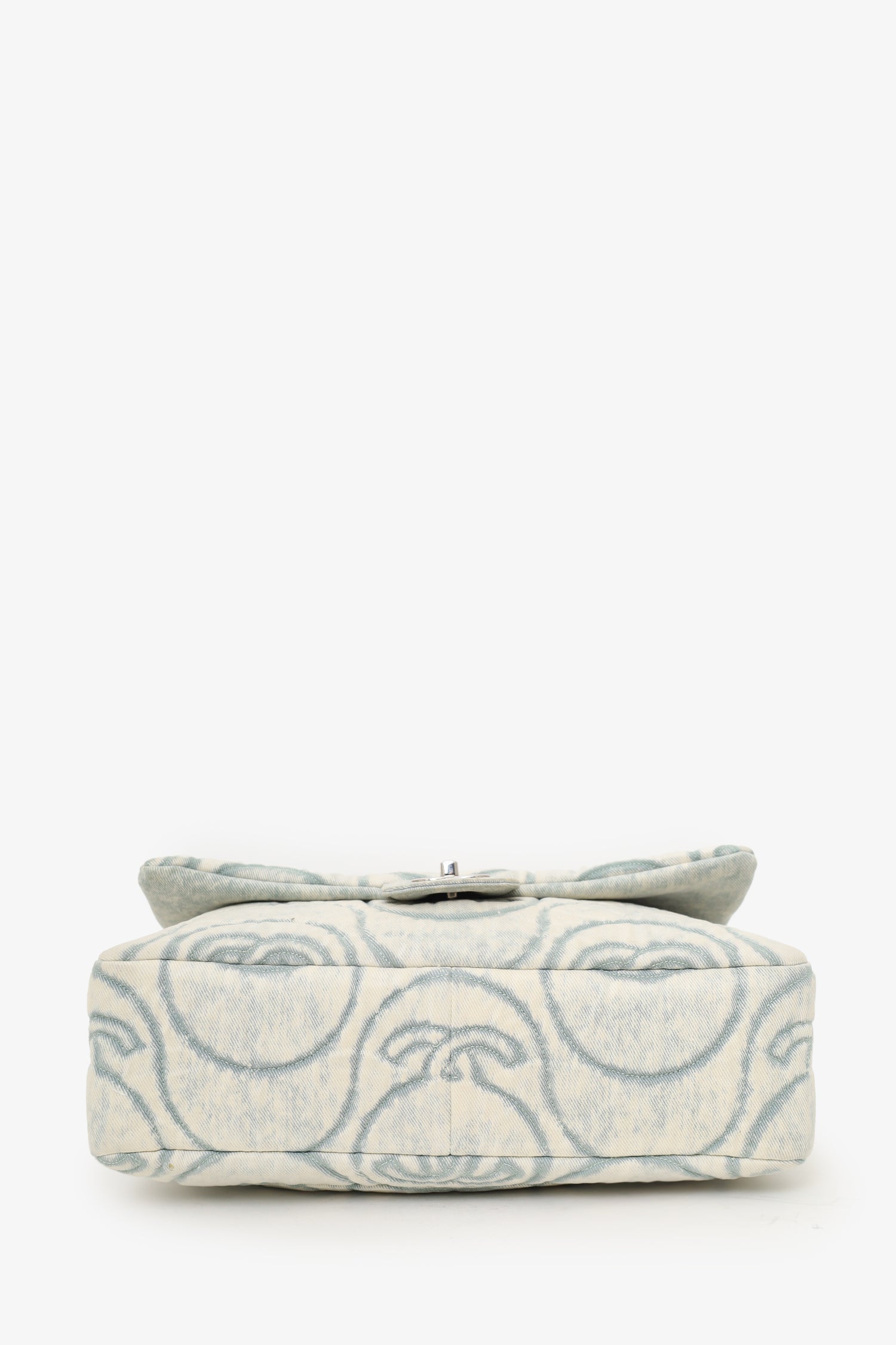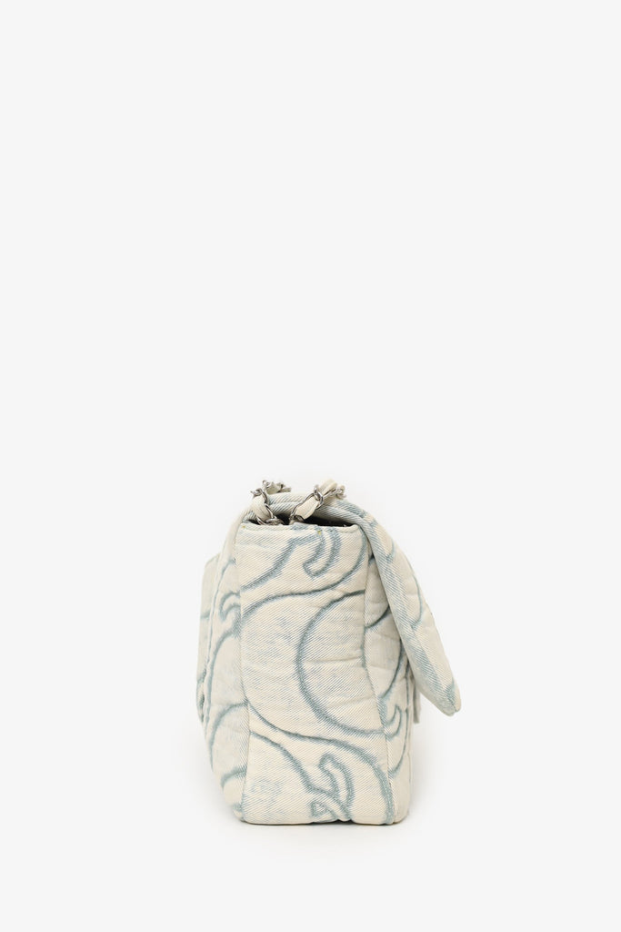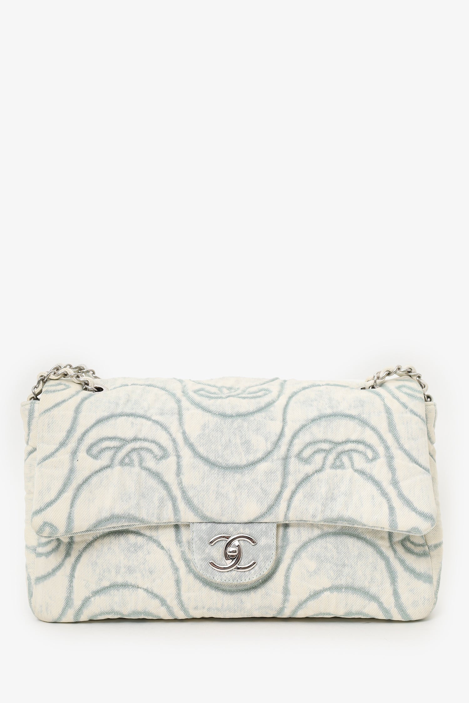 Pre-Loved Chanel™ 2021 Blue Denim Wave Jumbo Flap Bag. Fold-over flap with turn-lock closure. Single exterior rear pocket.  Denim interior. 3 interior slip pockets; 2 at front wall and 1 at rear. Silver-tone hardware. Tonal stitching.