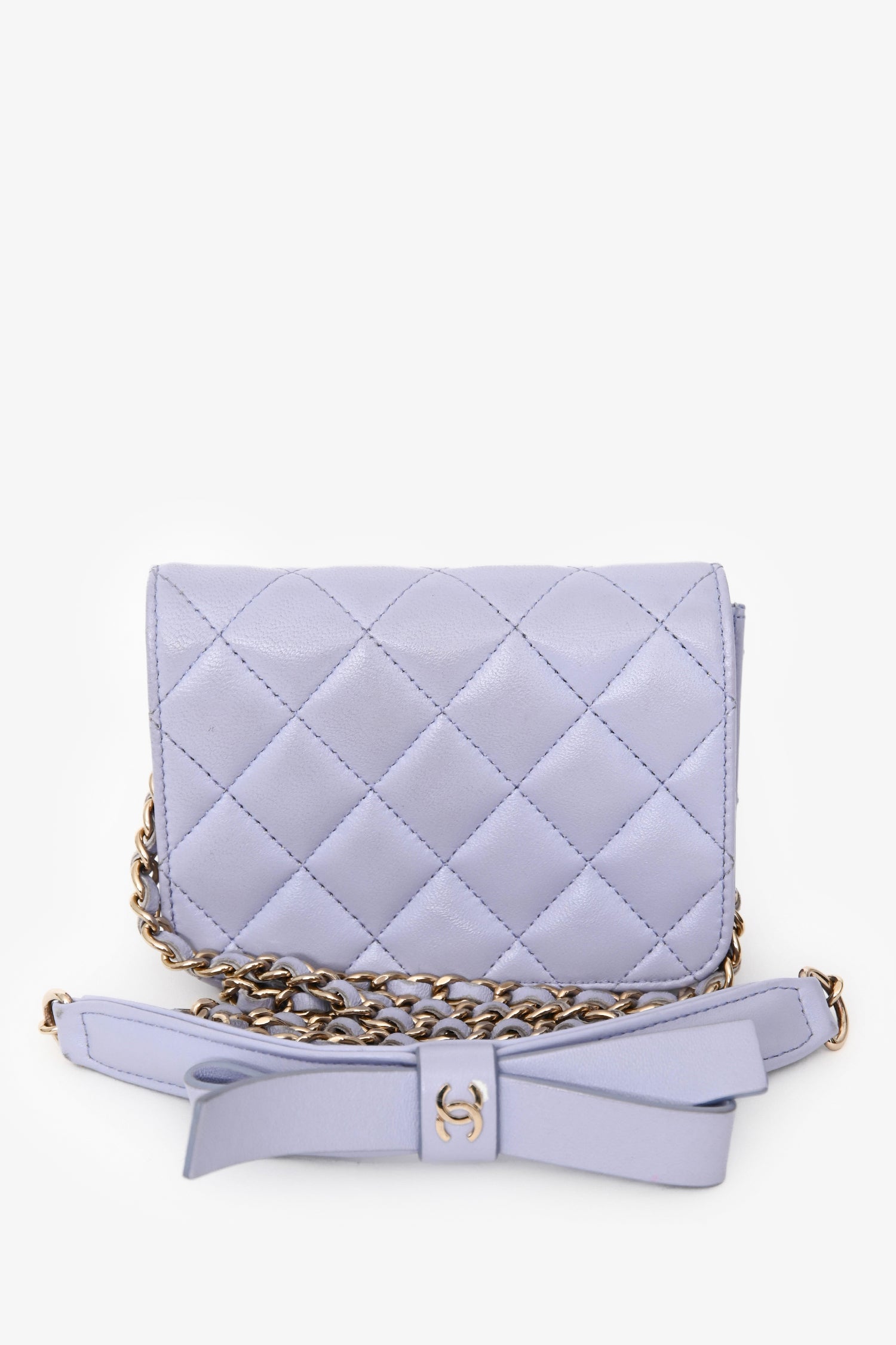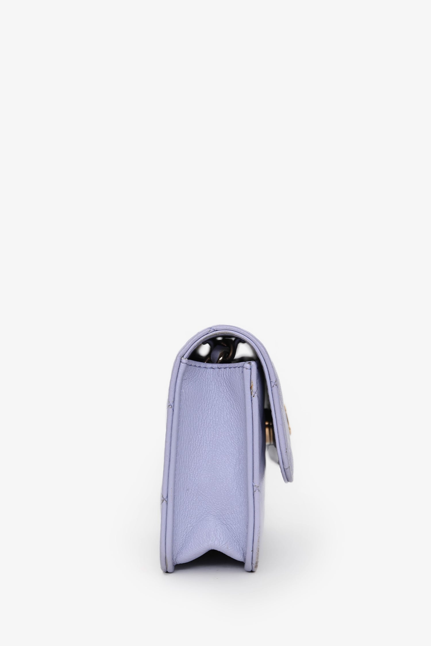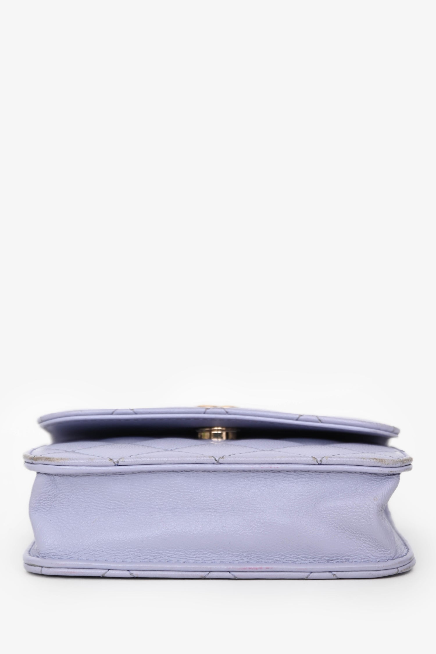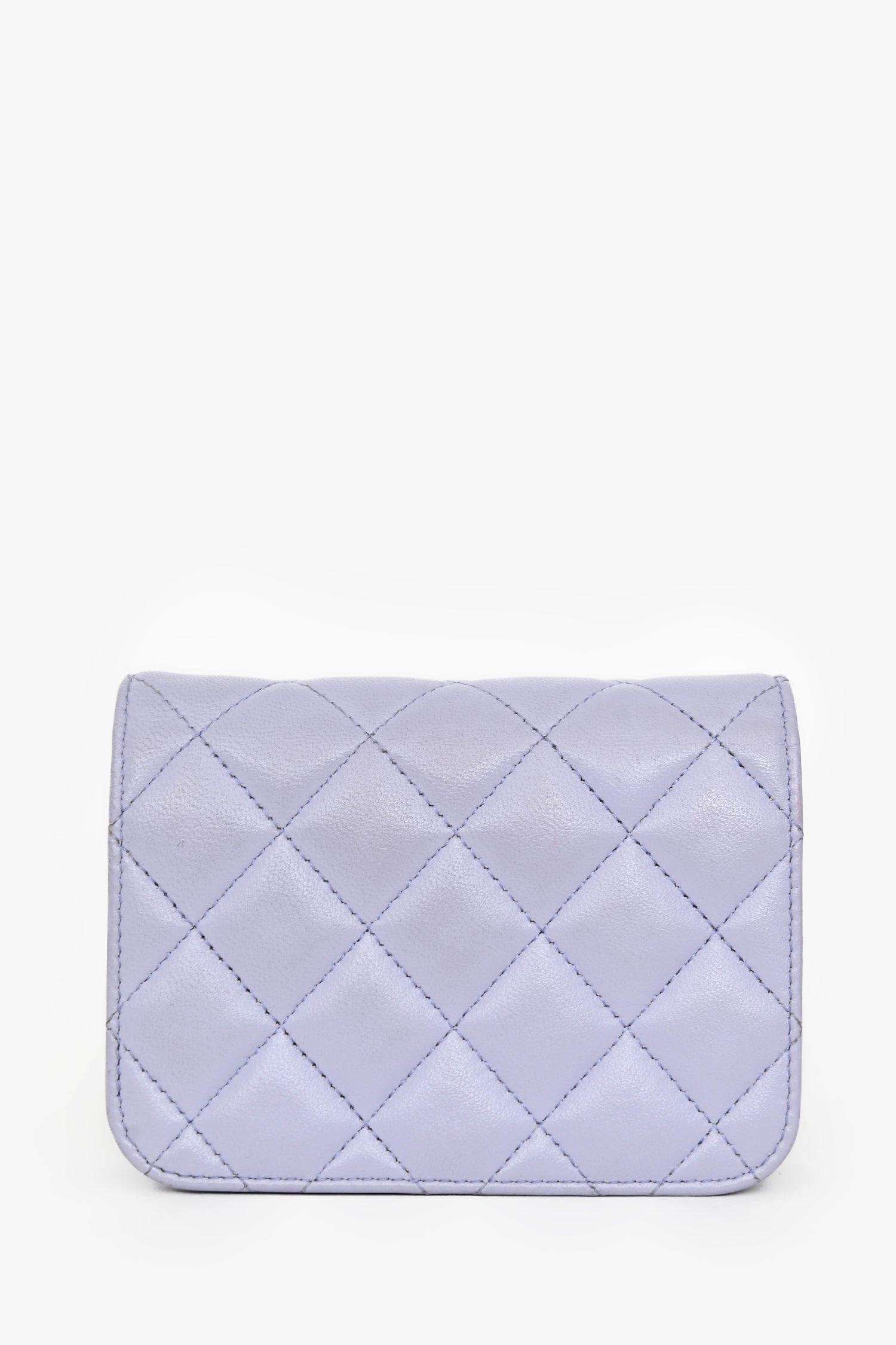 Pre-Loved Chanel™ 2021 Purple Lambskin Leather Mini Flap Crossbody Bag. Front fold-over flap with magnetic button closure. Open lined interior. Gold-tone hardware. Tonal stitching.