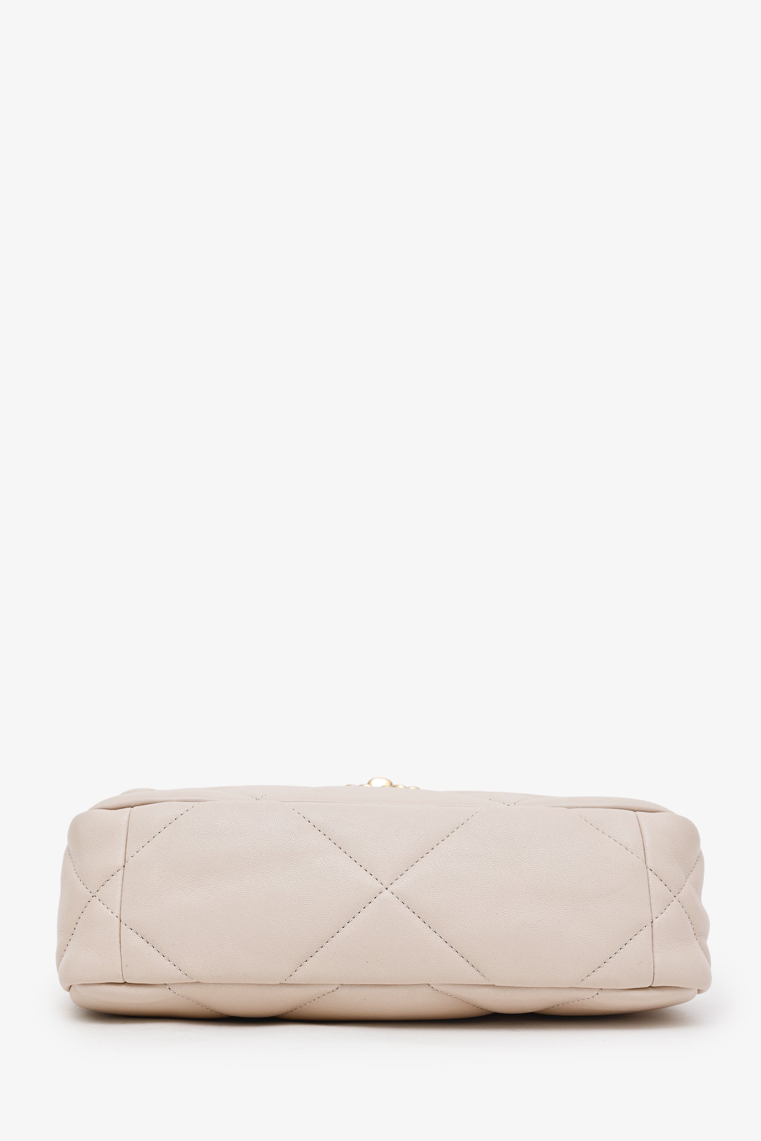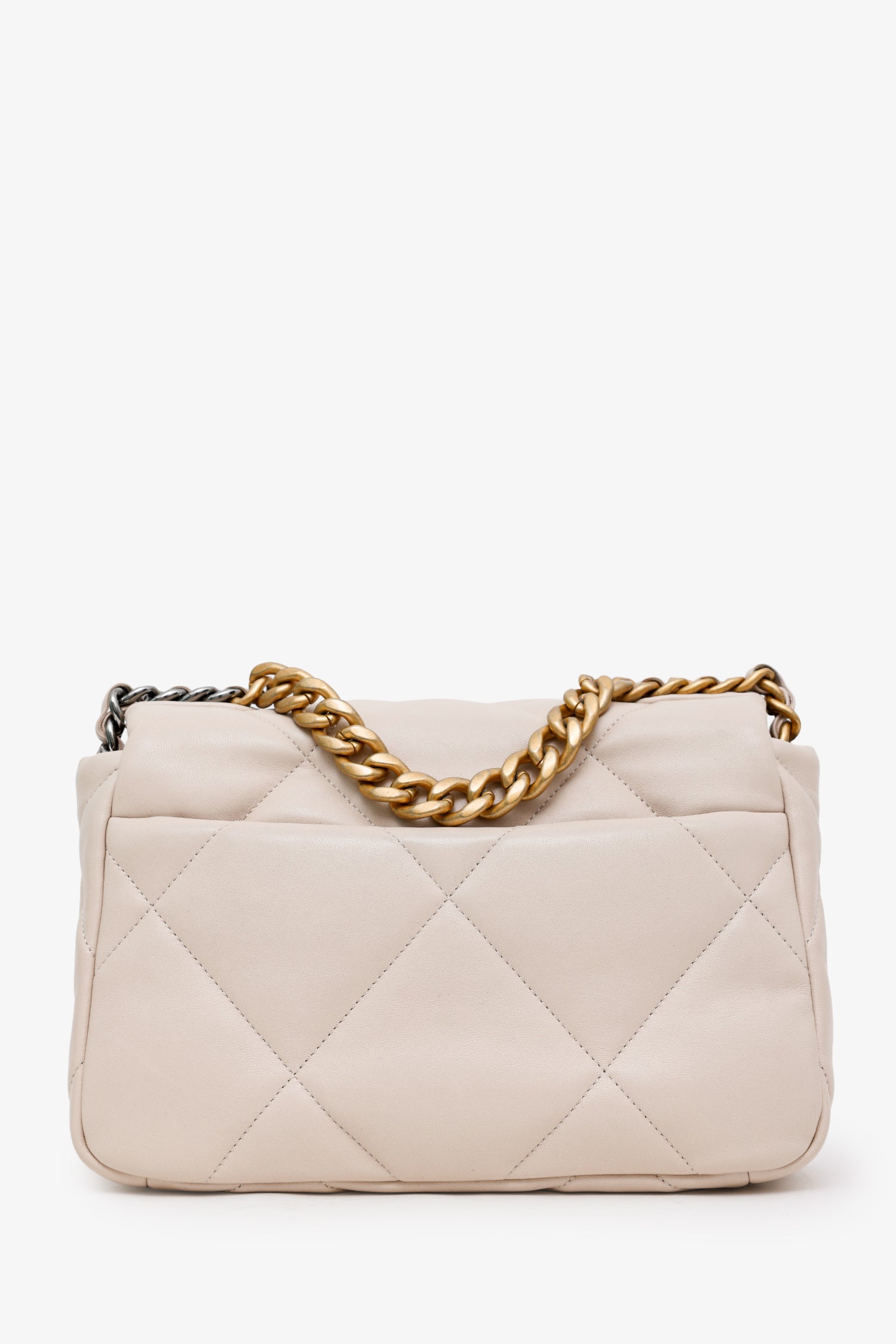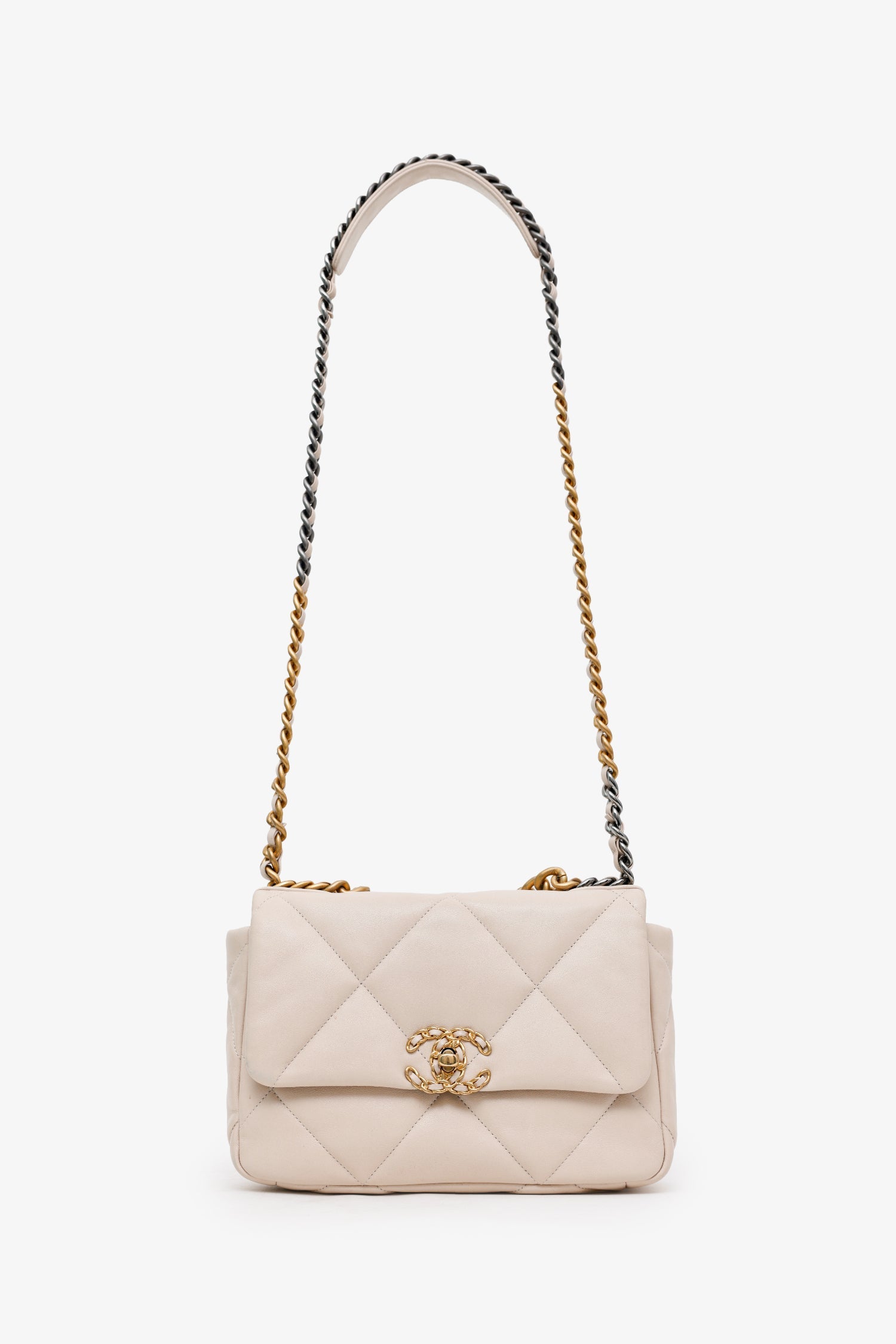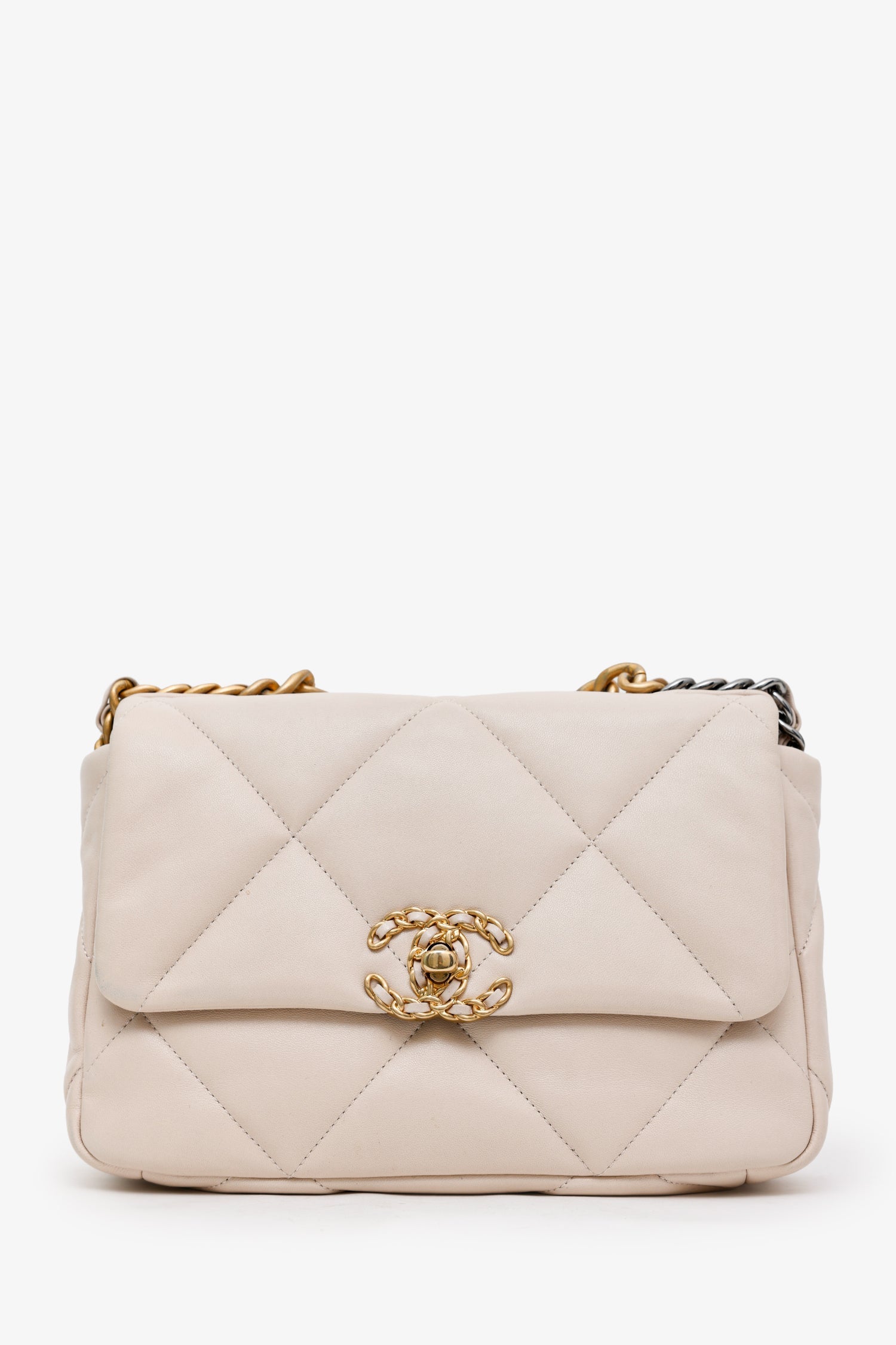 Pre-Loved Chanel™ 2022 Beige Goatskin Leather 'Chanel 19' Small Flap Shoulder Bag. Front fold-over flap with turn-lock closure. Chain link top handle and crossbody strap. Single exterior rear snap-button-up pocket. Open-lined interior with single zip pocket. Gunmetal and silver-tone hardware. Tonal stitching.