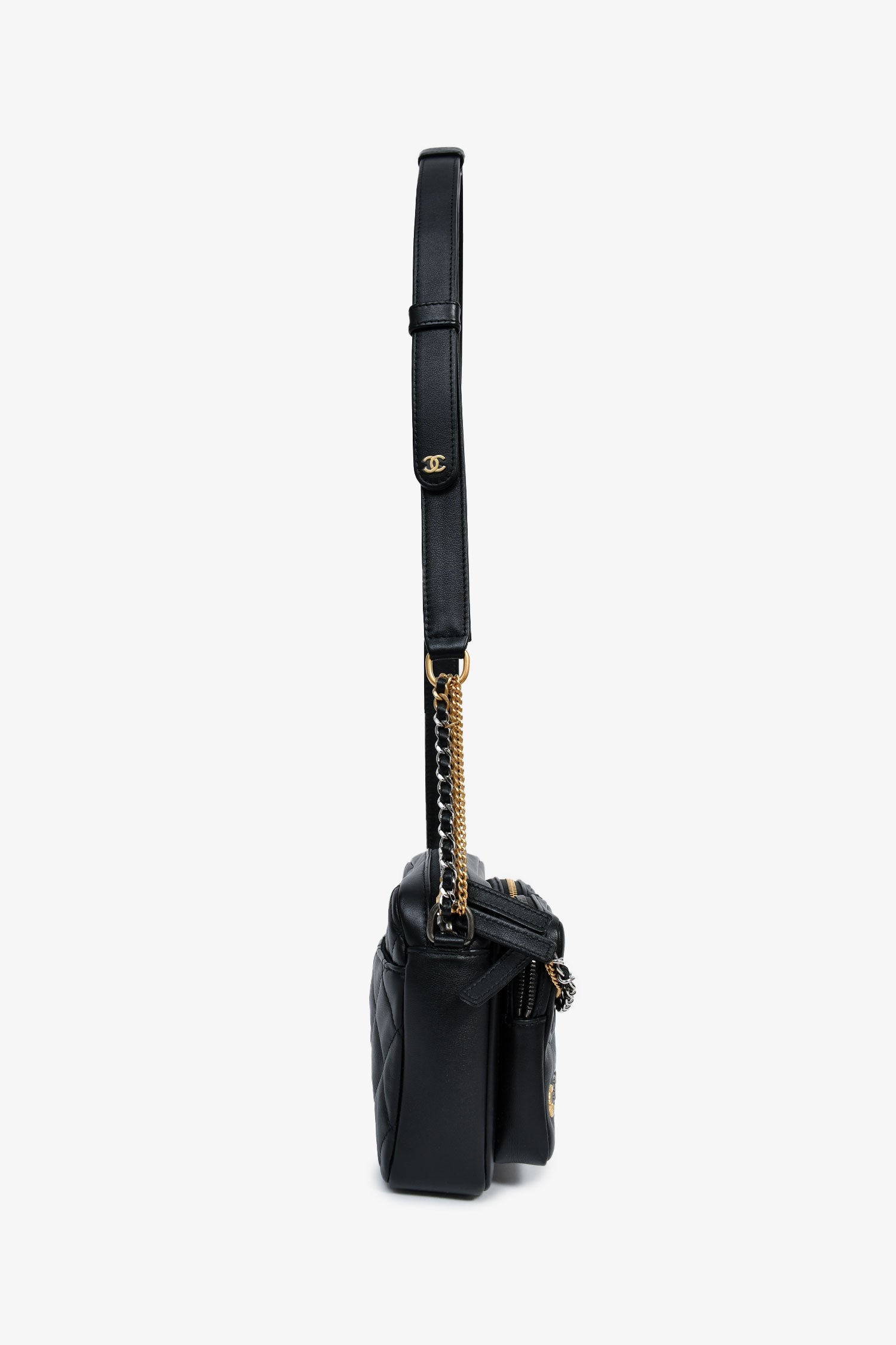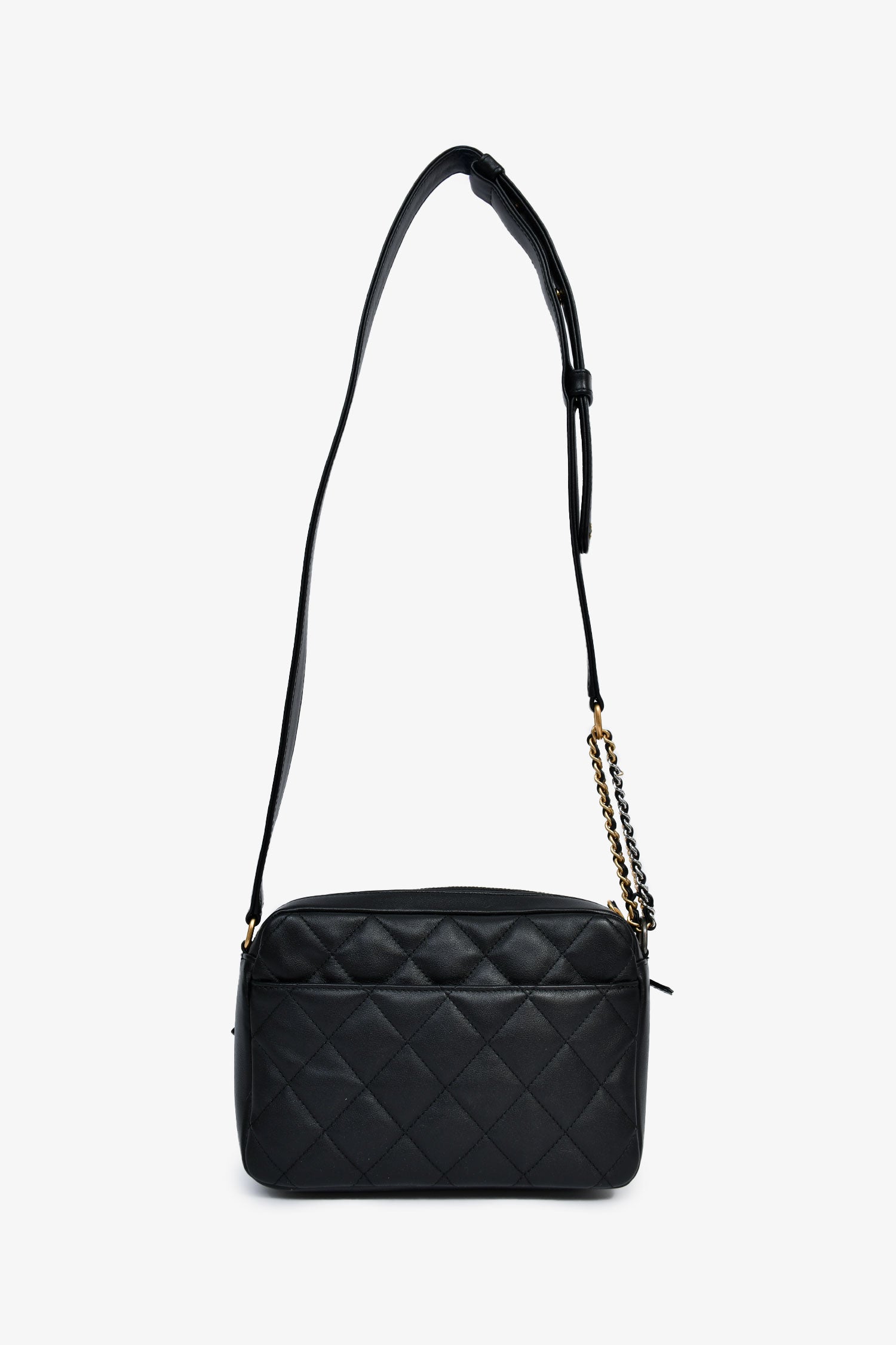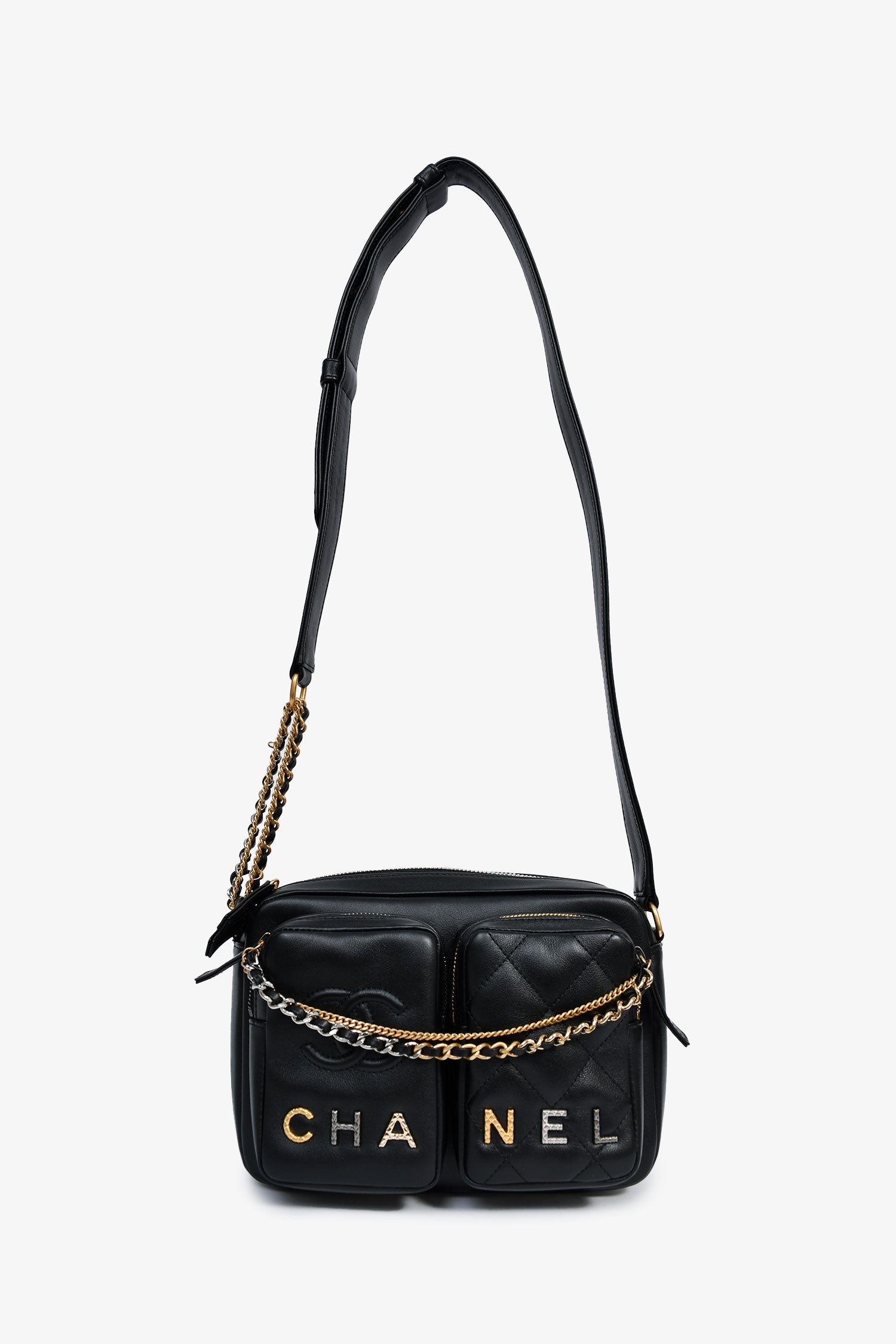 Pre-Loved Chanel™ 2022 Black Leather Chain Detail Camera Bag. Top zipper closure. Two front exterior zip pouches. Interior compartment with two slip wall pockets. Adjustable strap. Textile lining. Two-tone hardware. Tonal stitching.